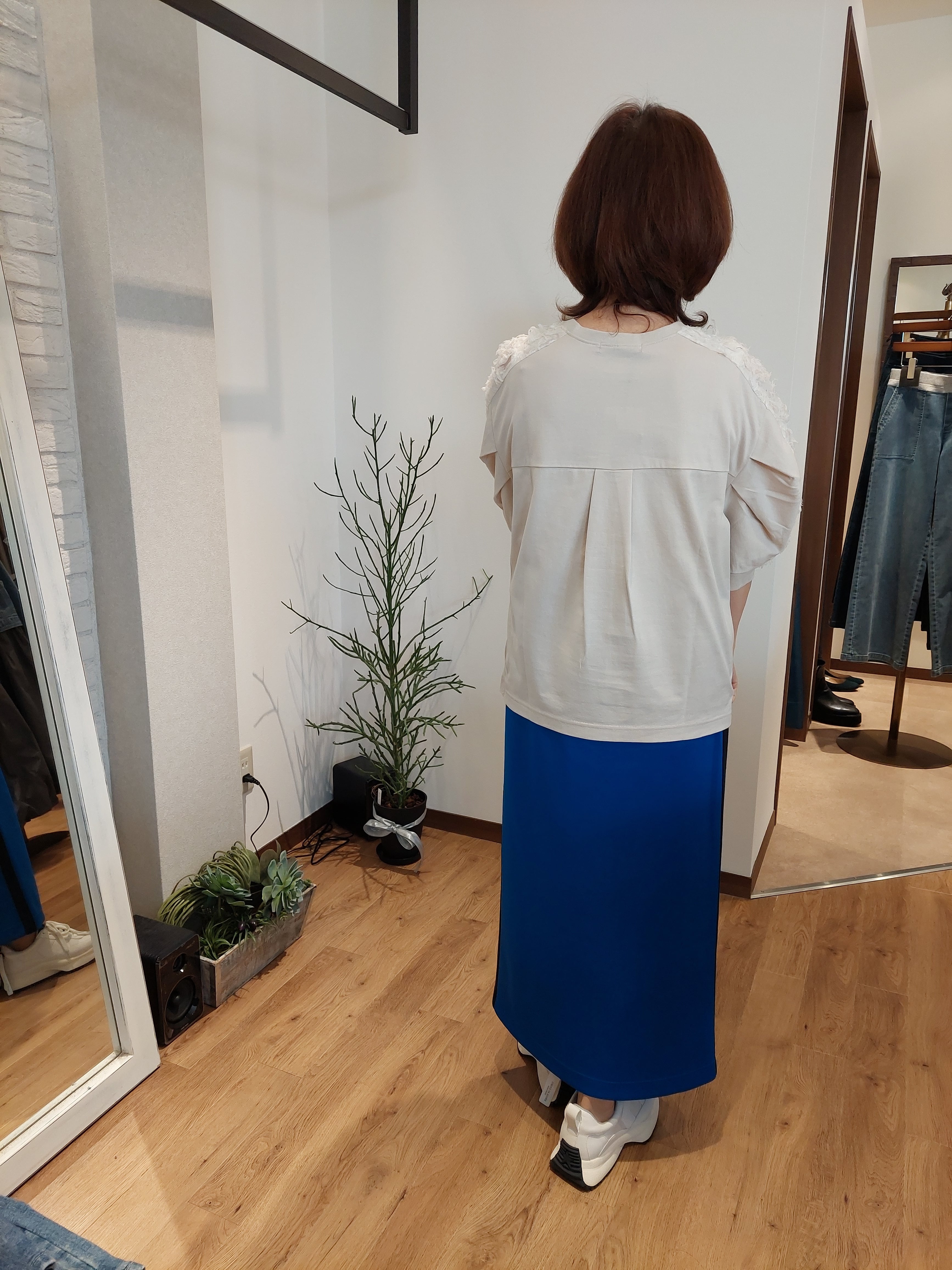 肌当たりの良いしっとりとした滑らかなタッチで、上品な光沢感と程よい肉感のマーセライズ天竺生地と立体感のあるジャガード生地。
