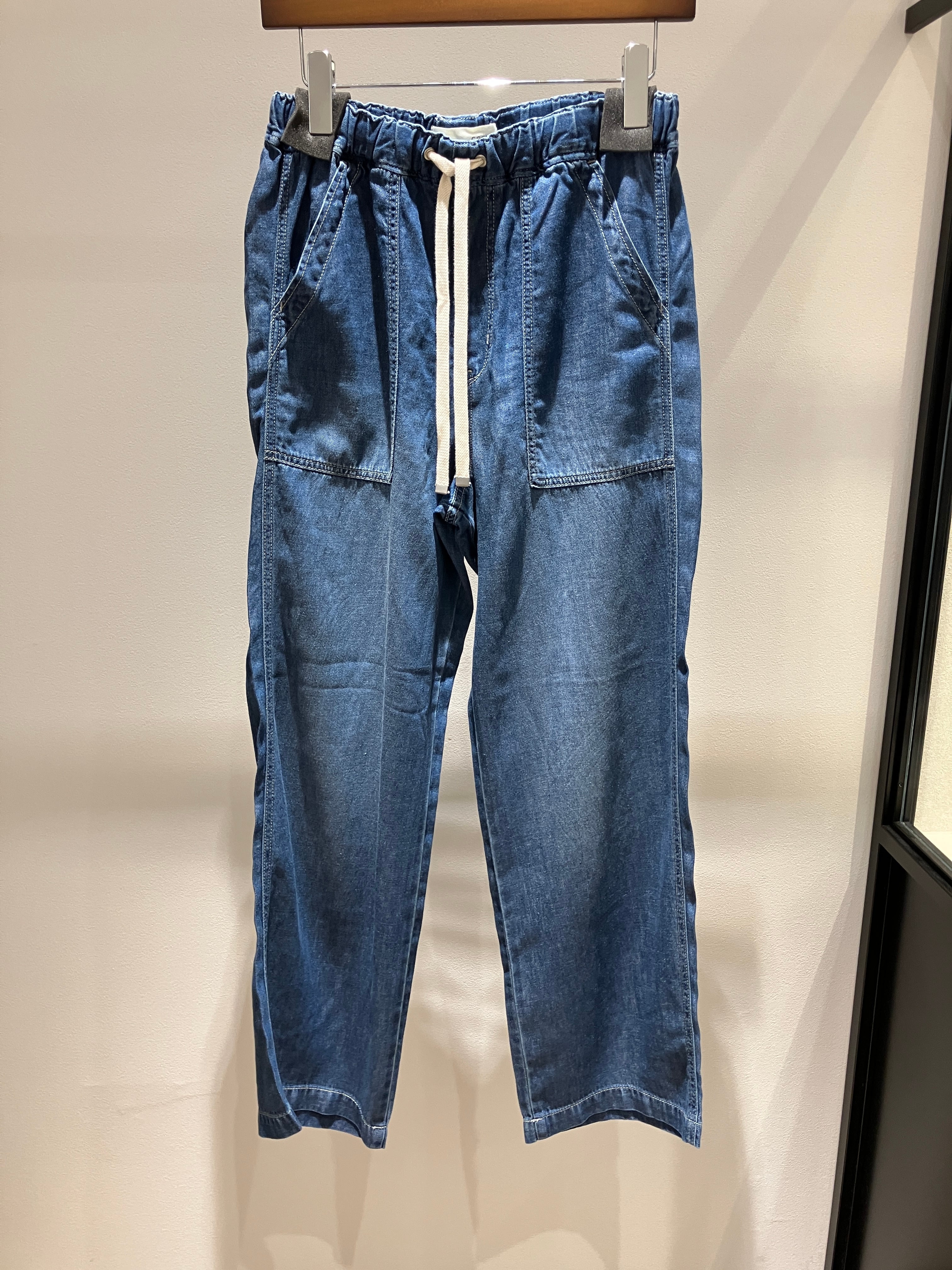 ベイカーパンツを、ドレープ性のある柔らかなデニム素材でアップデート。デニム特有の硬さがなく、落ち感のあるしなやかな生地が、きれいめなシルエットを演出します。ウエストゴムとゆとりのあるサイズ感で快適な穿き心地。麻を模した特殊なテンセル素材を使用しています。