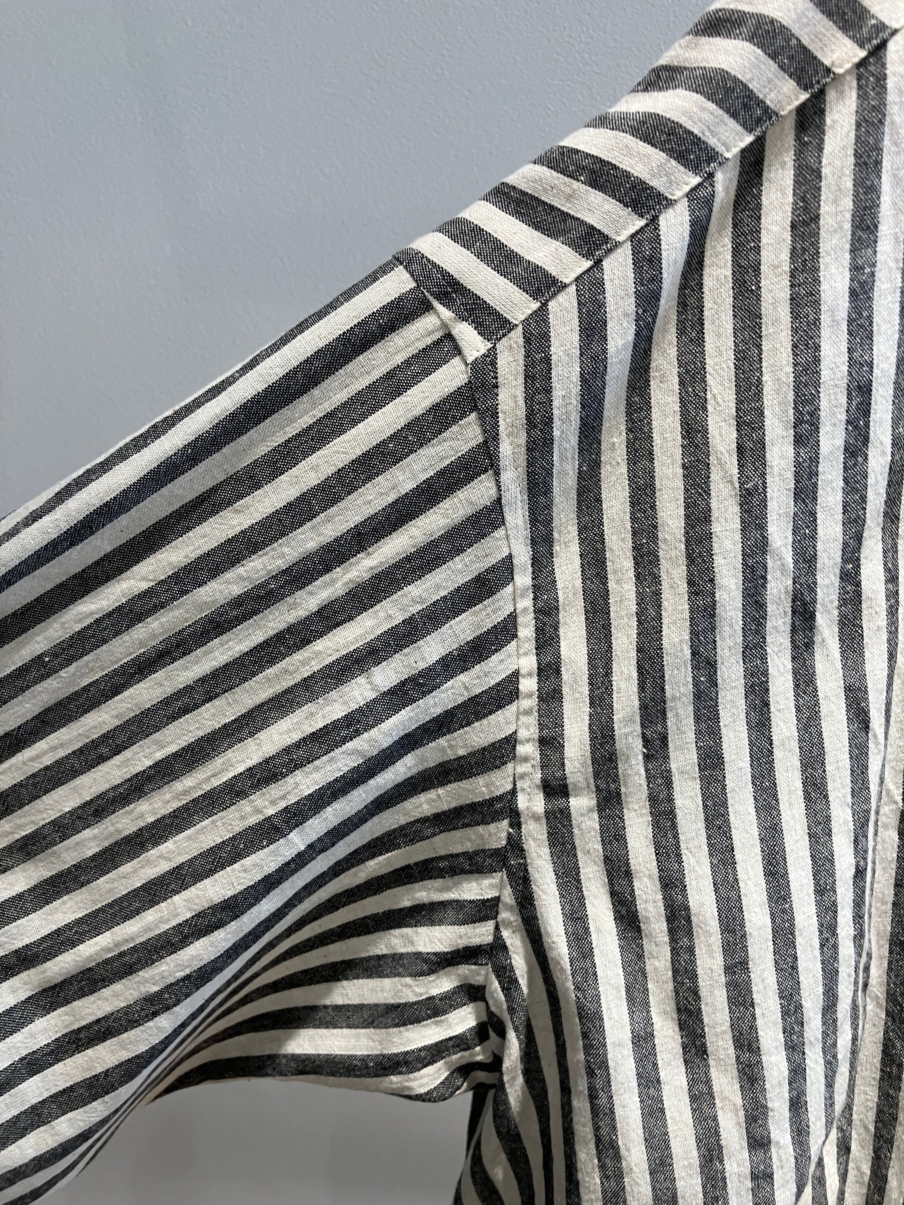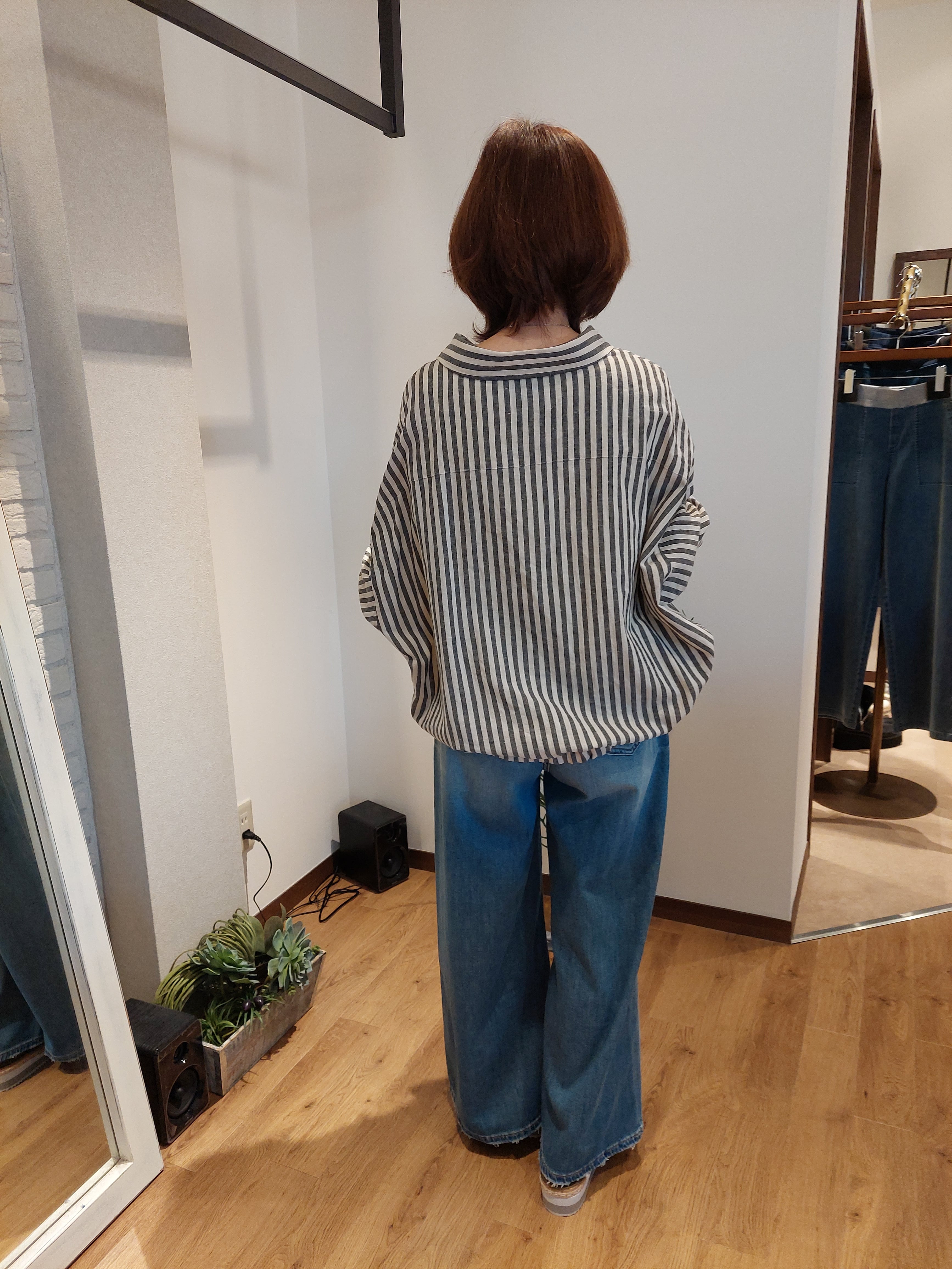 綿麻をベースにしたナチュラルな雰囲気の先染めを特殊なワッシャー加工を施すことで、天日干し風のタッチに仕上げられた素材を使用。