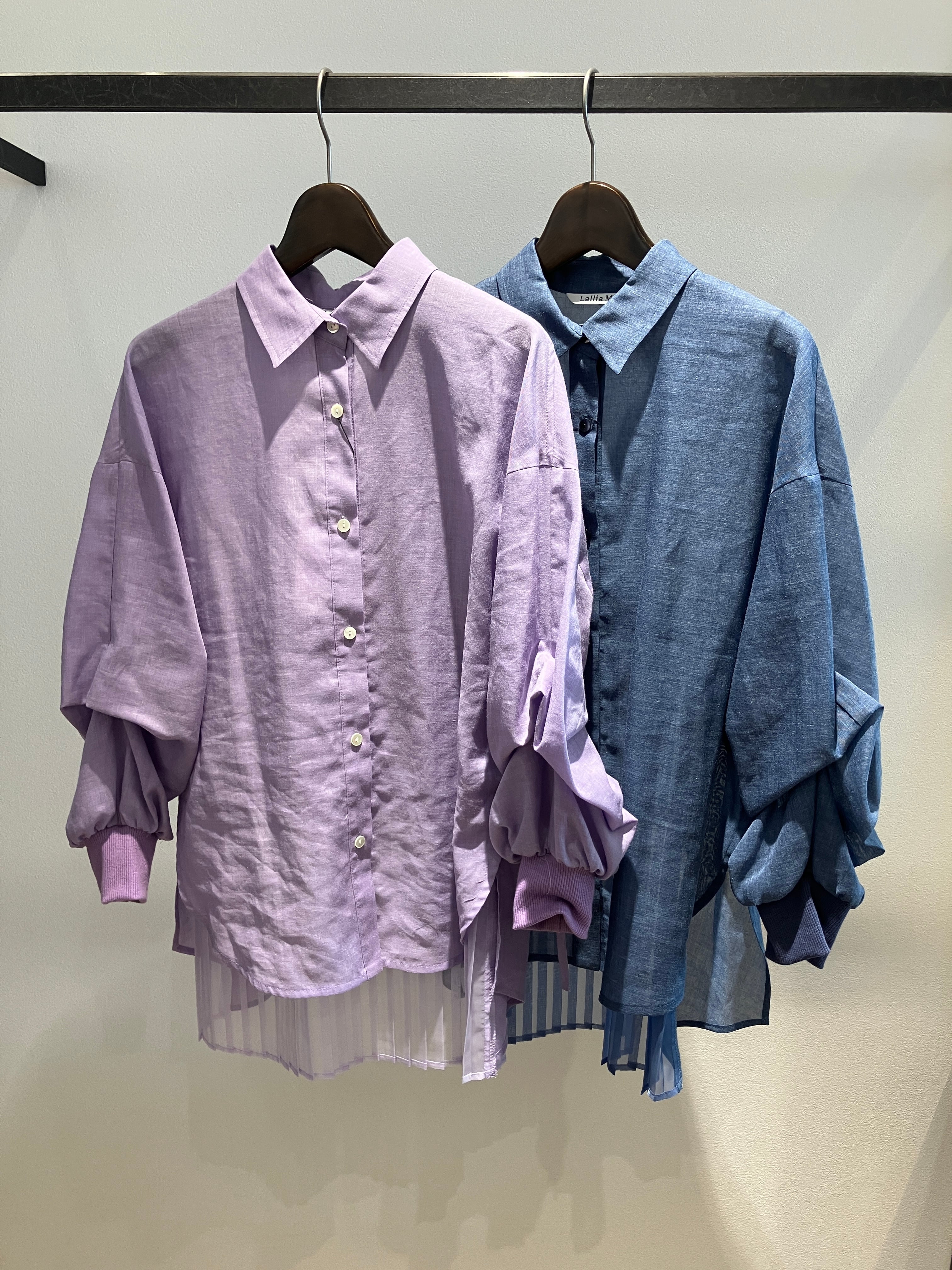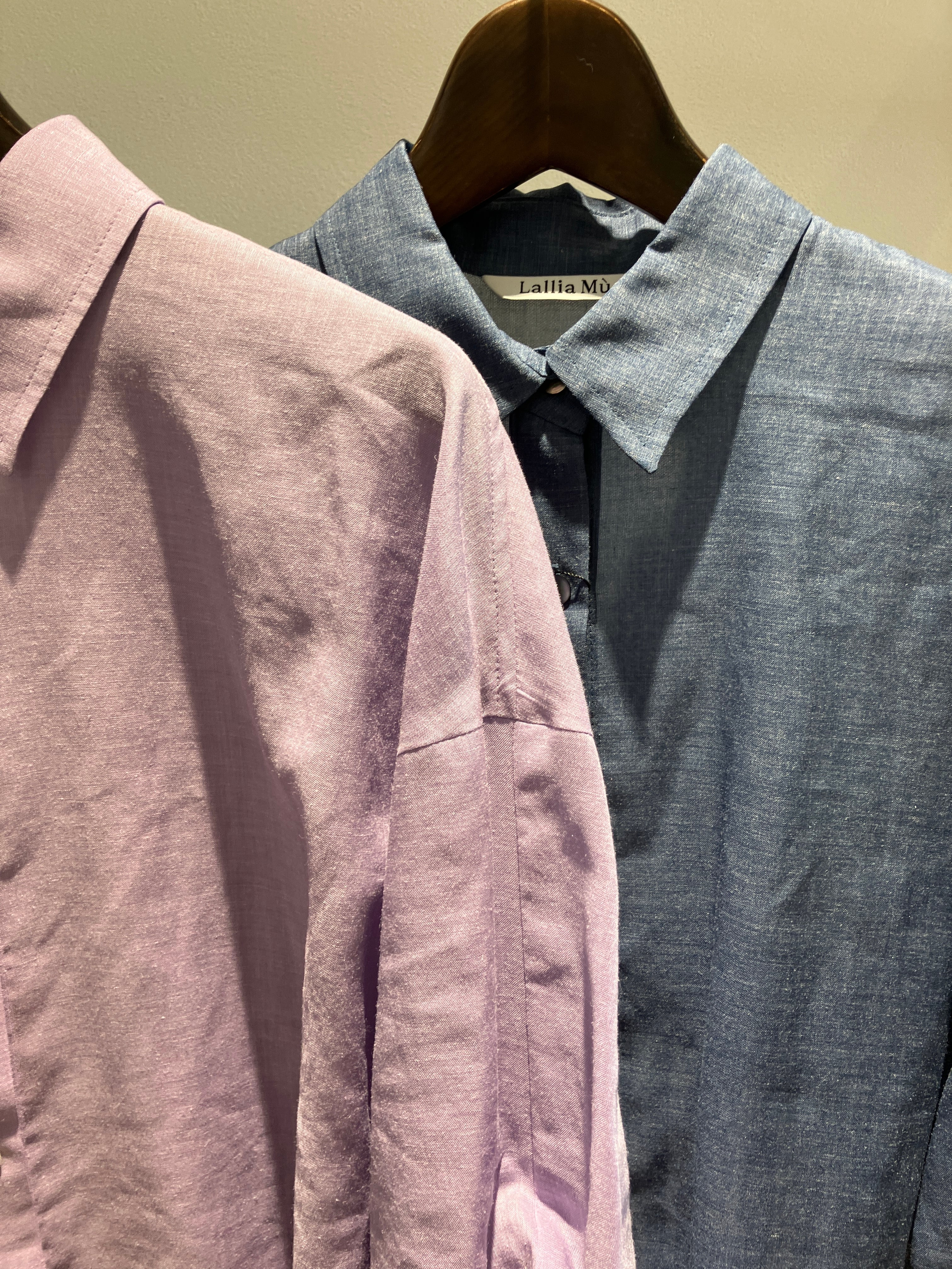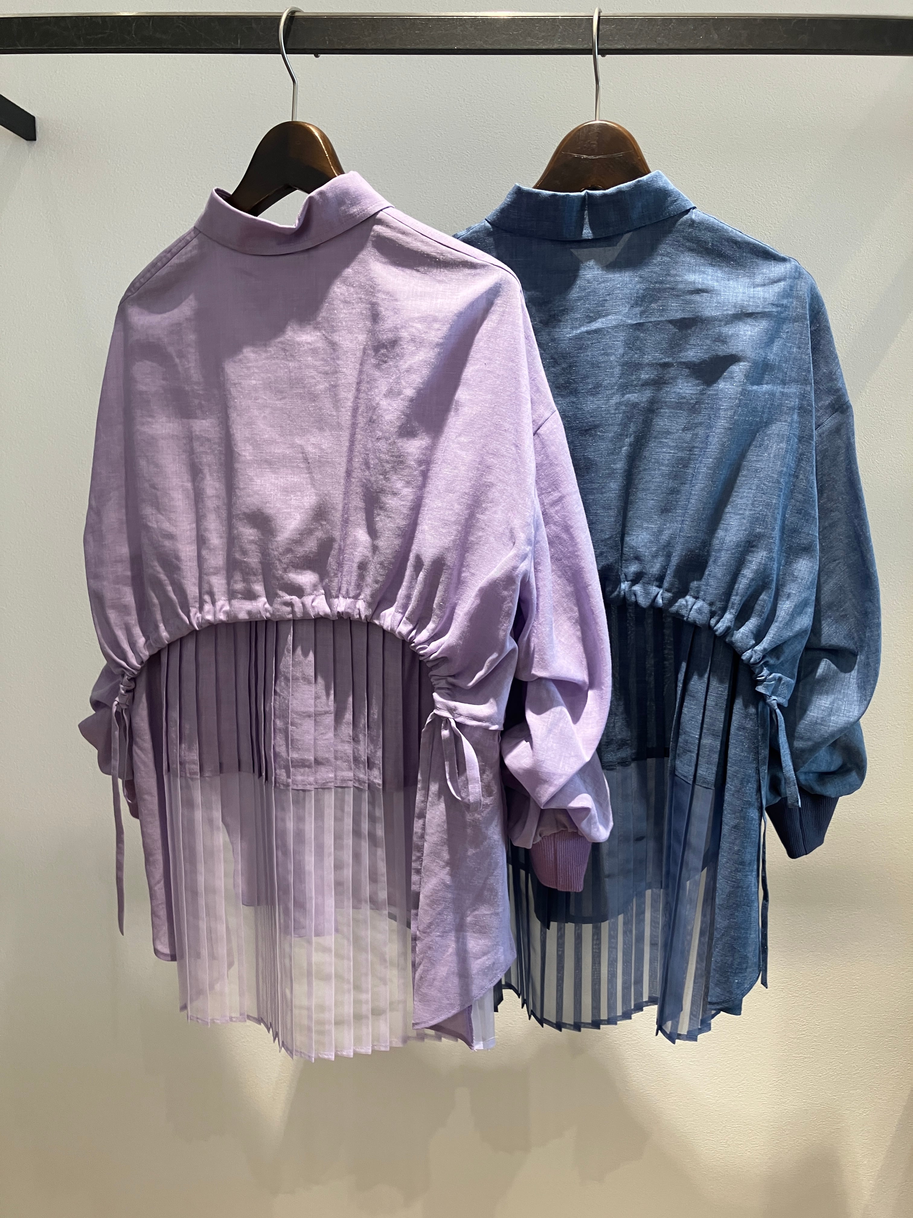 Lallia Múの代名詞でもあるプリーツをドッキングしたシャツシリーズ。人気のギャザーとプリーツを重ねたレイヤードデザインに、今季はナチュラルなシアー素材をのせました。プリーツの裾はオーガンジーを切り替えてさらなる軽さを表現。カフ部分はリブ仕様で腕にフィットしブラウジングにも役立ち、袖の内側には長さ調節に役立つボタン付きでボリュームや長さの調節が可能です。シワになりにくく、UV機能もついた素材で夏の軽羽織にもおすすめです。