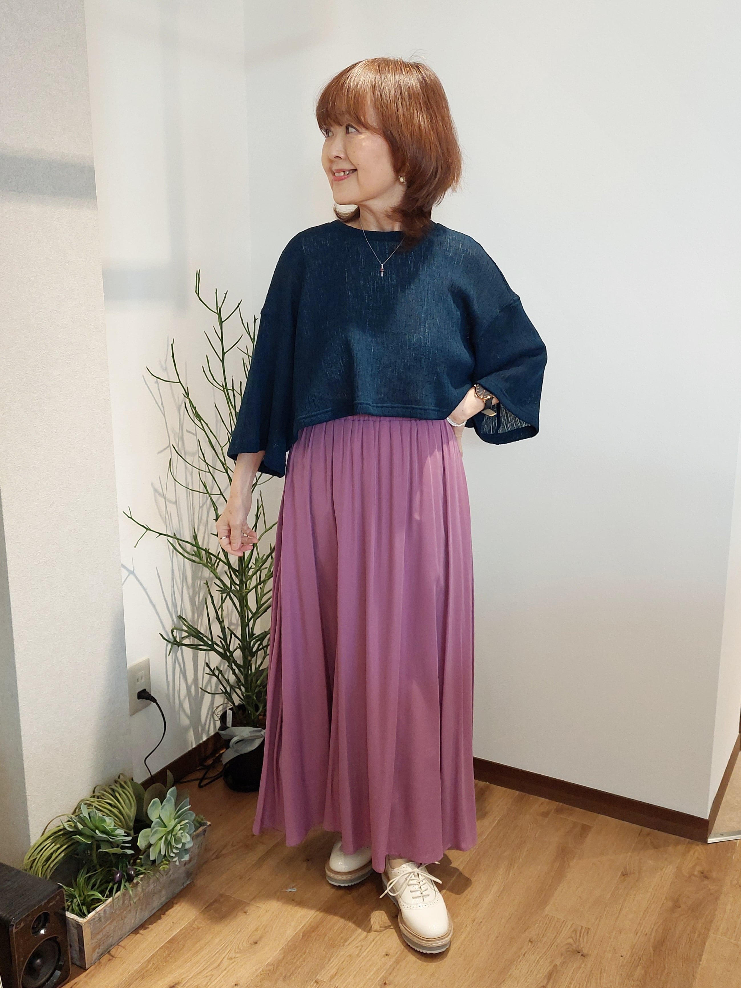 表情のある針抜きニットと落ち感の美しいジョーゼット素材。