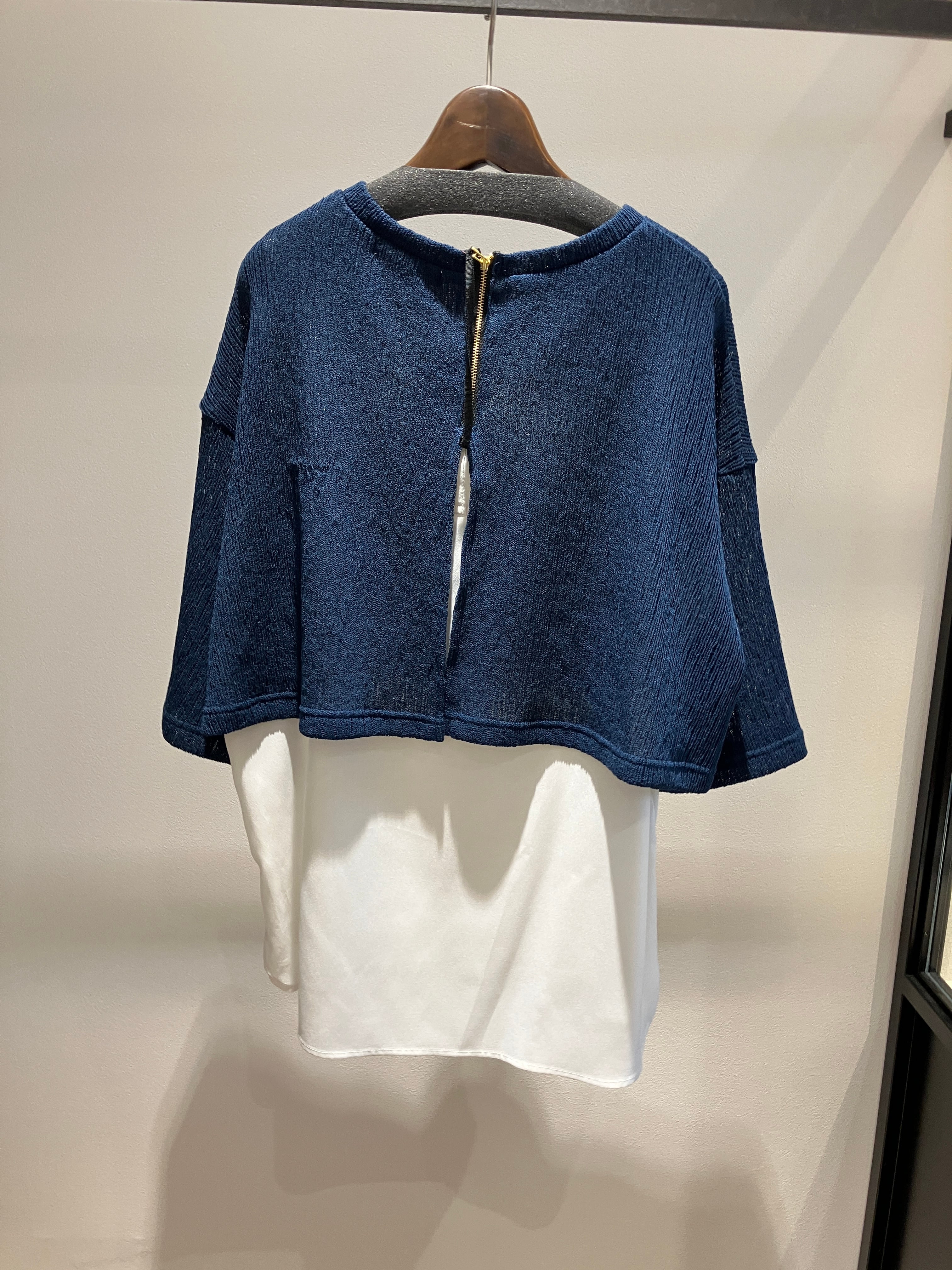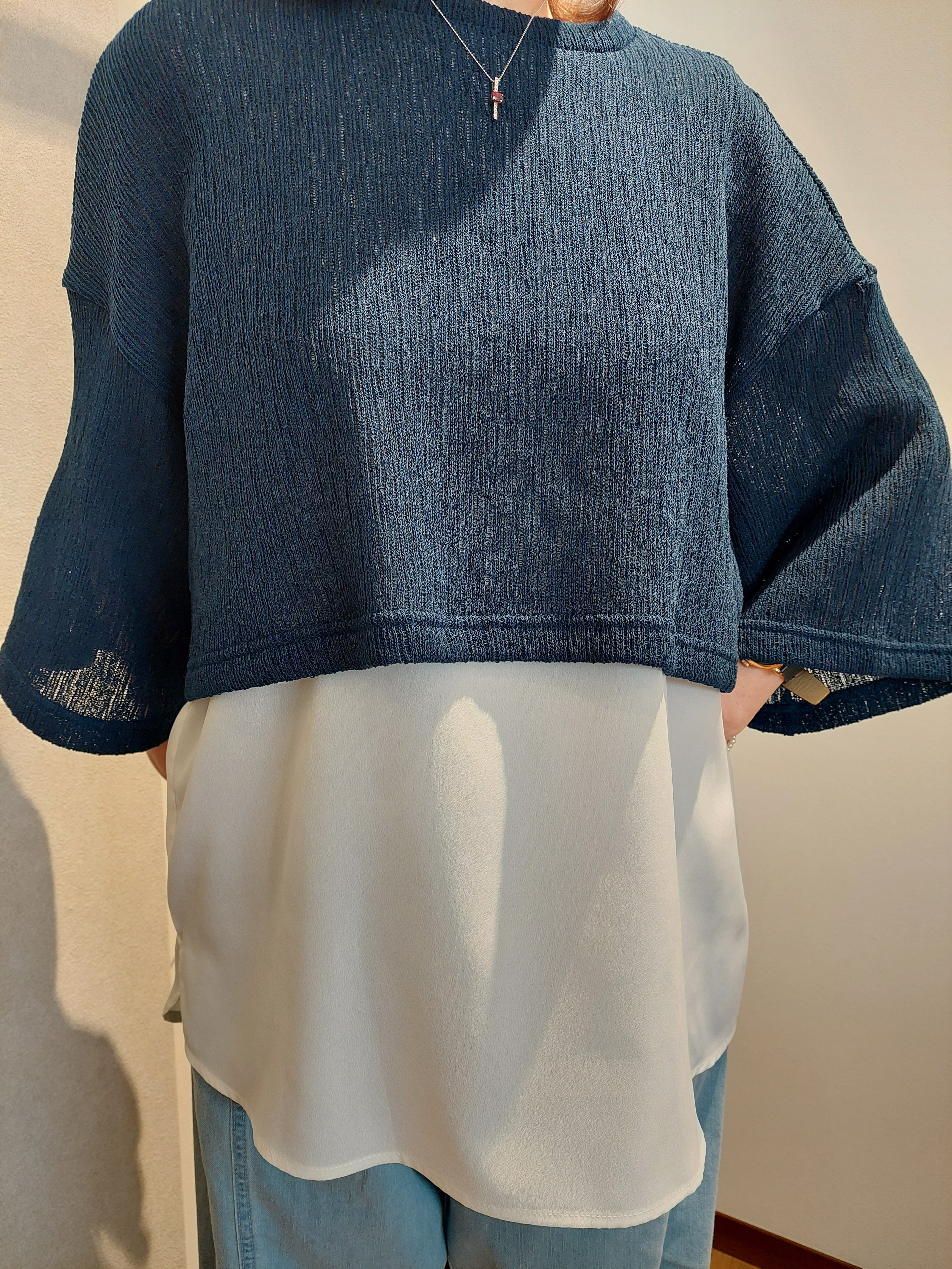 ジョーゼットのインナーが付いた針抜きニットのレイヤード風プルオーバー。
