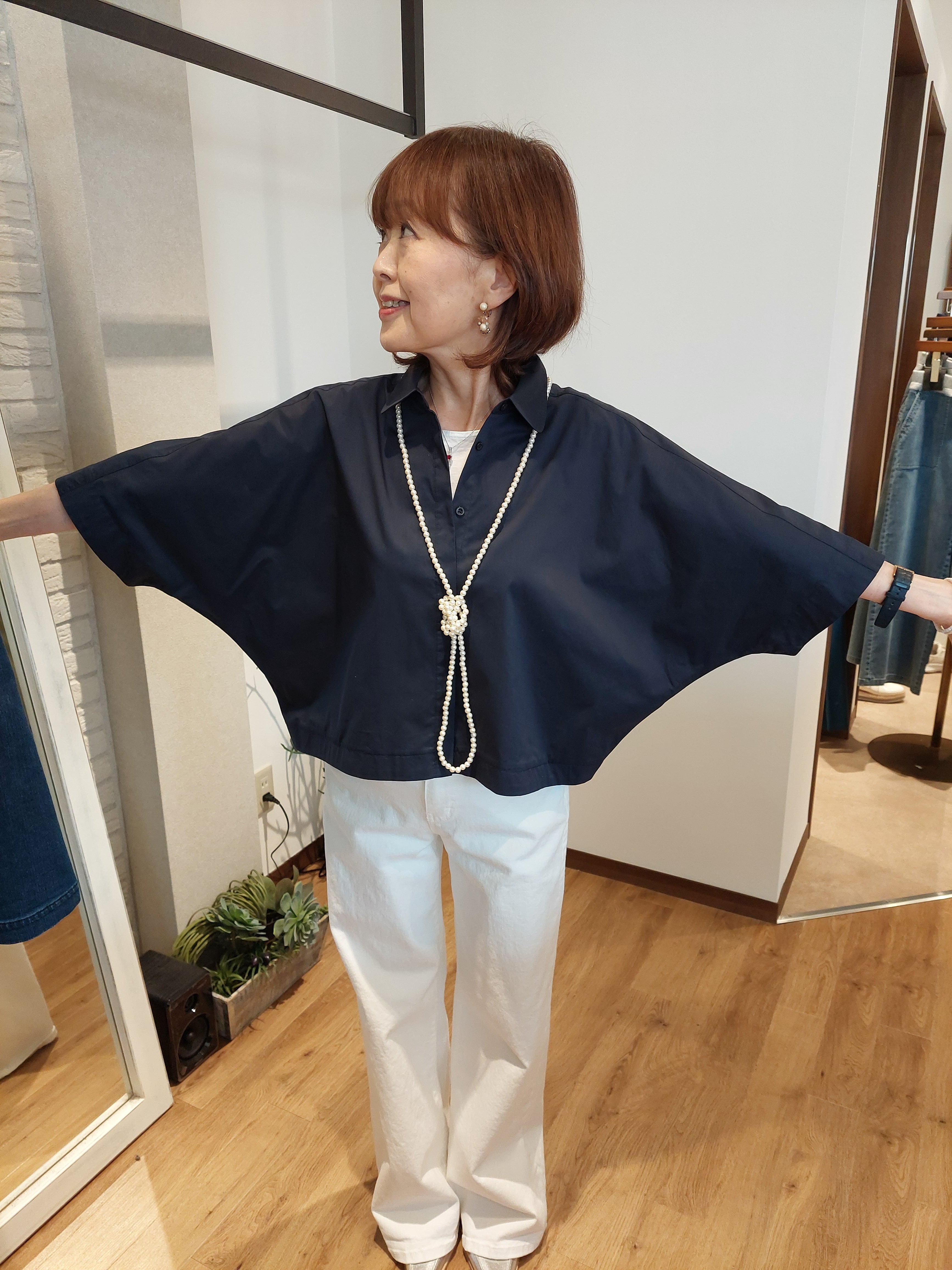 フロントは比翼仕立てですっきりと、背中にはたっぷりとバックギャザーを施し、前後で異なる表情が楽しめるブラウス。身頃と袖が一体になったドルマンスリーブが作る丸みのあるシルエットが、大人のリラックスムードを演出します。ギャザーが生み出すふんわりとしたボリューム感は、体のラインを拾いにくく、気になる部分をカバーしつつ上品な印象に。ハリのあるきれいめな素材感なので、カジュアルなボトムスと合わせてもラフになりすぎず、オンオフ問わず活躍してくれる一着です。
