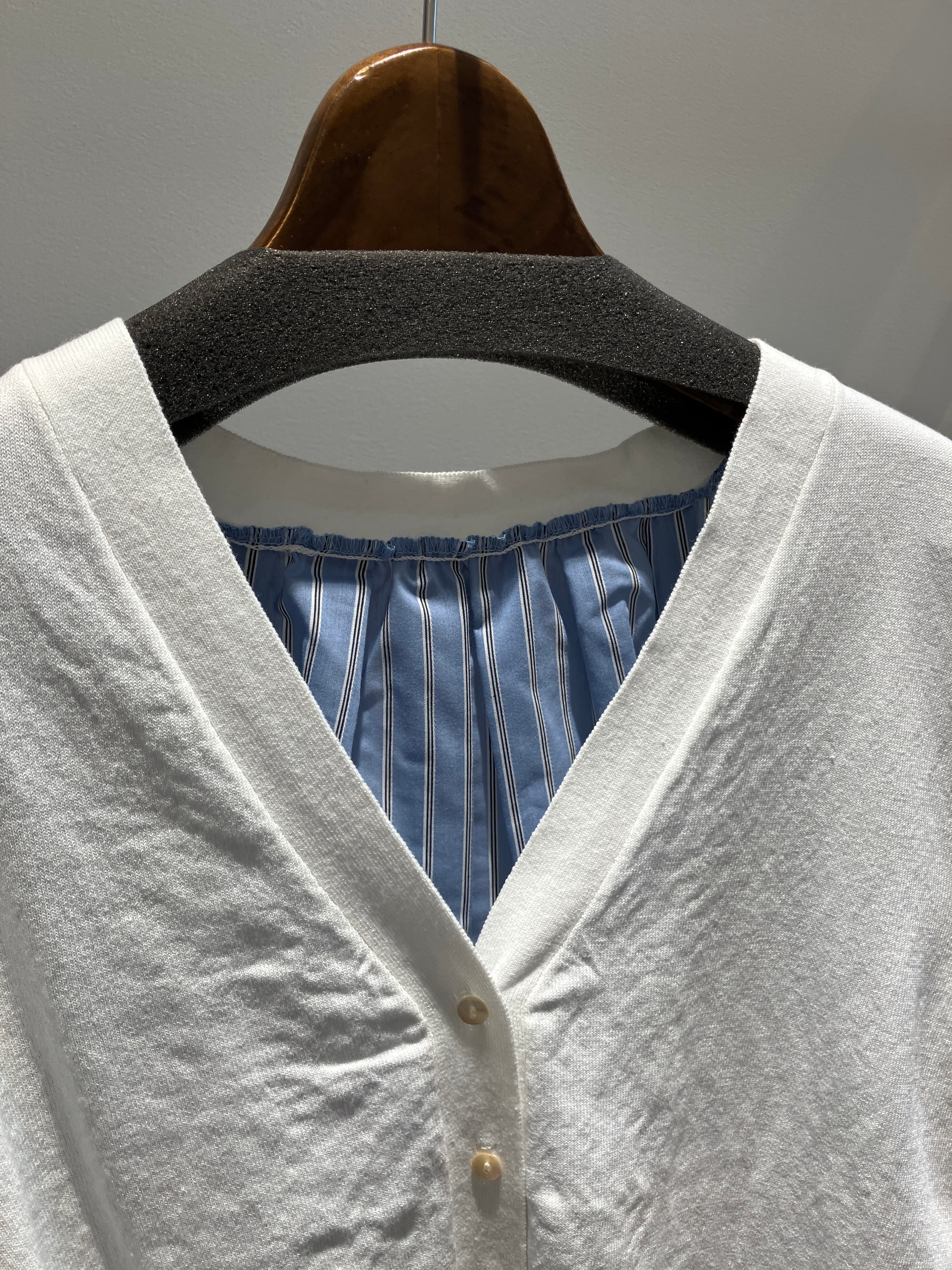 清涼感のあるニットと、クリーンな布帛(シャツ生地)をドッキングさせた、一枚でサマになるコンビカーディガン。バックは、ふんわりとしたシャツ生地の上に、ニットを重ねたように被さっており、360度どこから見ても抜かりなくお洒落に決まります。フロントはシンプルなVネックカーデとして、後ろはシャツをレイヤードしたようなこなれ感のあるスタイルに。羽織るだけで洗練された大人の「ひと技効いた」コーディネートが完成する優秀アイテムです。