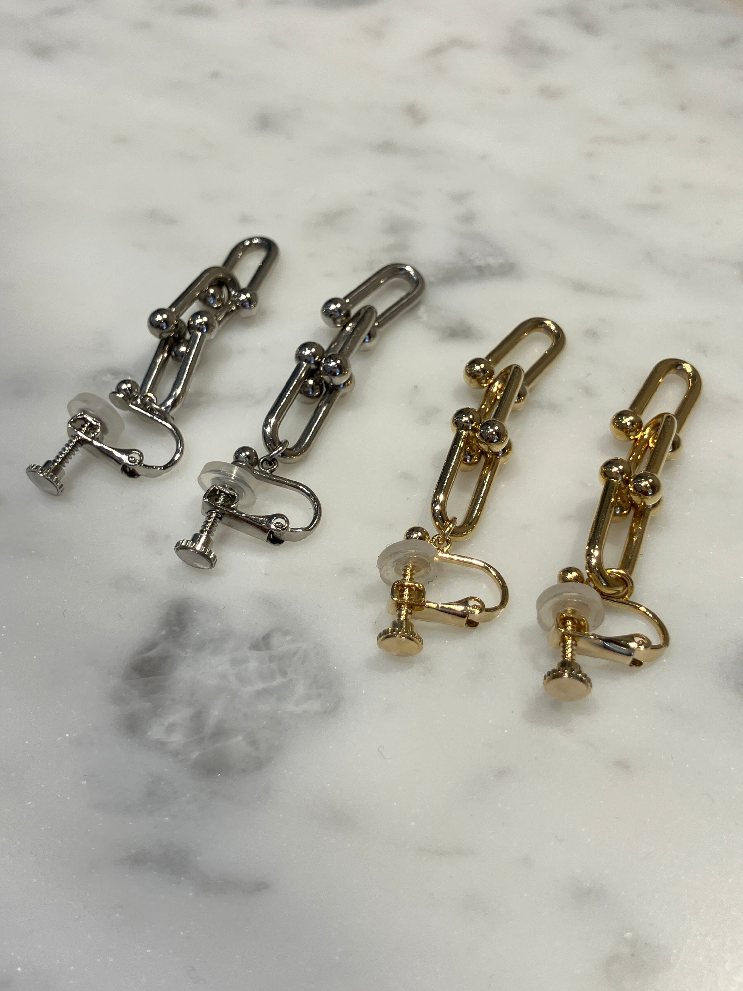 直線的なハードウェアスタイルのリンクパーツと、その接合部に配置された球体(スタッド)の組み合わせが、インダストリアルでありながら洗練された印象を与えます。異なる質感のメタルパーツが重なり合い、揺れることで、エッジの効いたモダンな雰囲気を演出します。