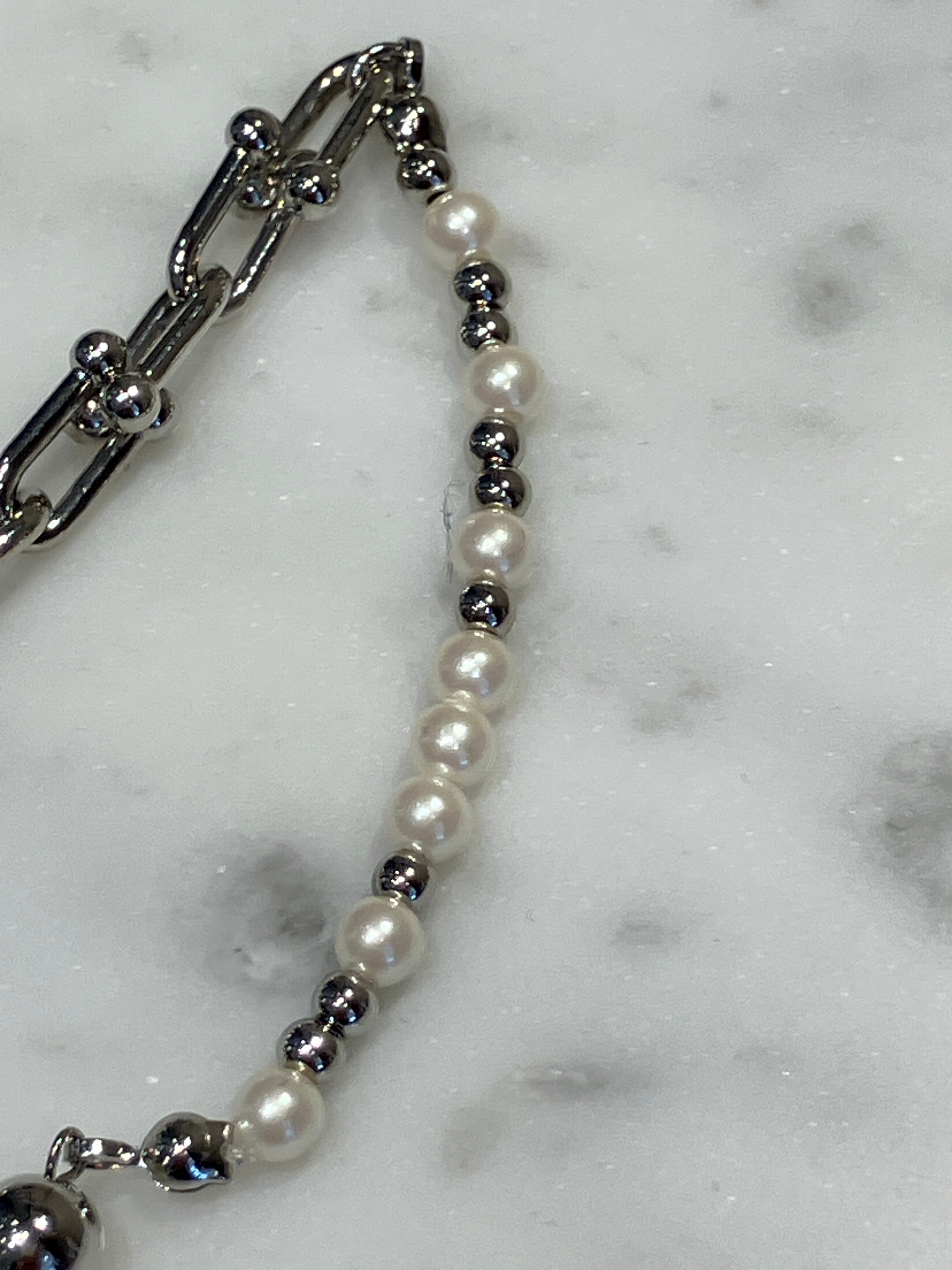 エッジの効いた「ハードウェアスタイル」のリンクチェーンと、上品な「樹脂パール」を大胆に組み合わせたアシンメトリーなデザインが最大の特徴です。無骨さとエレガントさという相反する要素が一つに融合しており、これ一本で手元に圧倒的なこなれ感を演出します。