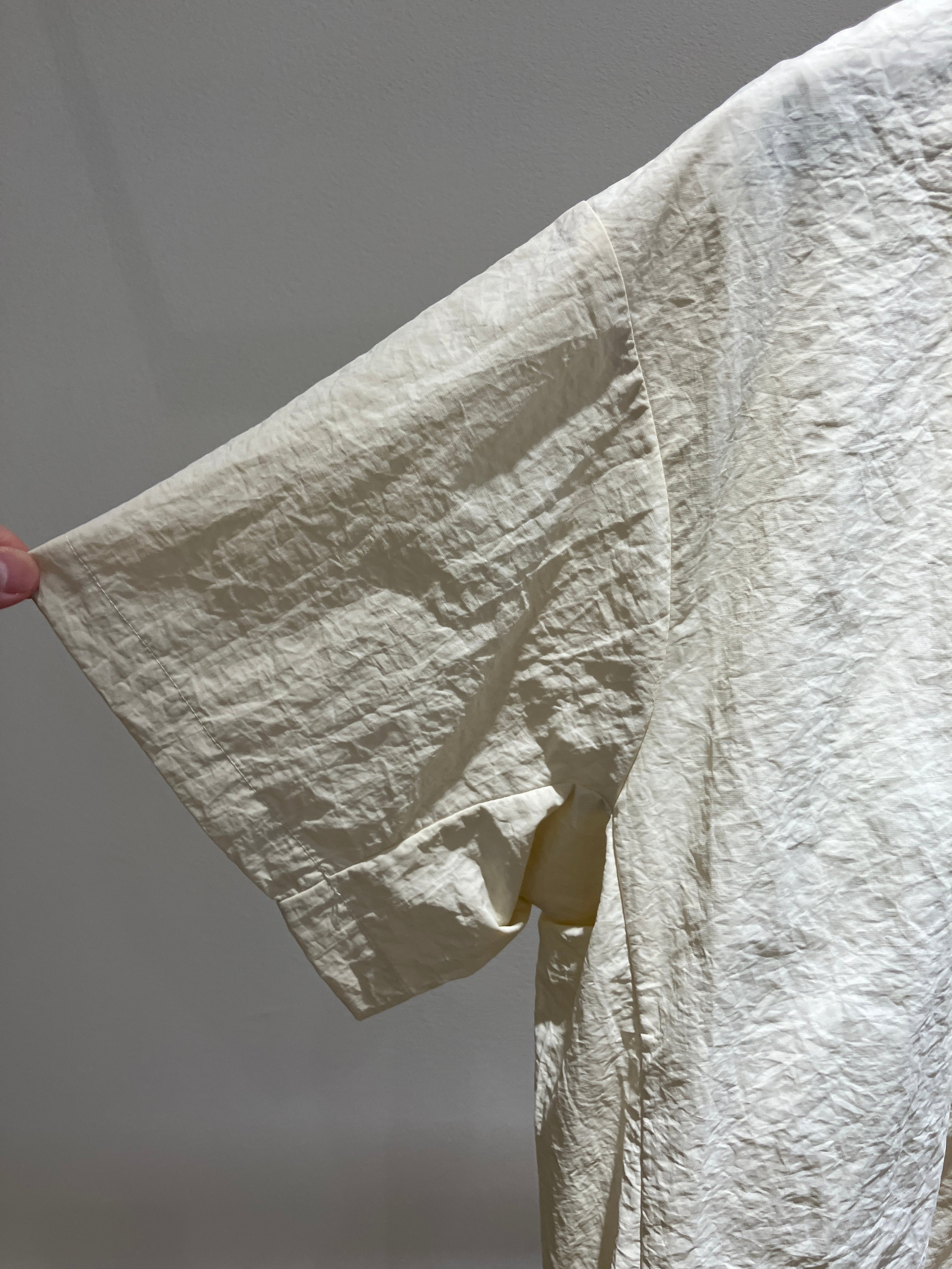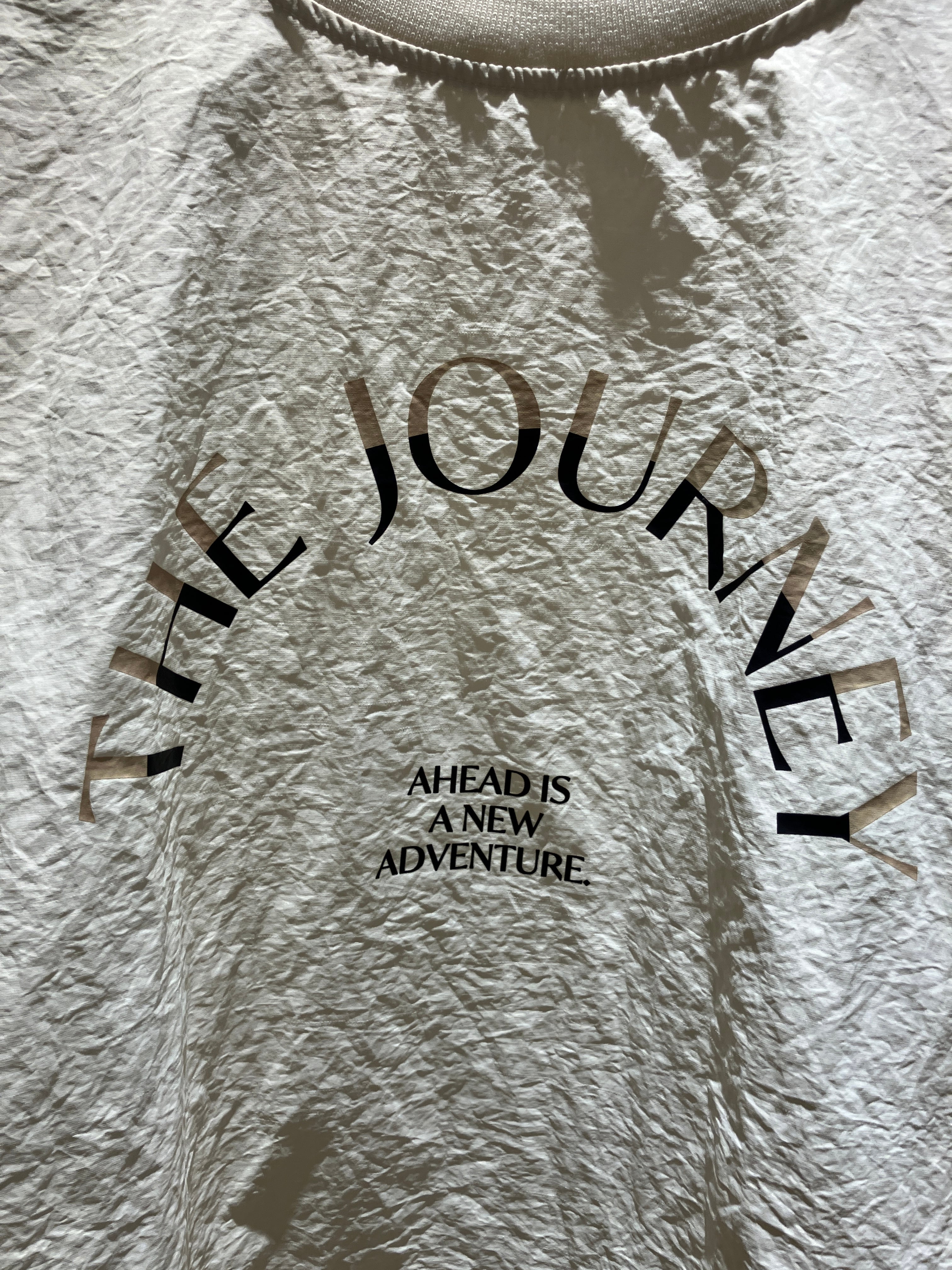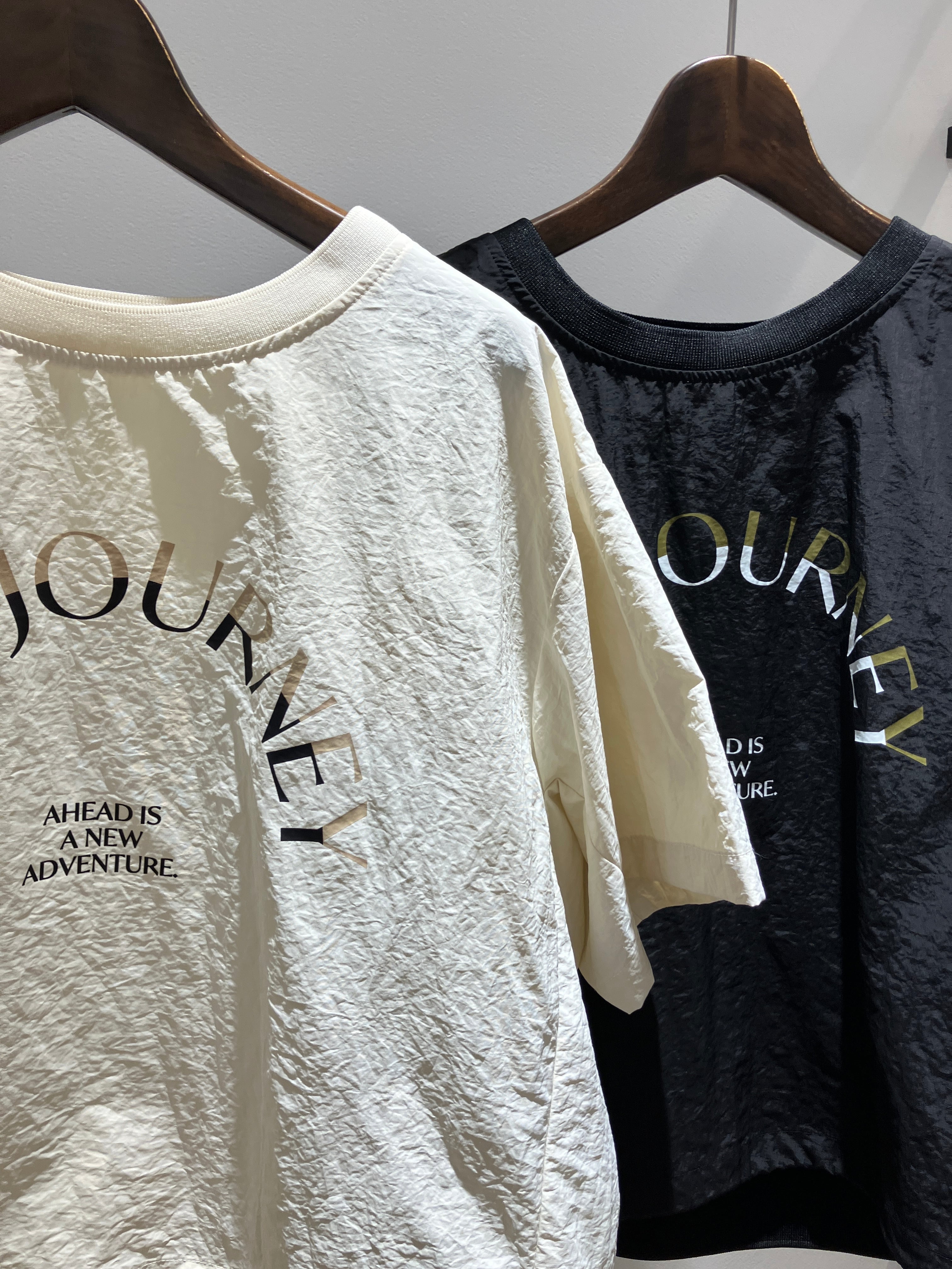 Tシャツのように着用できるブラウス。前裾はコード付きで、シルエットの調整が可能です。ロゴの意味は「この先の旅路は新たな冒険」。