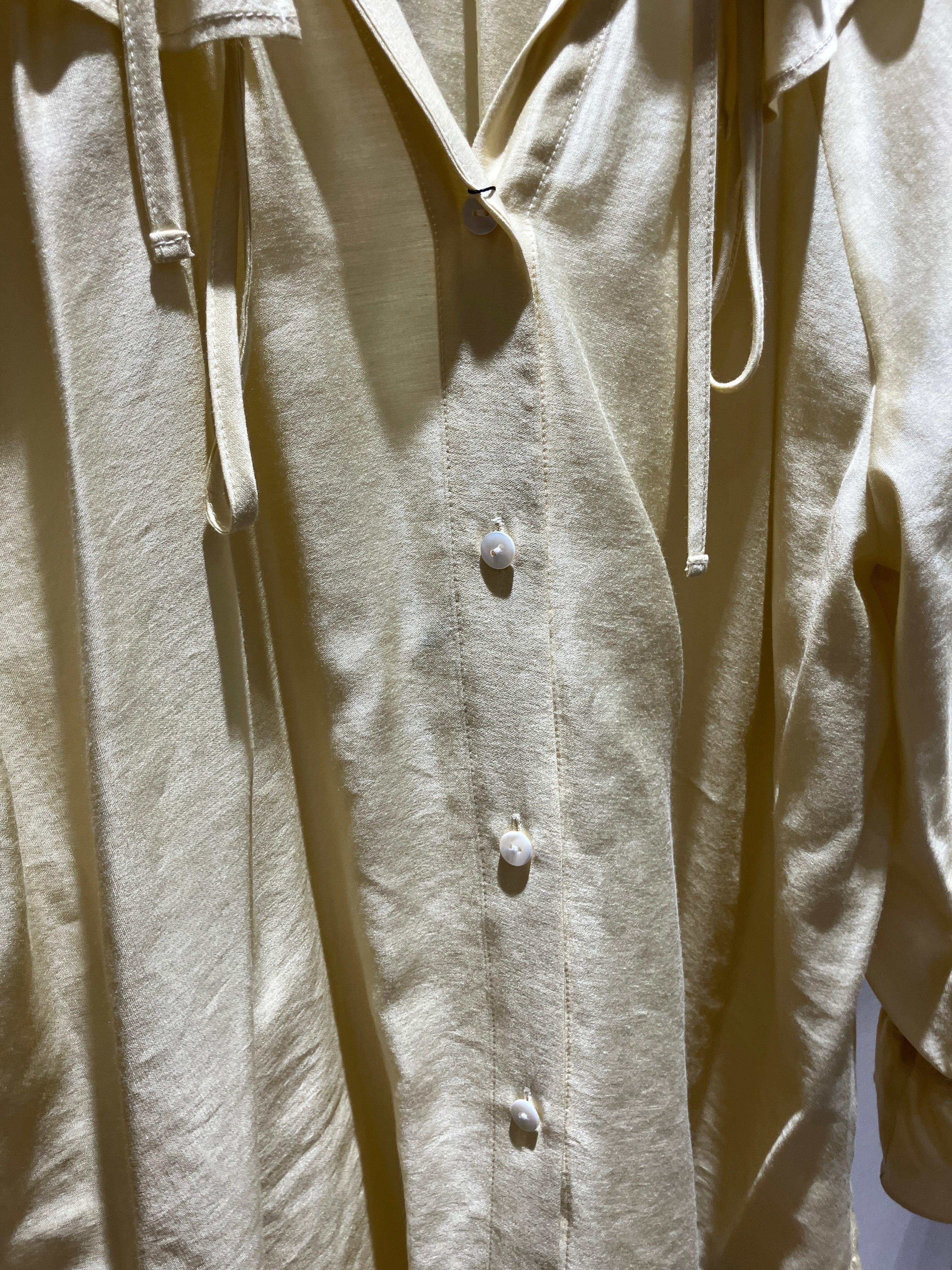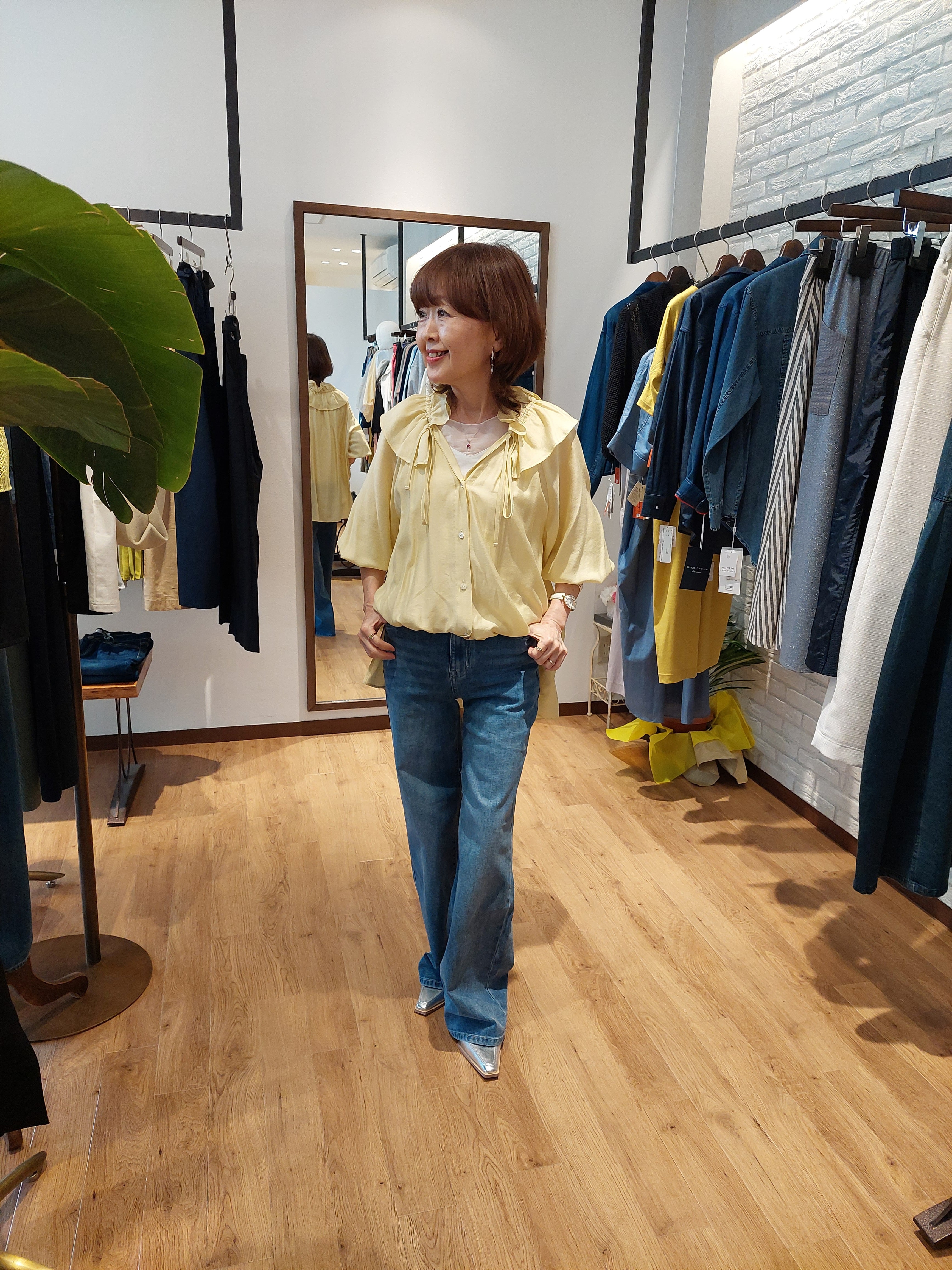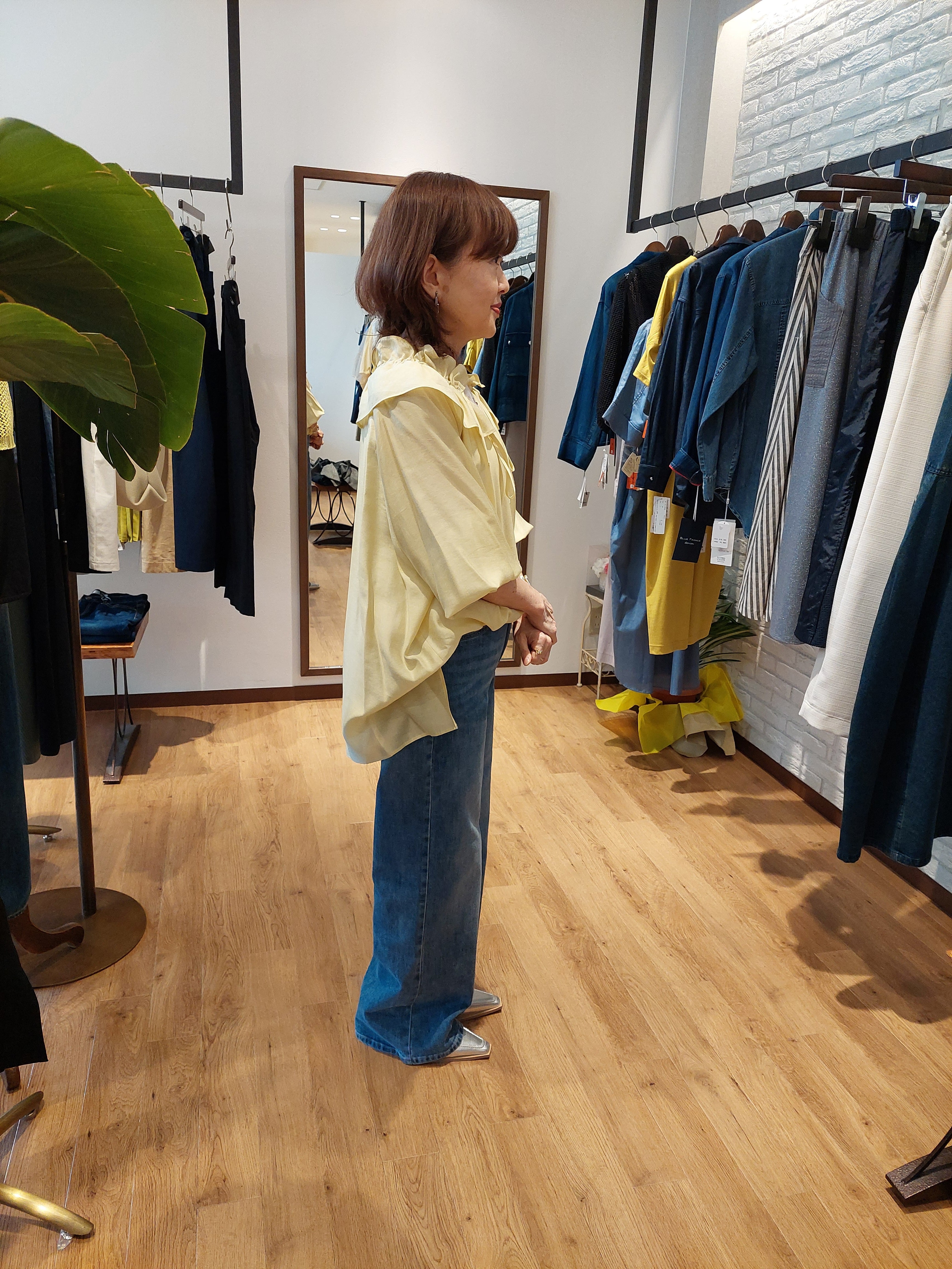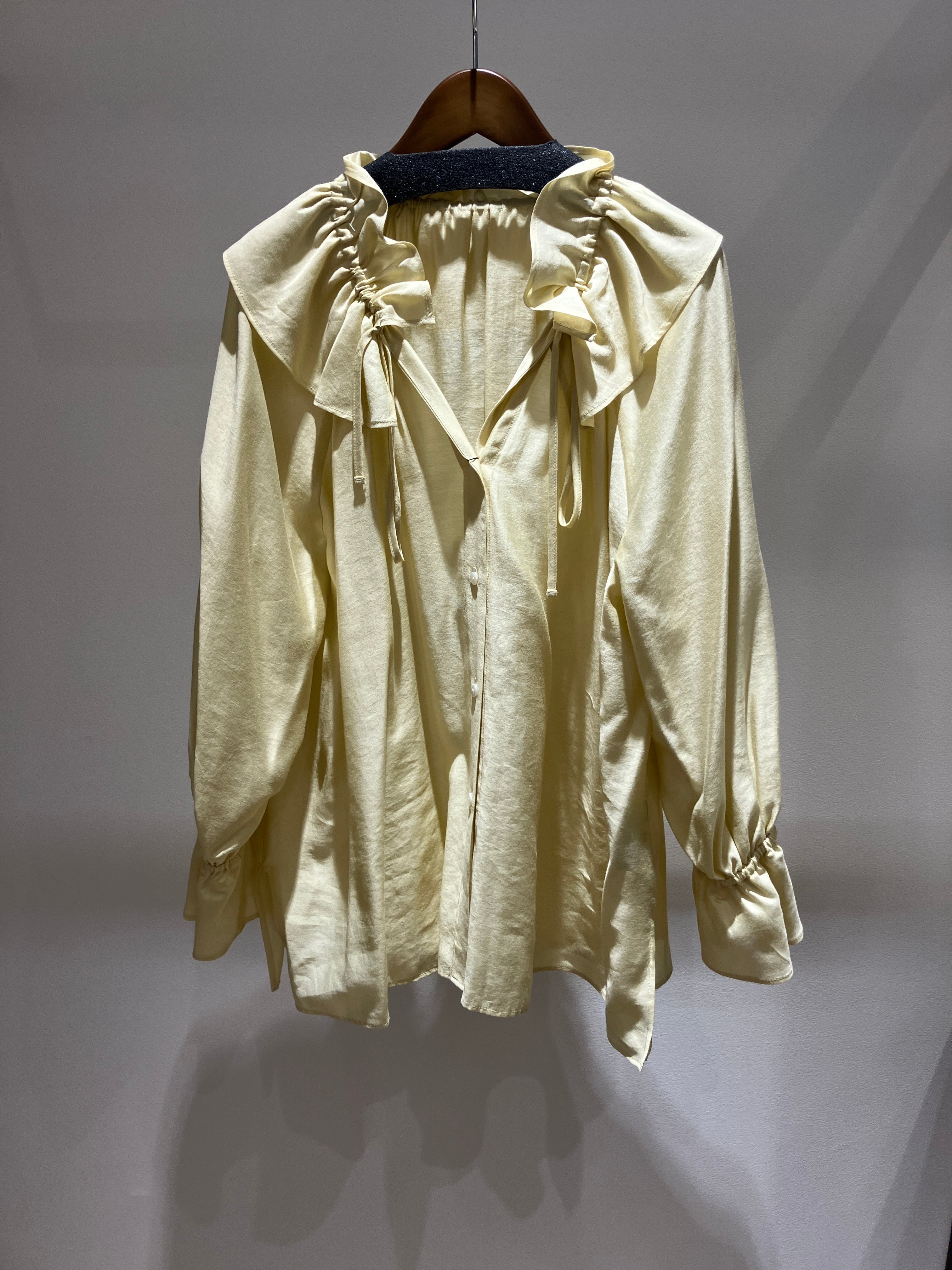 衿に施したフリルが目を惹くブラウス。 フリルが特徴的なブラウスでありながら、透け感のある生地にVネックデザインの襟元が甘く 女性らしい抜け感を表現します。やわらかな生地にゆったりとしたシルエットがきれいなドレープを産み出し、一枚でさらりと着ても羽織として着てもこなれた印象に。脇のスリットはフロントタックインする際にも役立ち、さまざまなスタイリングを楽しんでいただける一着です。