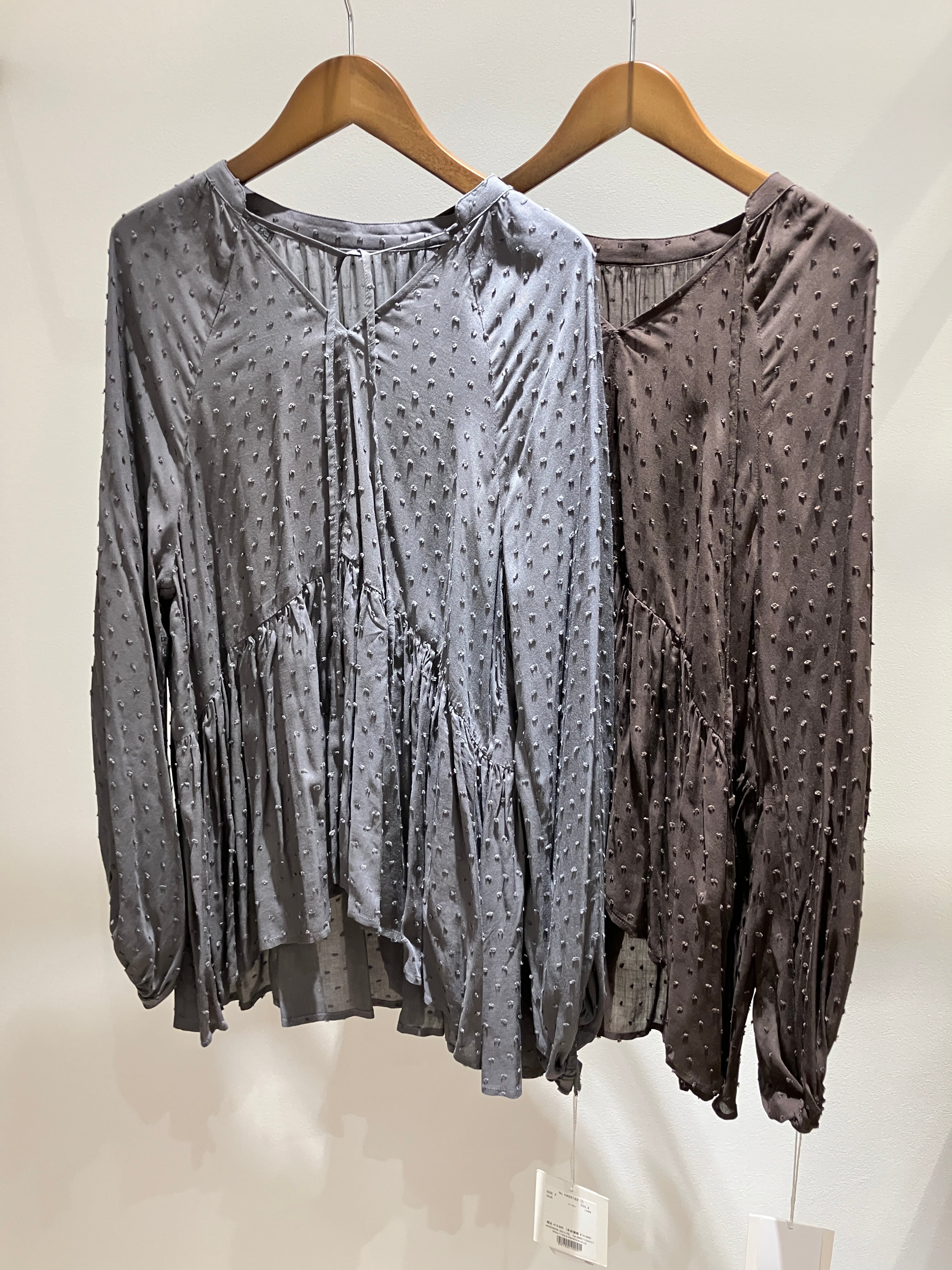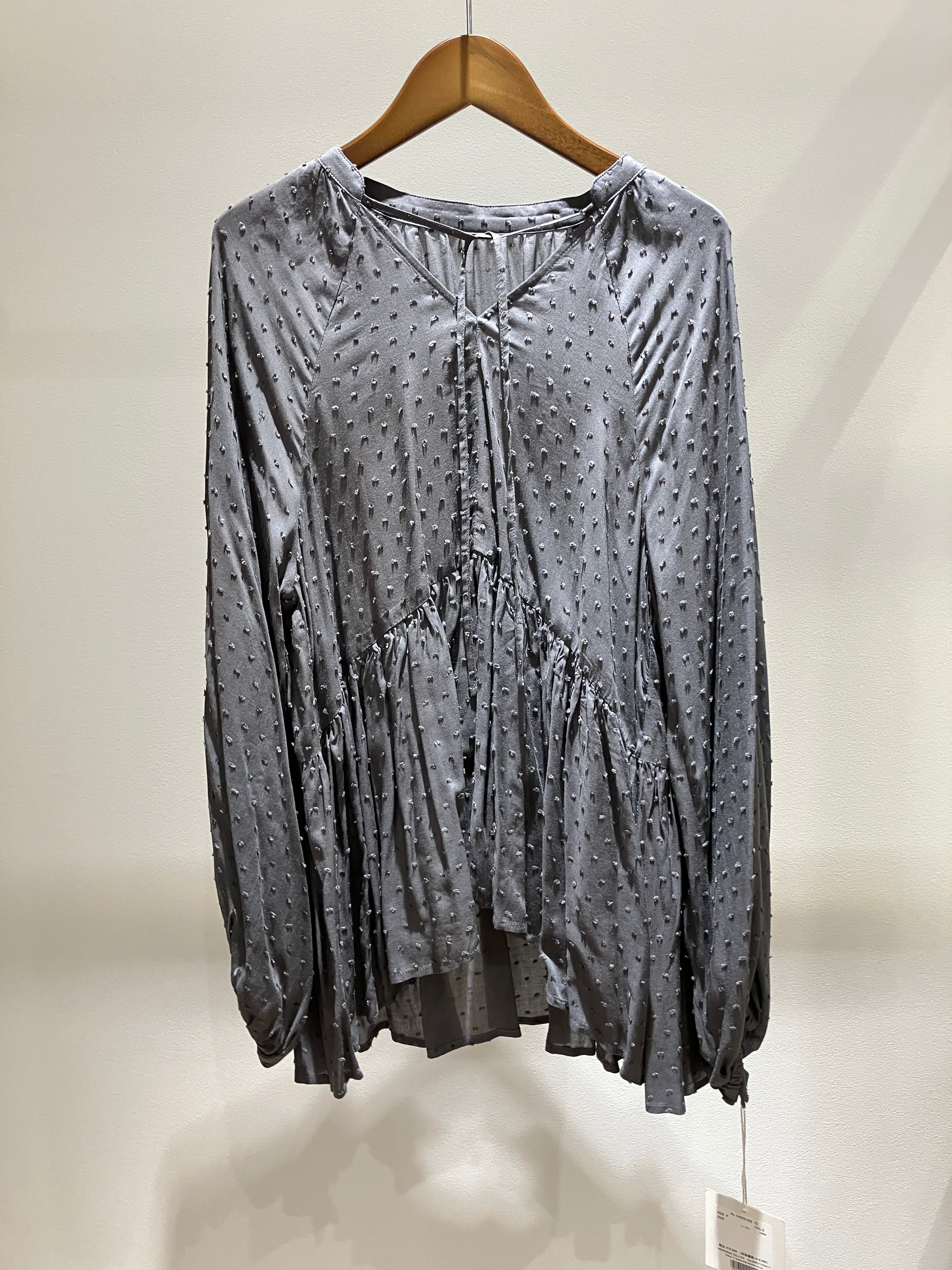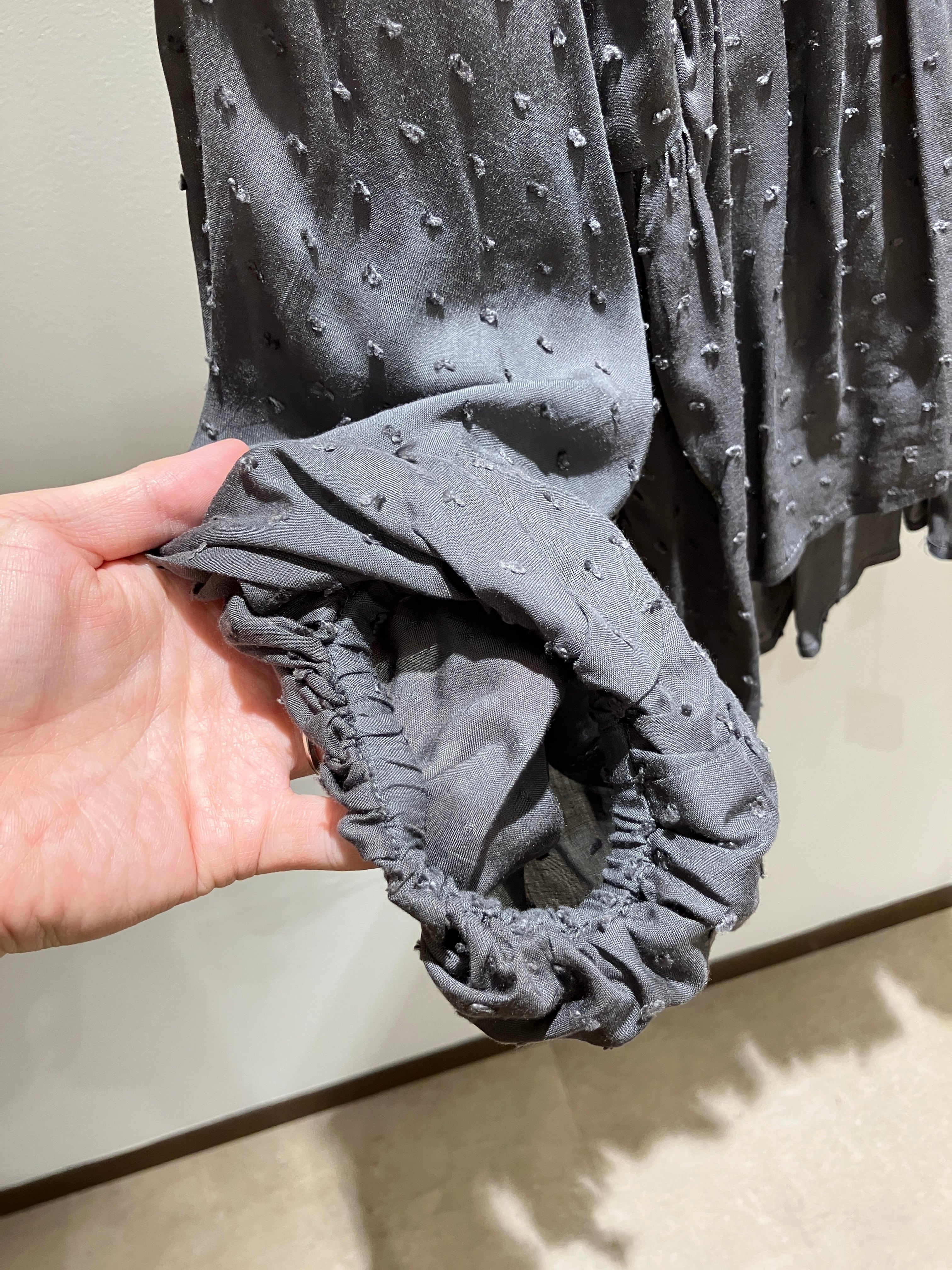 繊細なドット刺繍を全面にあしらった、クラシカルで華やかなデザインブラウス。肌を美しく透かす程よいシアー感のある生地が、ドット柄の甘さを抑え、大人っぽくヘルシーな印象に引き立ててくれます。衿元にたっぷりと施されたギャザーは、お顔周りをふんわりと優しく見せてくれる効果も。さらに、裾ギャザーのデザインによって自然なブラウジングが生まれるため、ボトムスにインしなくてもバランス良く決まるのが嬉しいポイントです。デニムでカジュアルに外しても、きれいめスカートで上品にまとめてもサマになる、着映え度抜群の一着です。