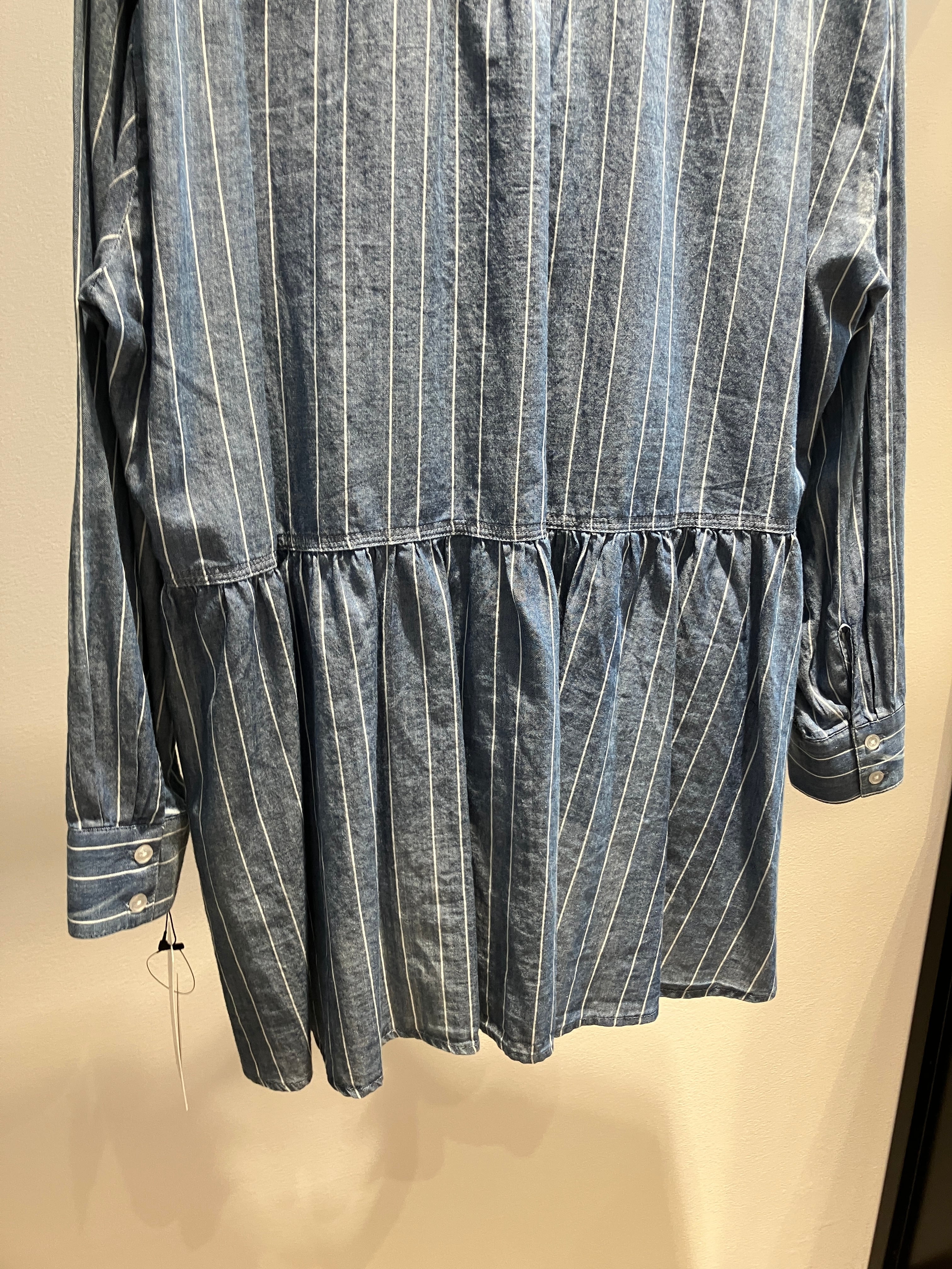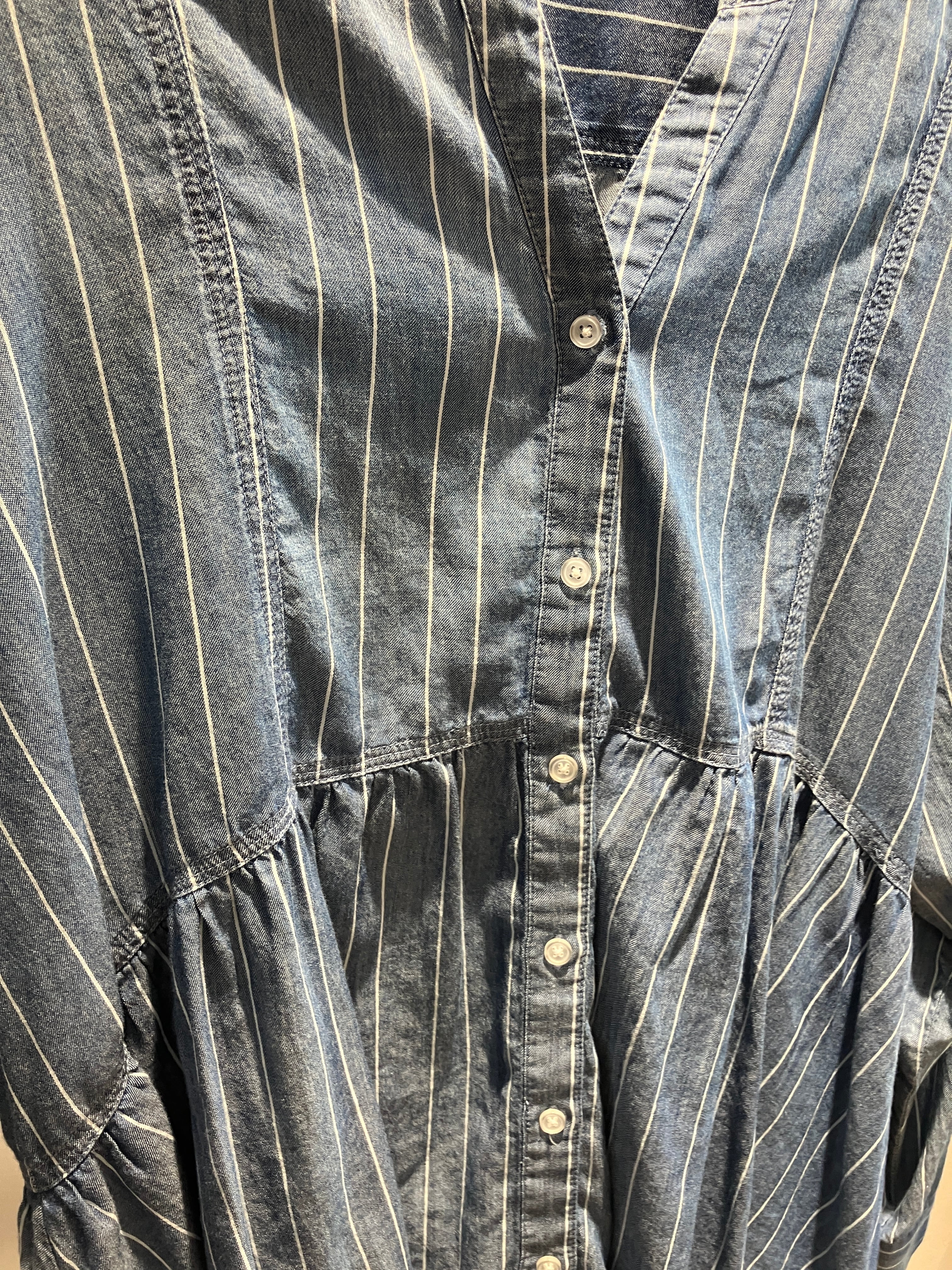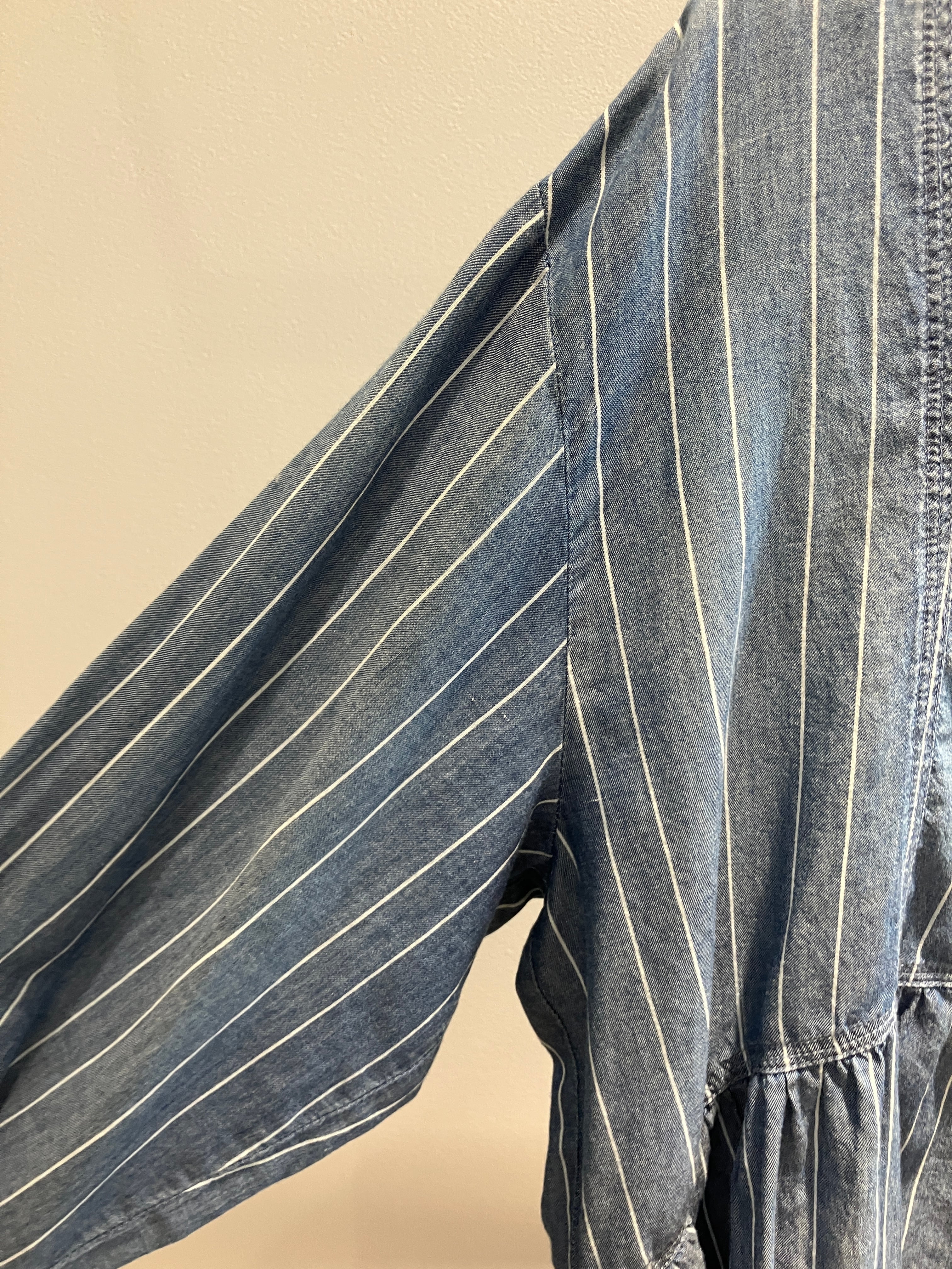 デニムの爽やかな表情に、今季らしい透明感を掛け合わせた「シアーデニムストライプシャツ」。一番のポイントは、お顔周りをすっきりとシャープに見せてくれるスキッパーデザイン。襟元に抜け感が生まれることで、大人っぽいヘルシーな着こなしが叶います。繊細なストライプ柄と程よいシアー感の相乗効果で、ロングスリーブながら驚くほど軽やかな印象に。さらに、背中にたっぷりと施されたバックギャザーが、歩くたびに美しく揺れる立体的なシルエットを演出してくれます。羽織りとしても重宝する、上品さとリラックス感を兼ね備えた、春夏に欠かせない一着です。