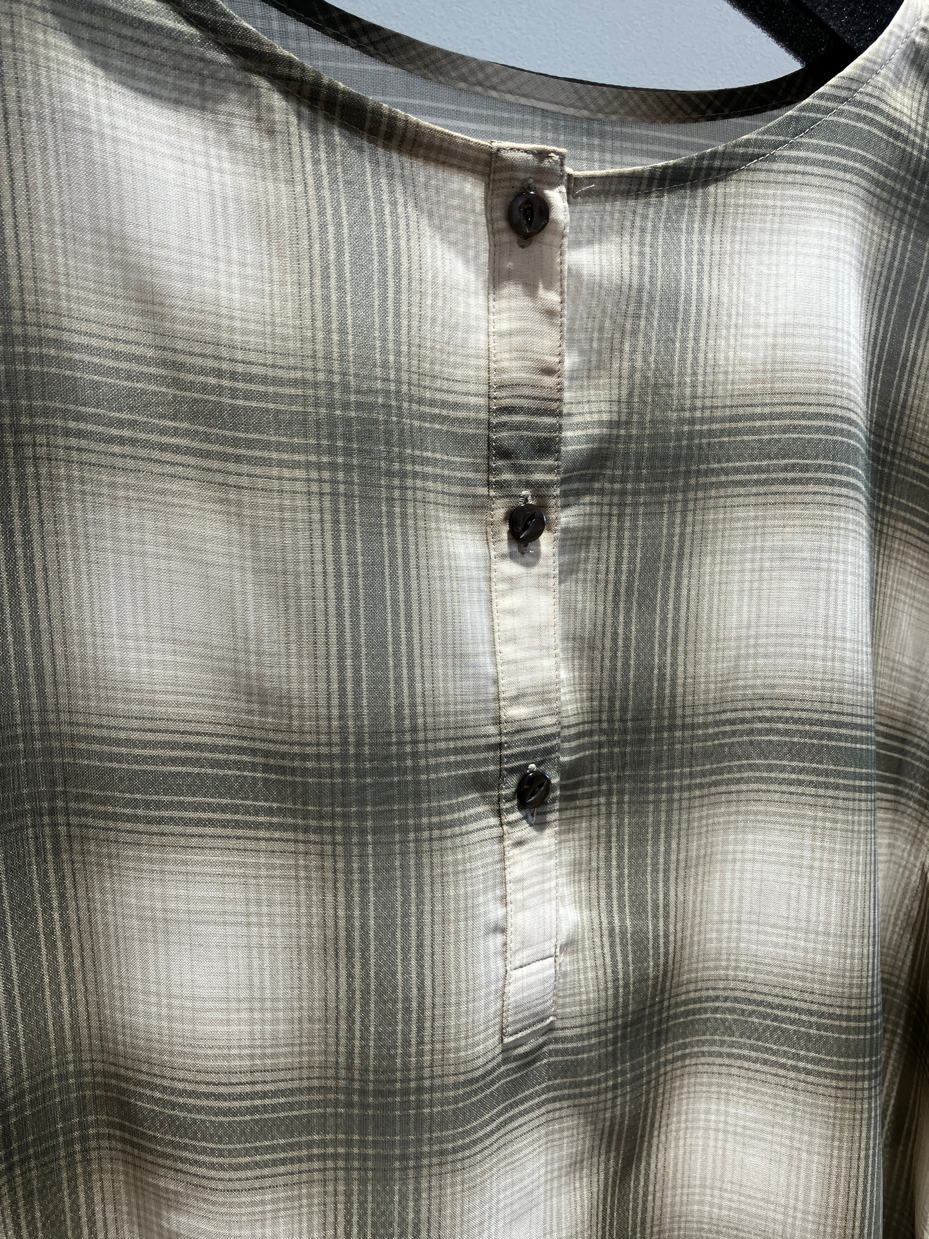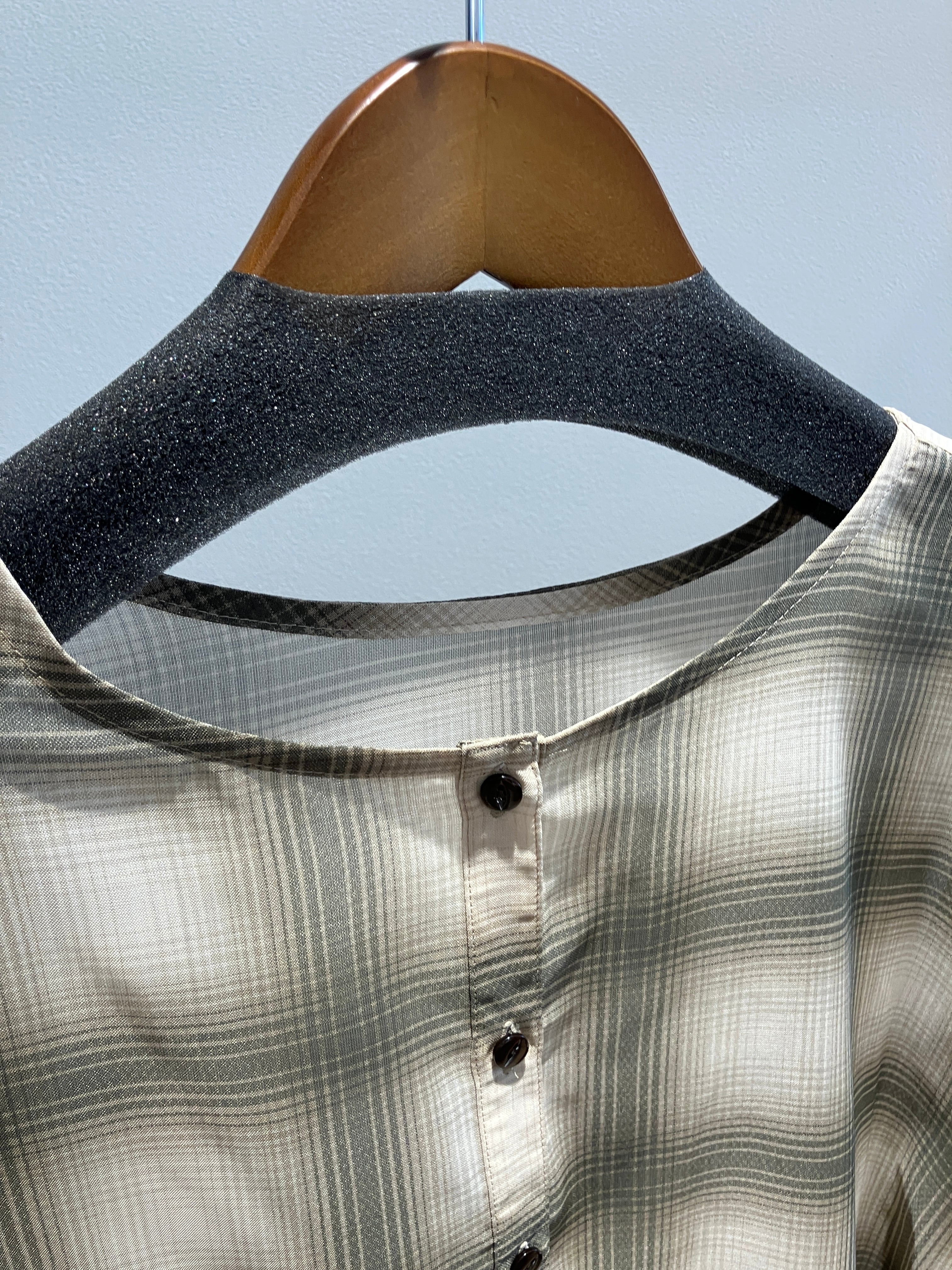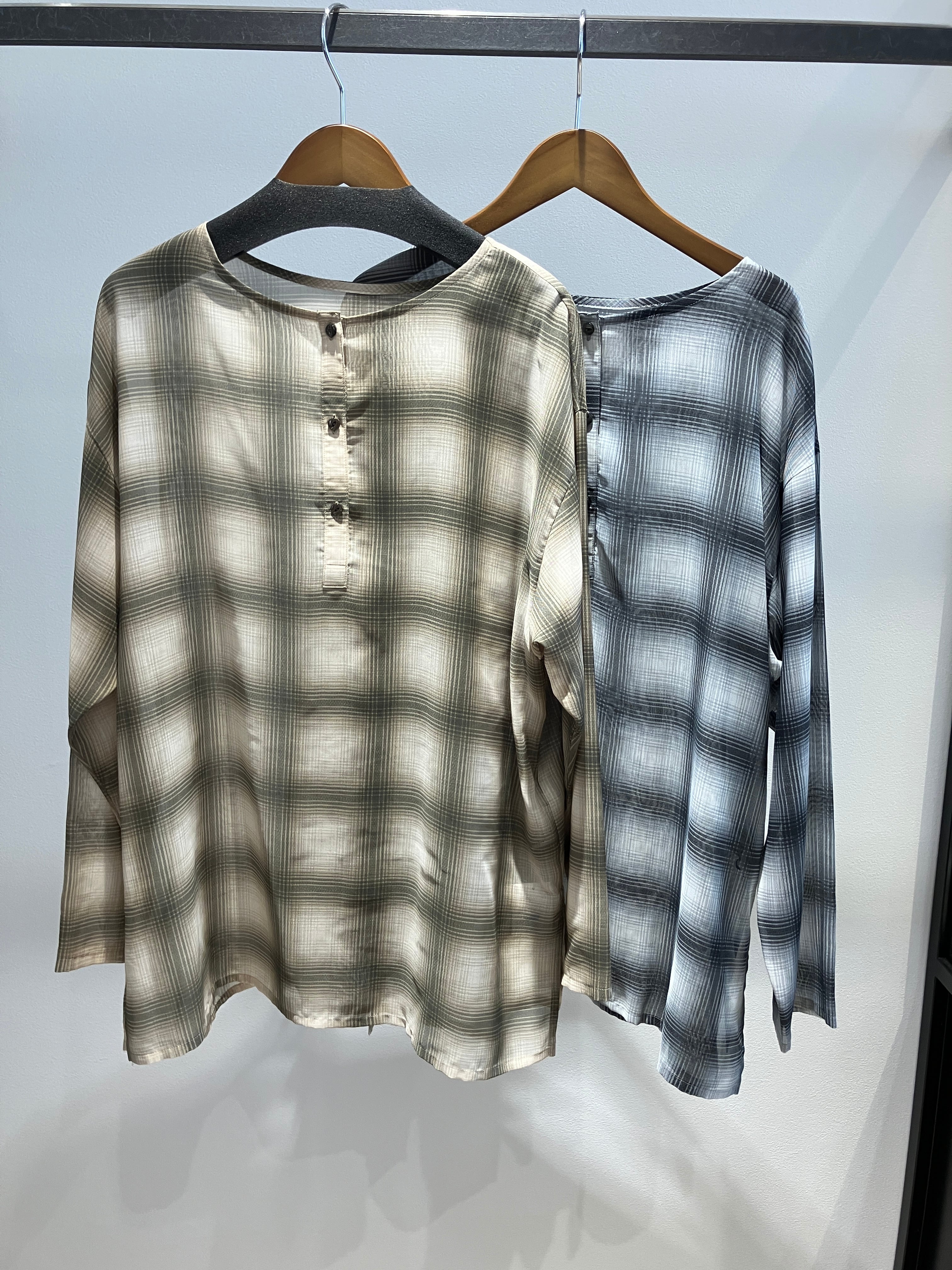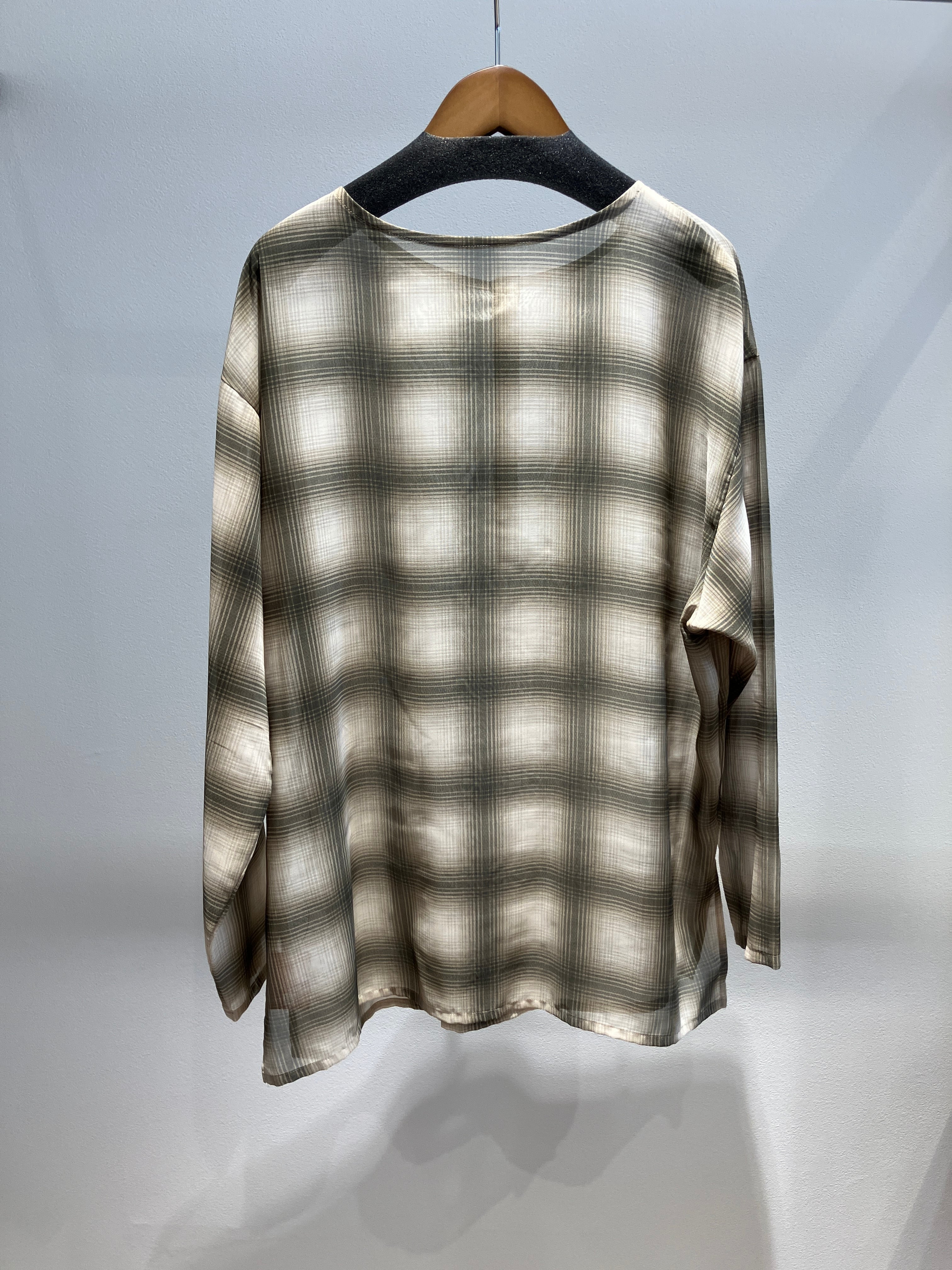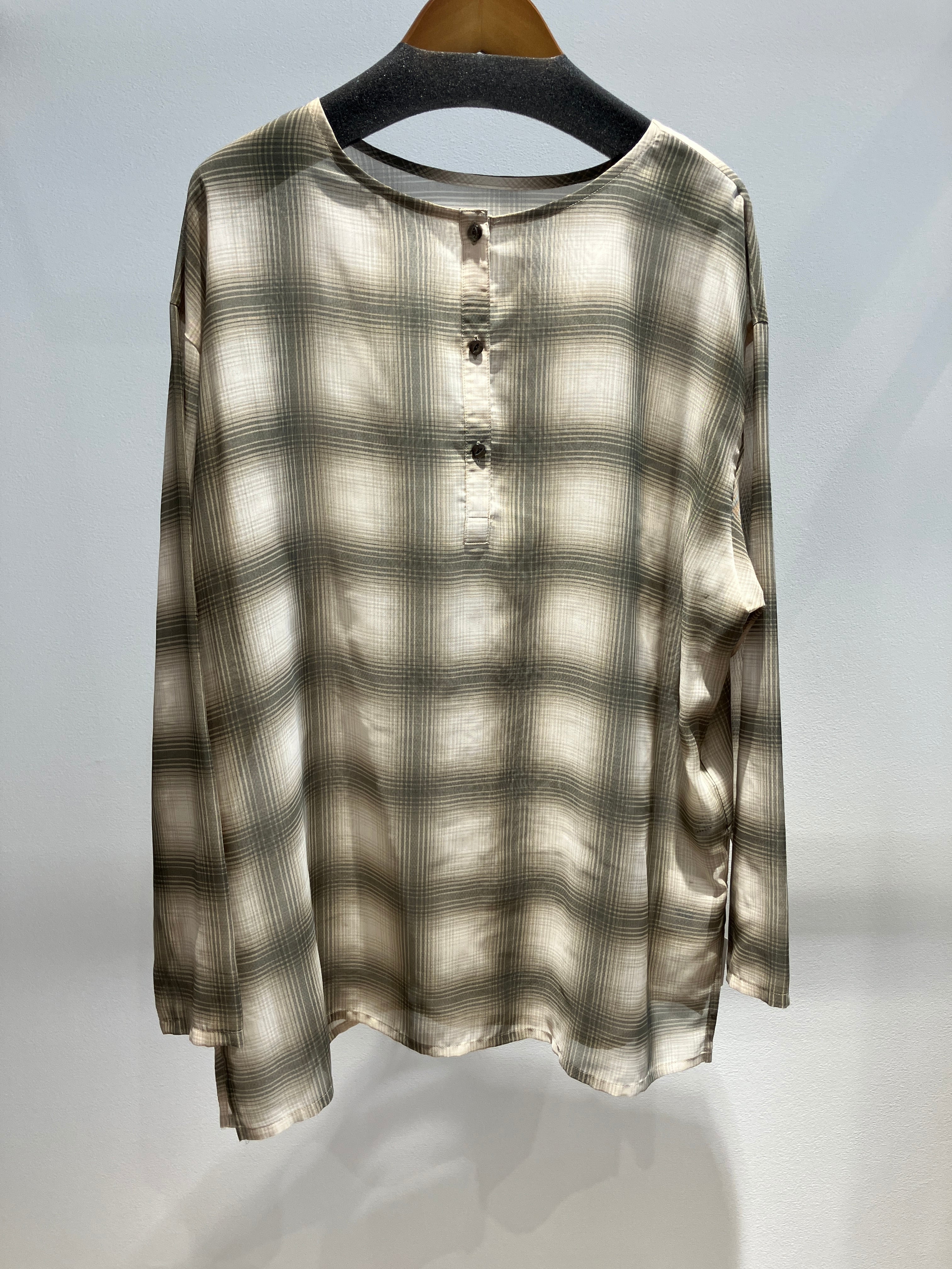 シアー感のあるボイル素材を使用した、前後着用可能なヘンリーネックブラウス。リラックス感のあるロンTのようなシルエットで、レイヤードスタイルはもちろん、一枚でもサマになる大人カジュアルスタイルにぴったりなアイテムです。オンブレーチェックは、インクジェットプリントです。