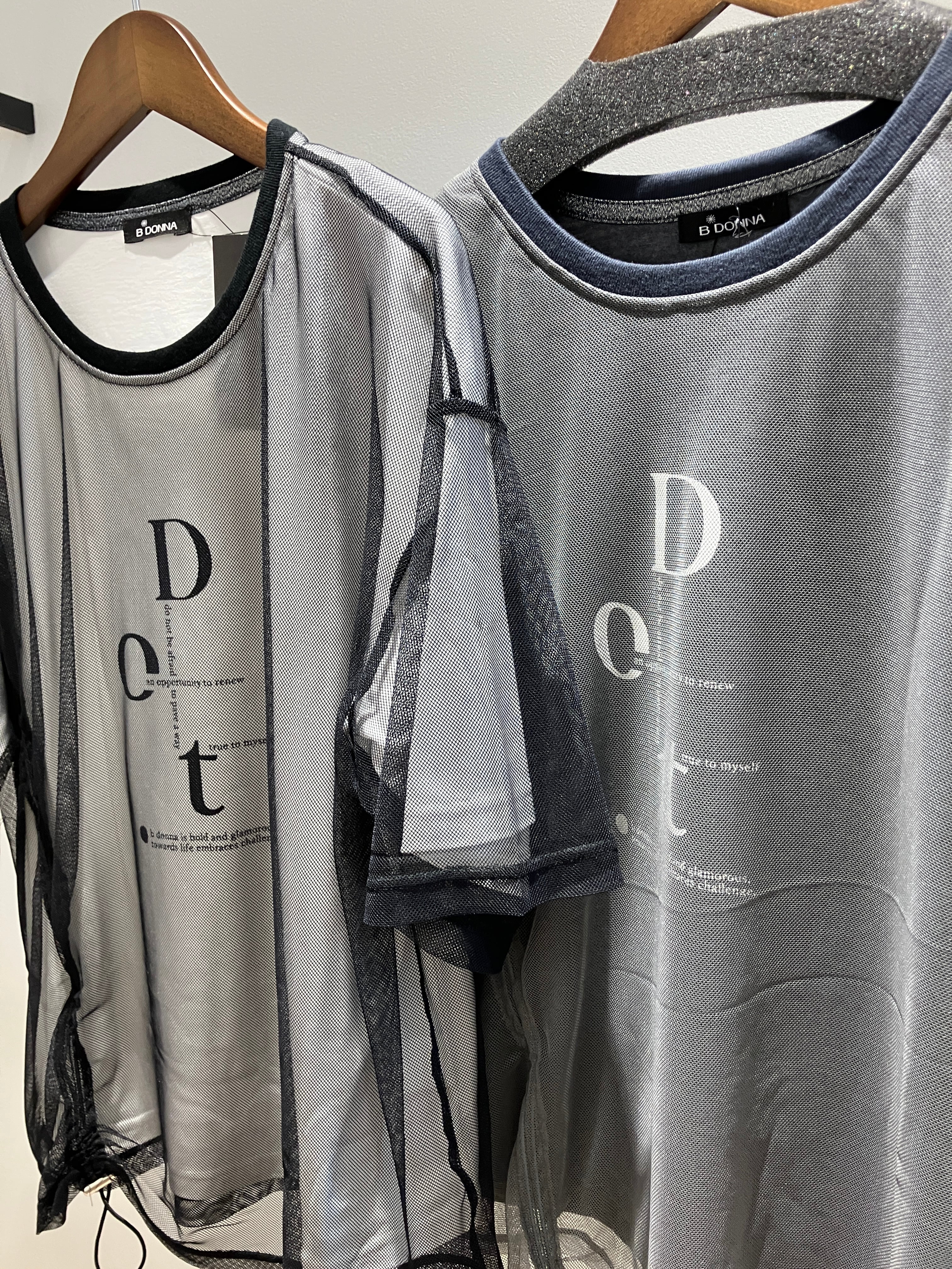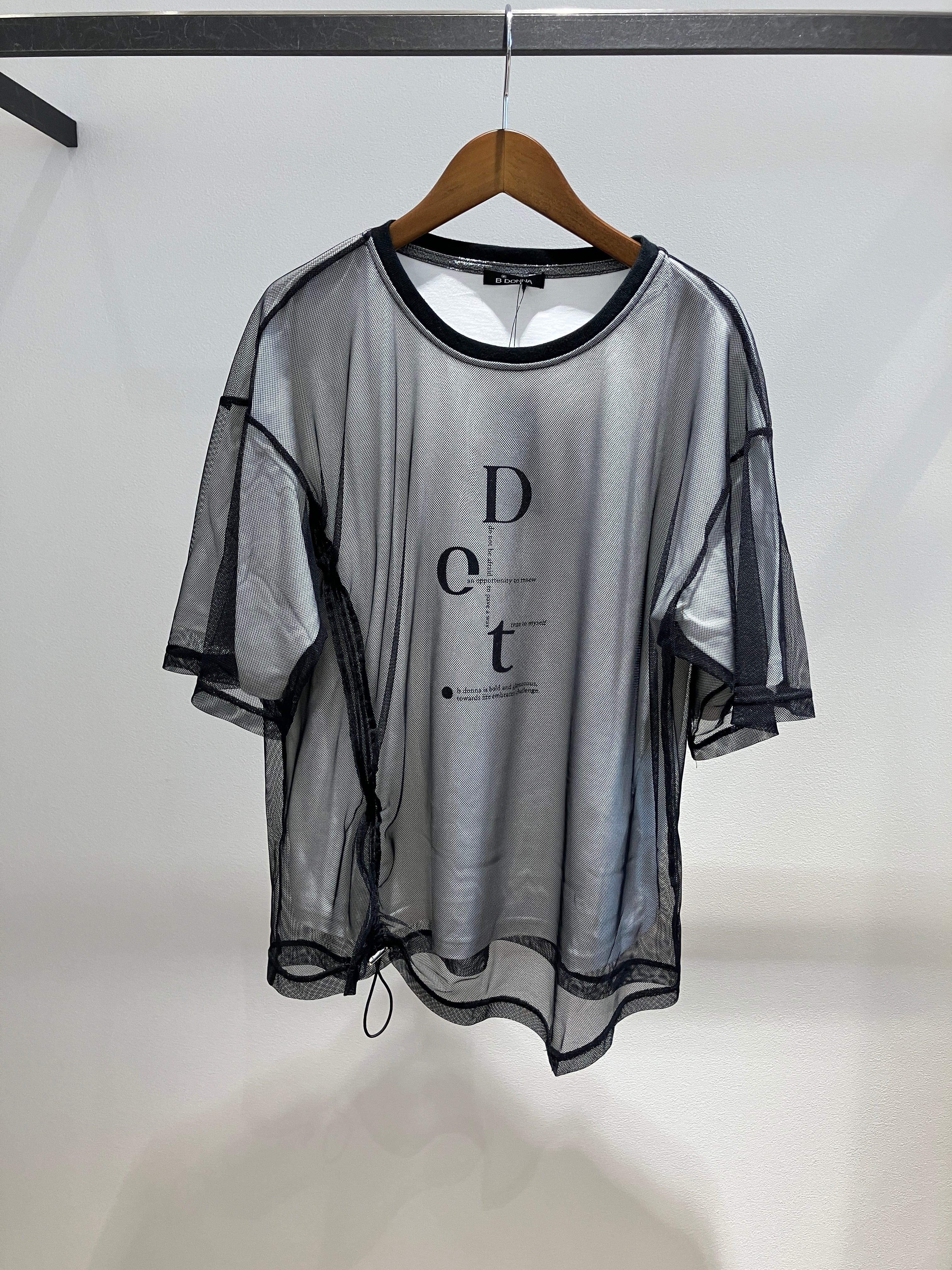 さらりとしたカットソーにメッシュを重ねて大人カジュアルに仕上げました。