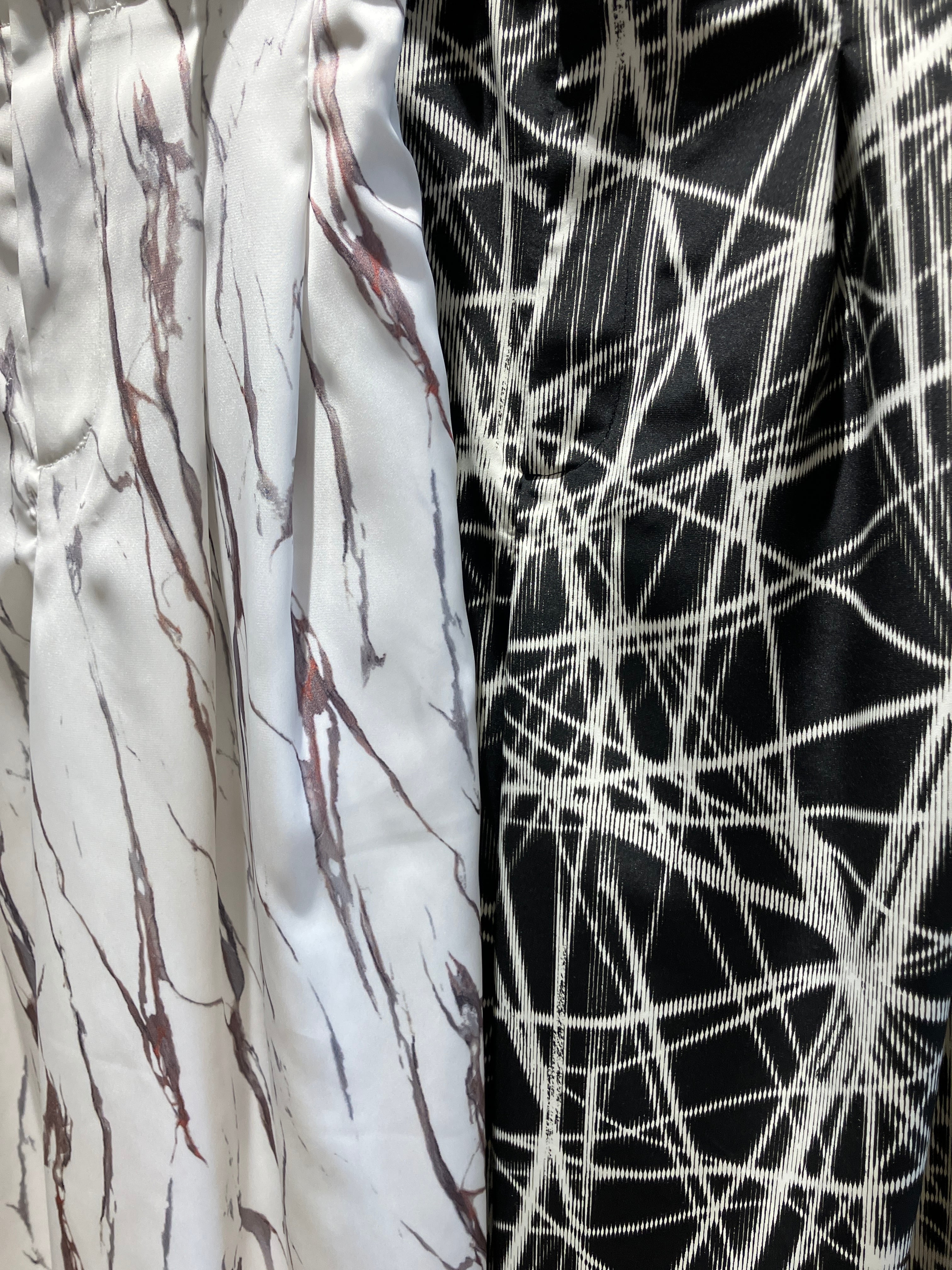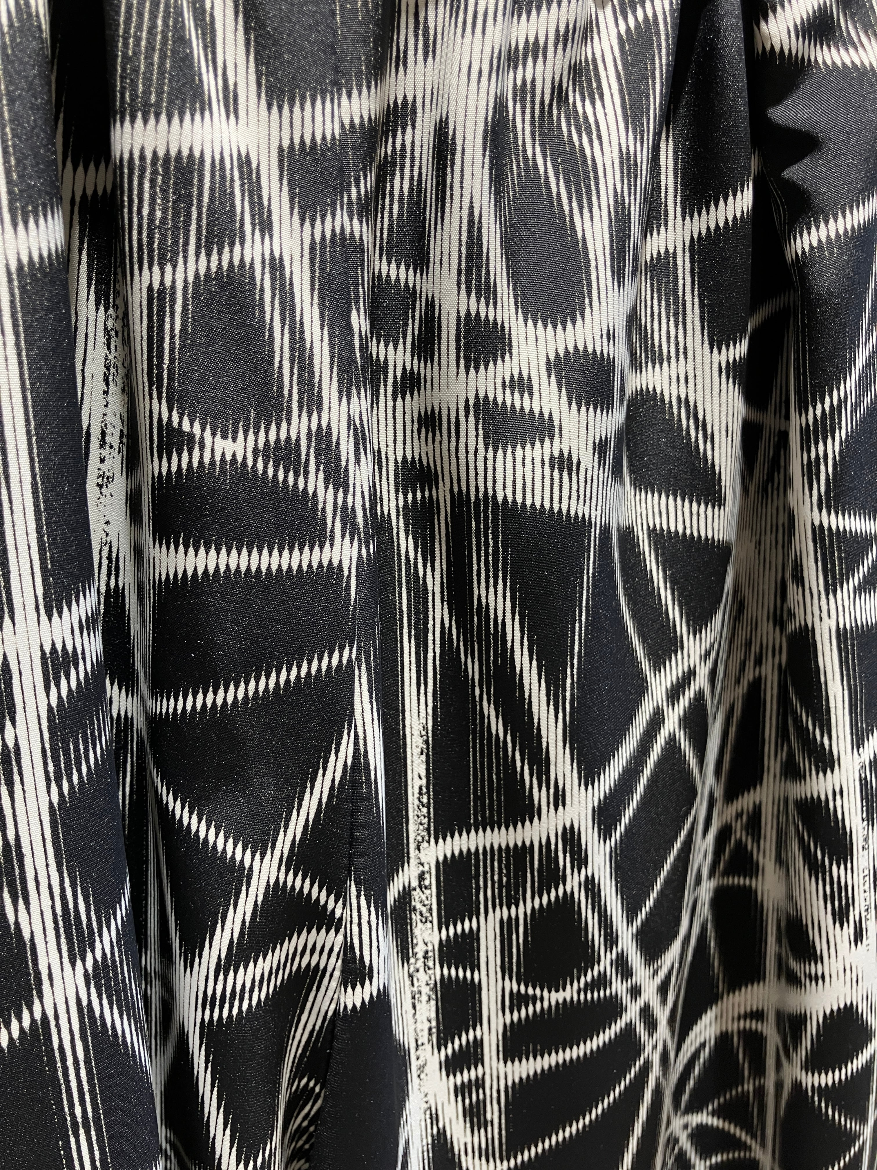 繊細な横ウネが特長の素材でしなやかな触感と適度なドレープ性があります。薄いのに透けづらく軽やかなシルエットが出る素材です。(ピーチファイユ単色プリント)