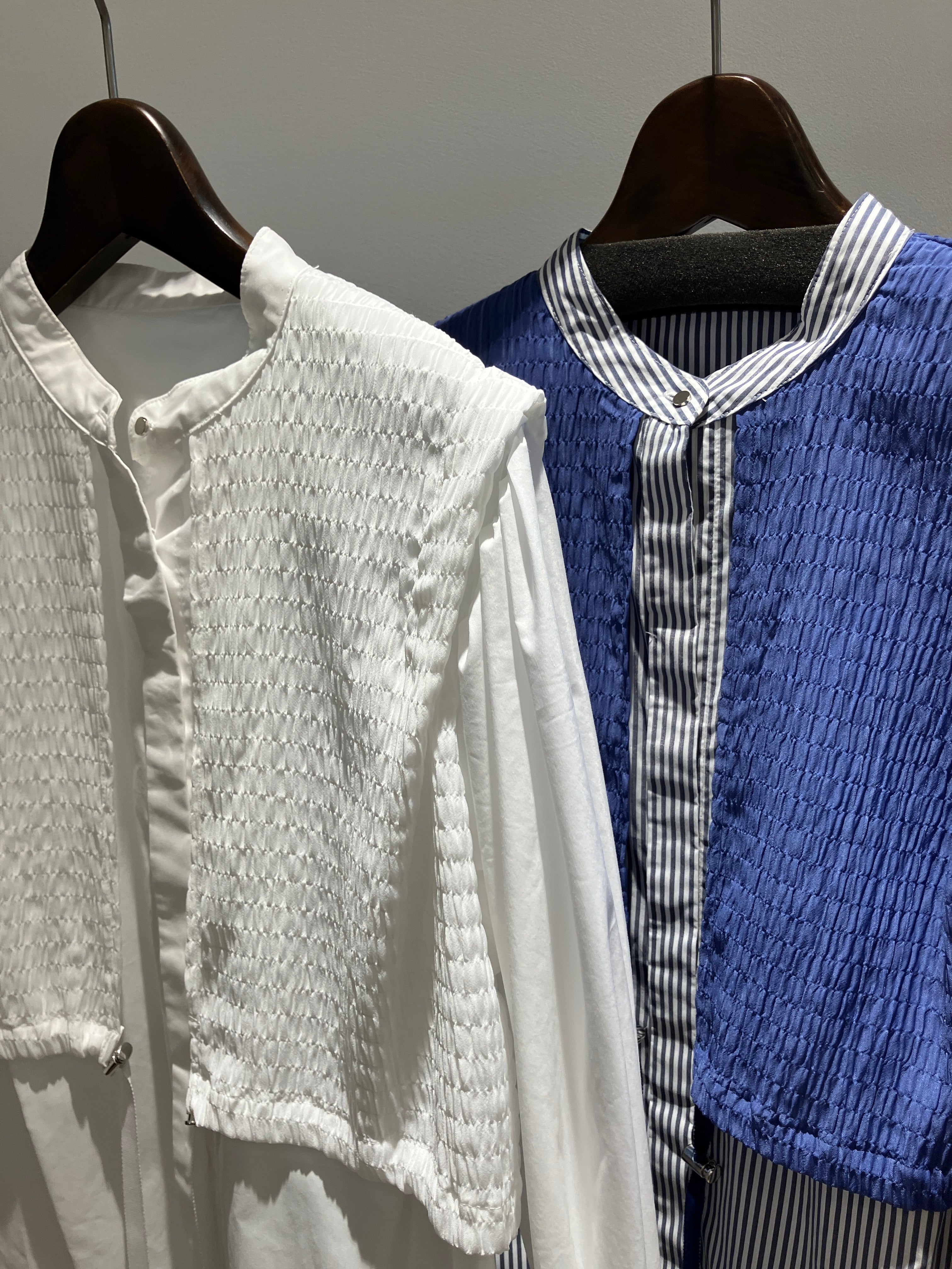 心地よいハリ感を持つ薄手素材。さらりとしたタッチとほどよいつやのある表情が特徴です。体のラインを綺麗に出してくれるストレッチ性が嬉しい生地です。(先染コットン/ポリエステルウエザーストレッチ)