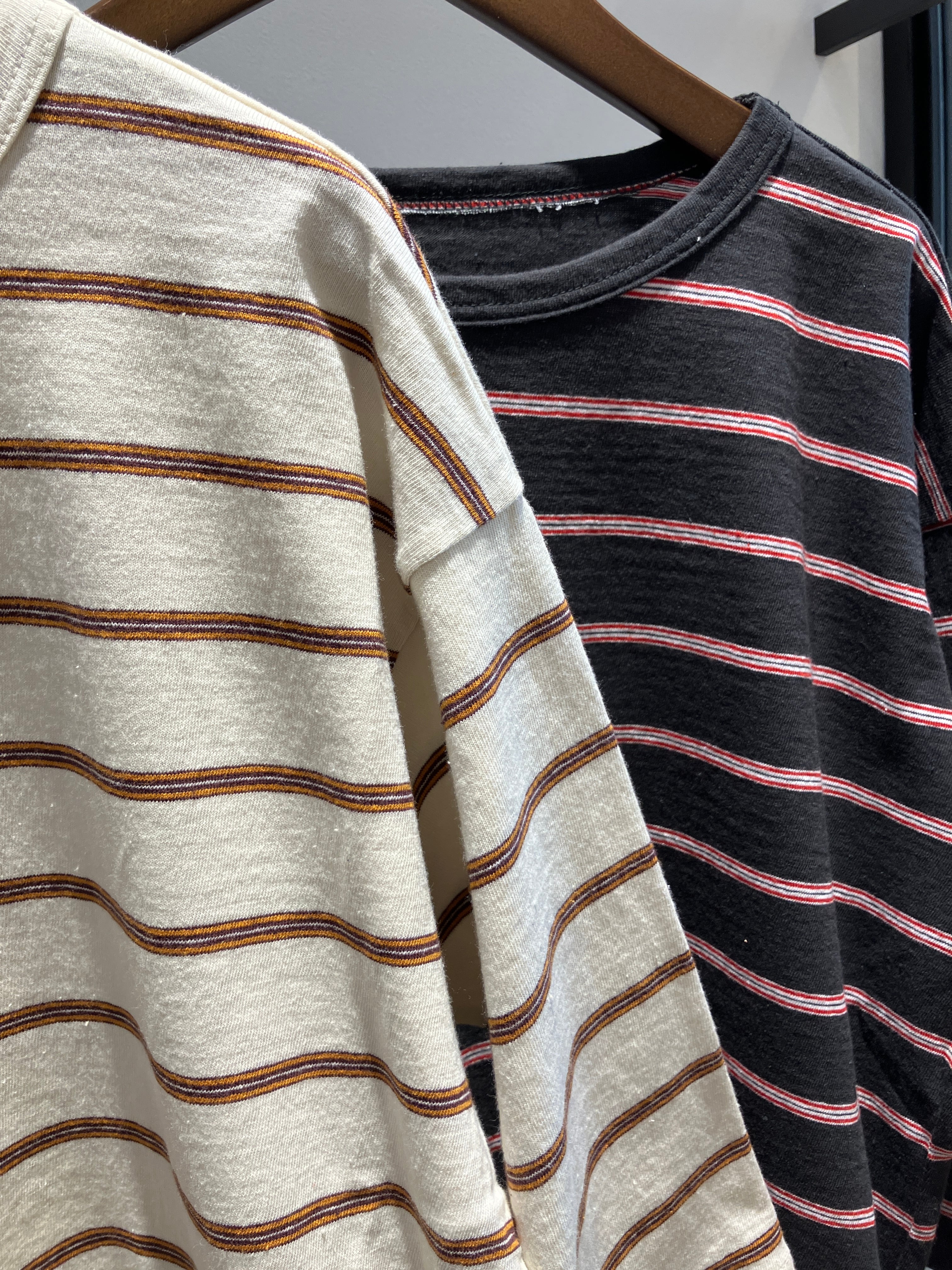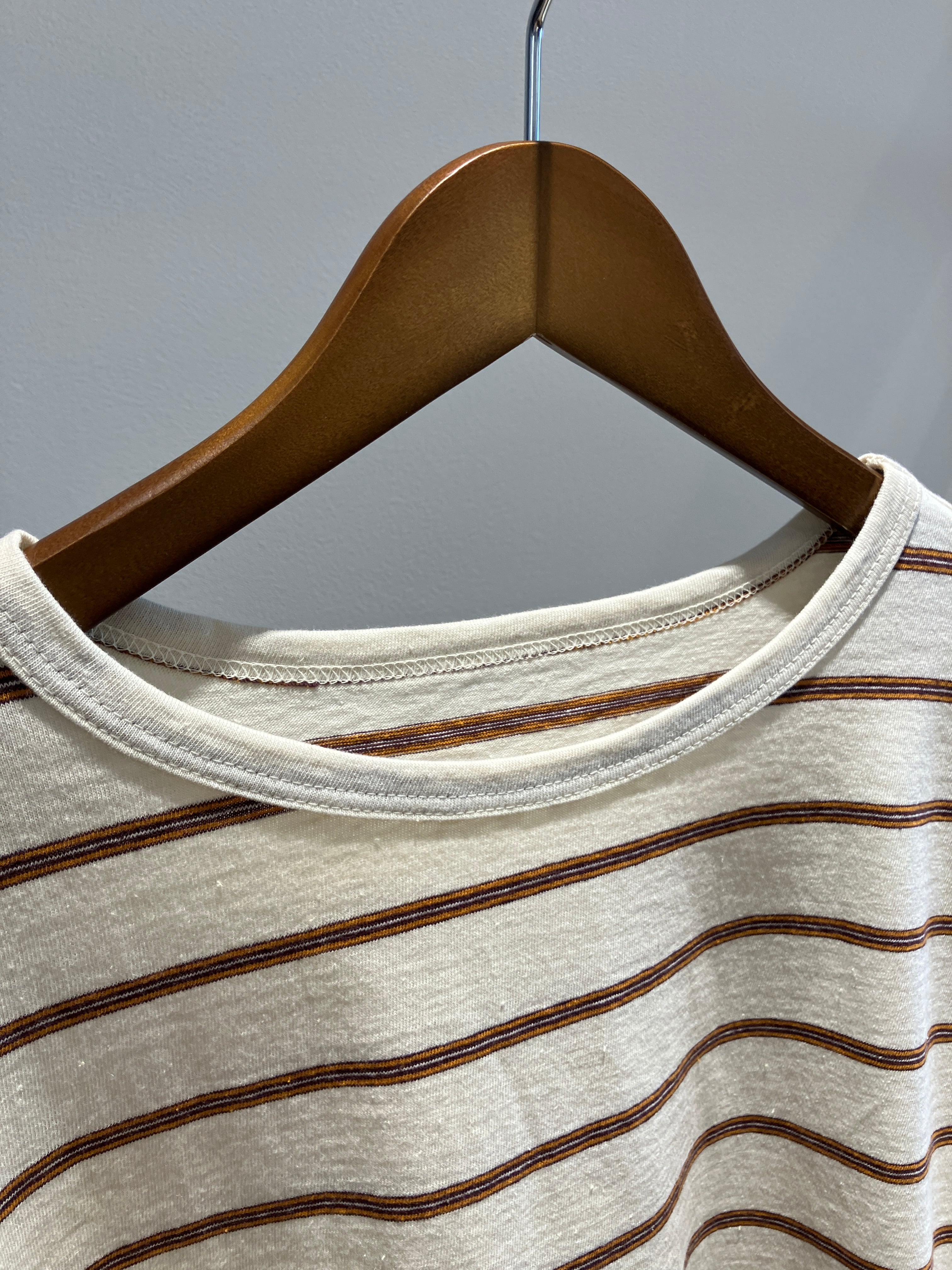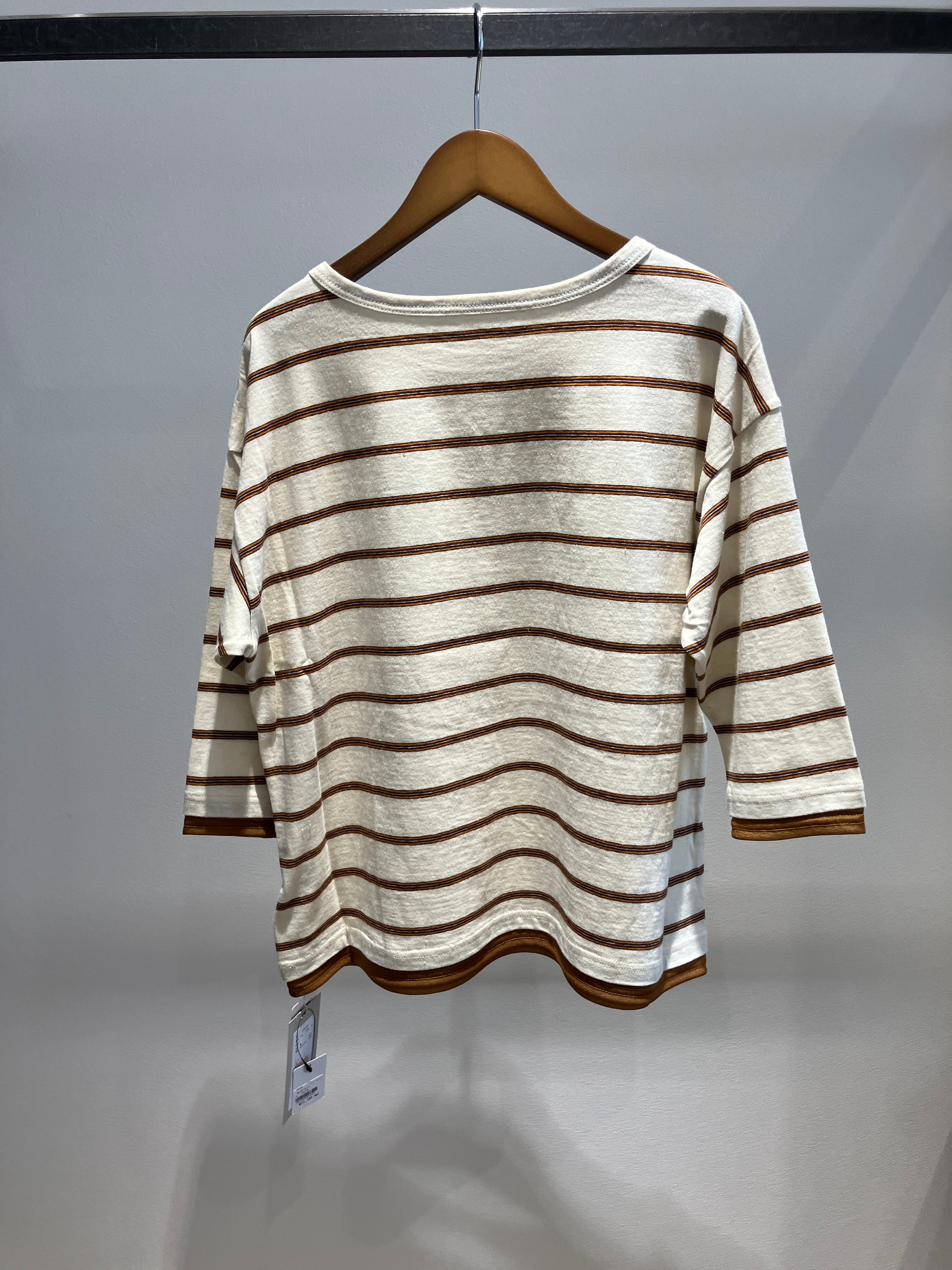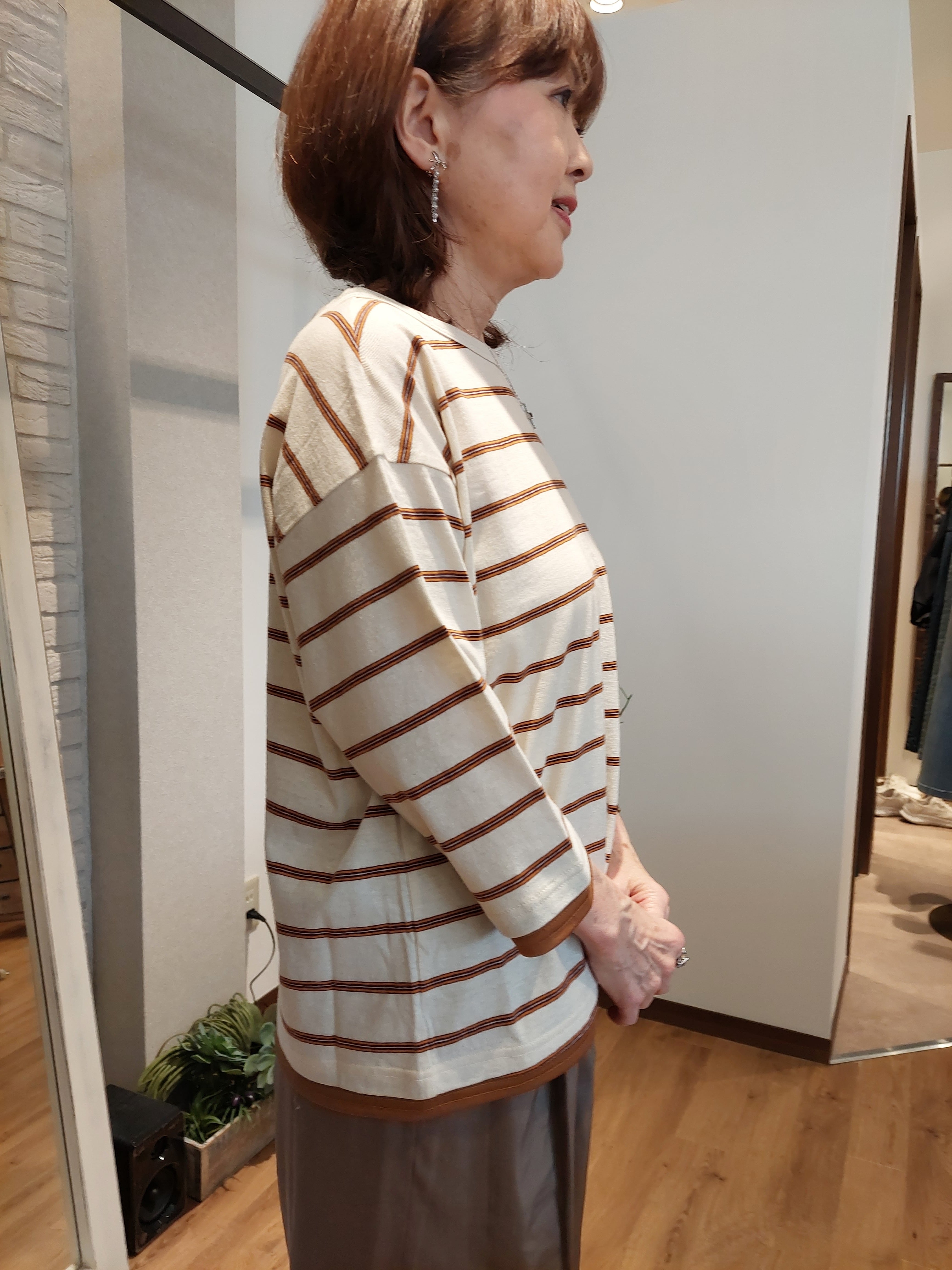 レトロな配色のマルチボーダー天竺を使用した七分袖のTシャツ。大人女性に似合う、緩めのネックラインにしており、ジャケットなどのインナーとしても着やすいよう、程よいゆとりのあるシルエットに仕上げています。