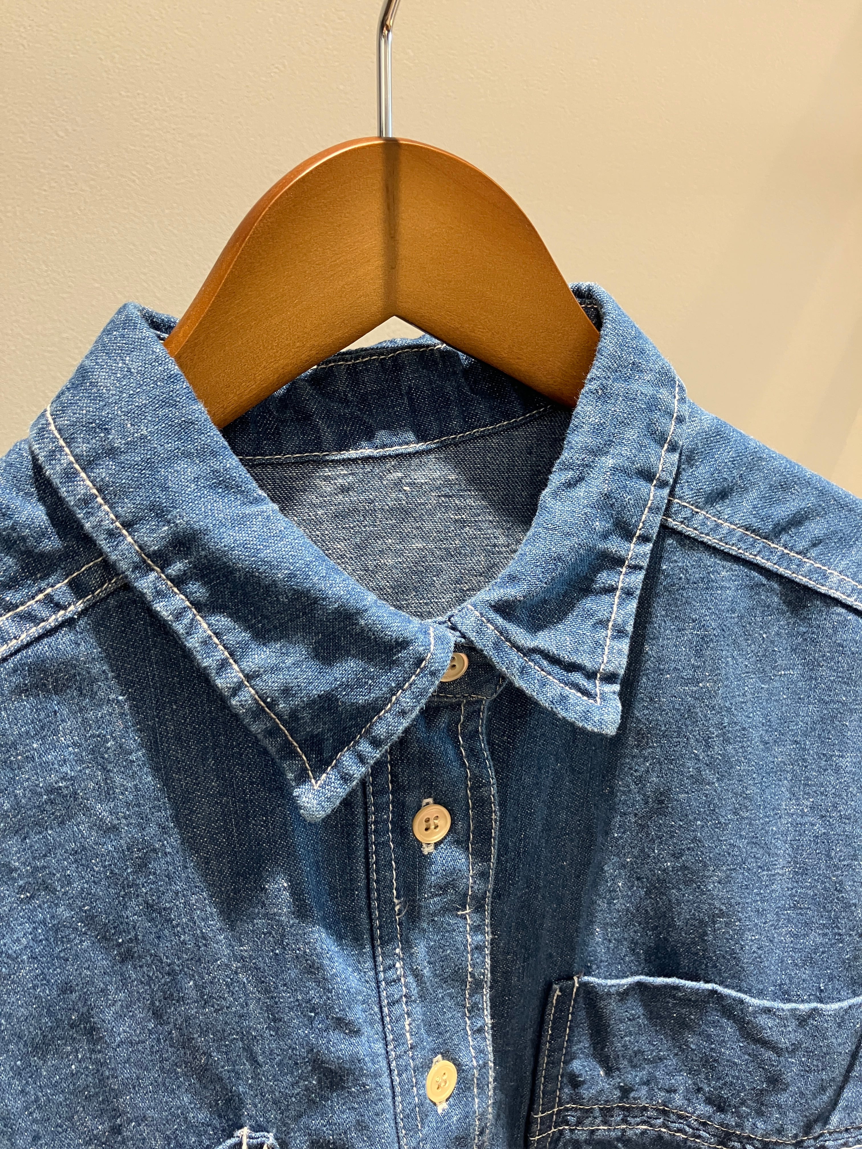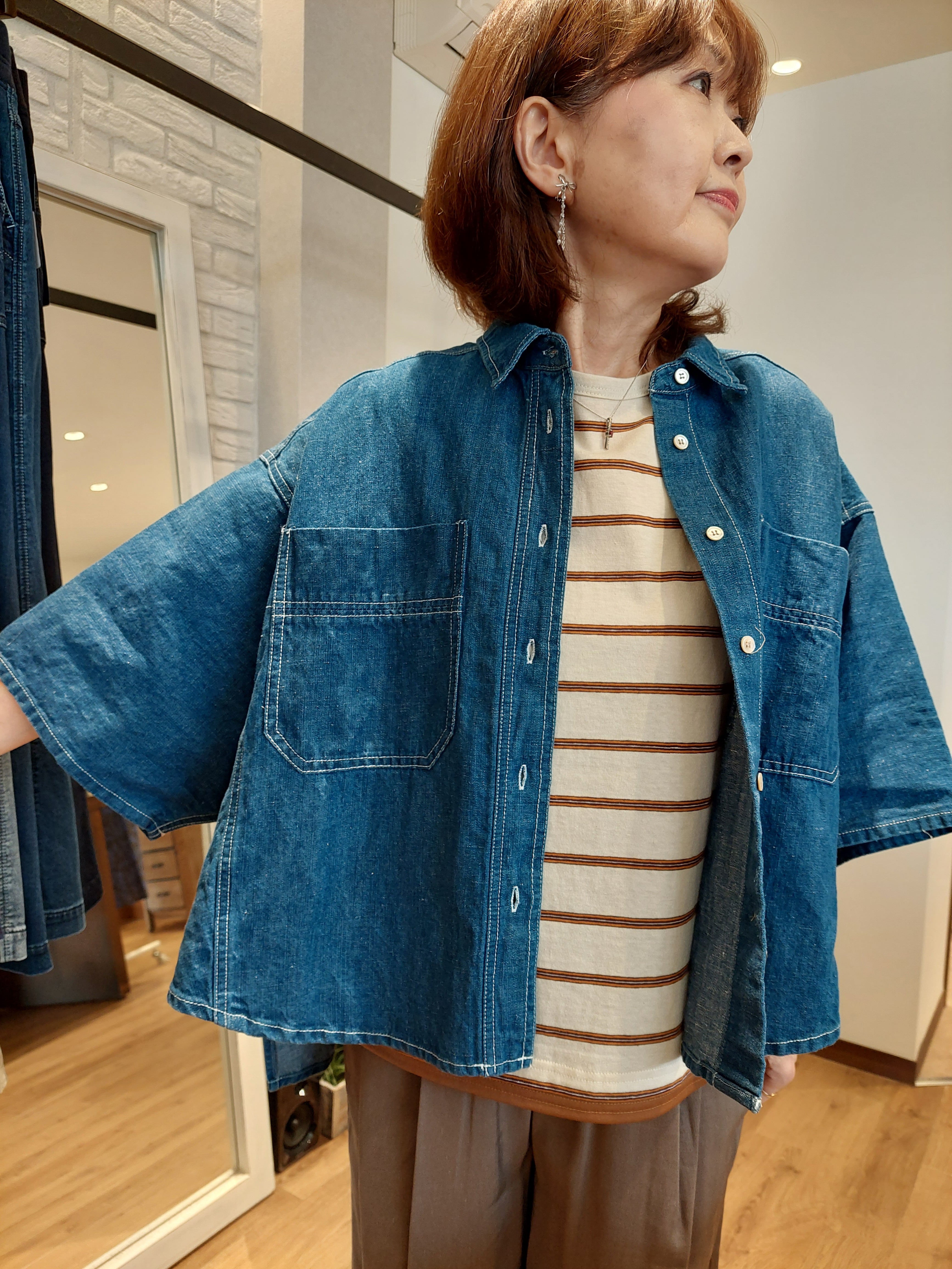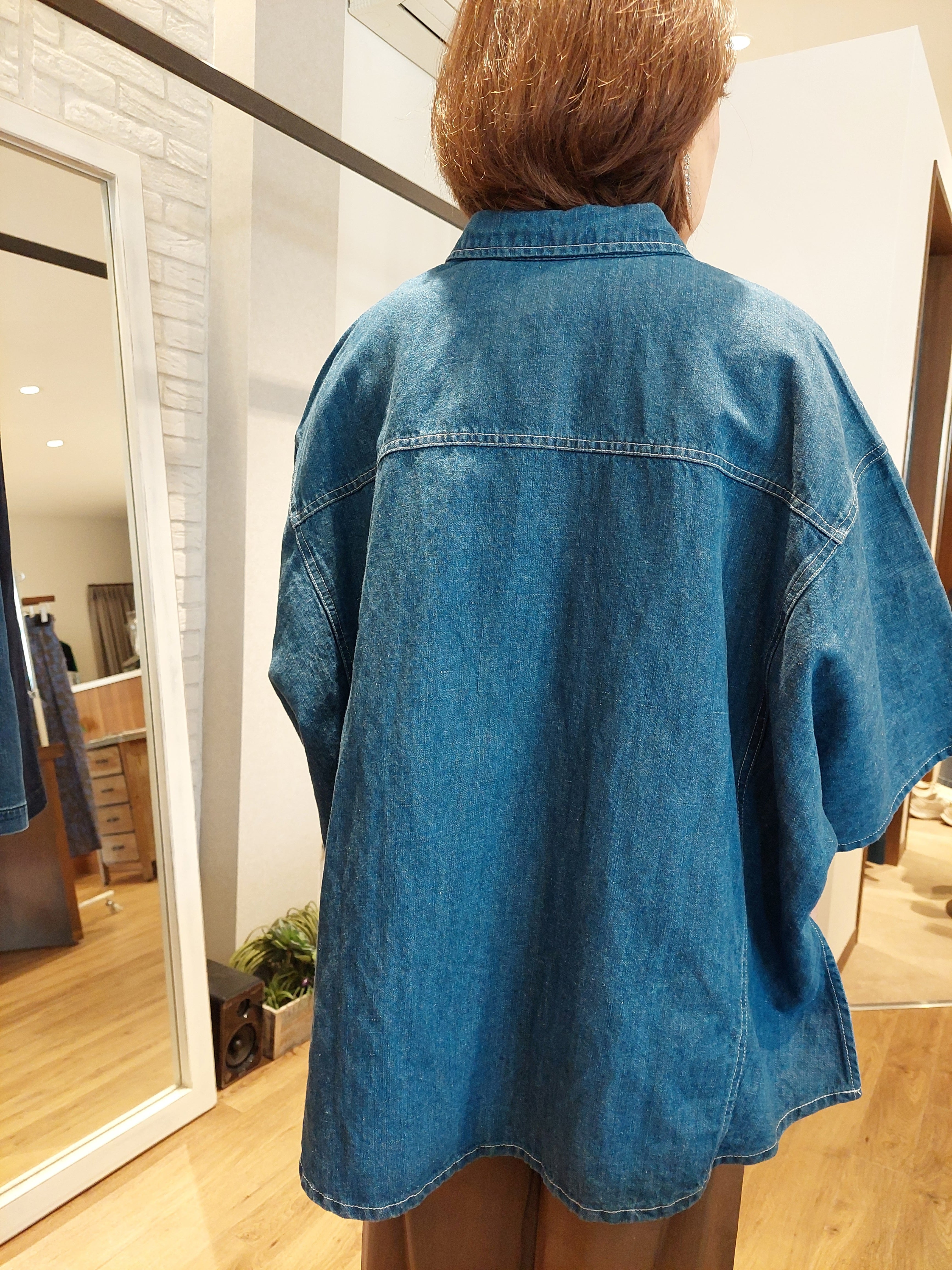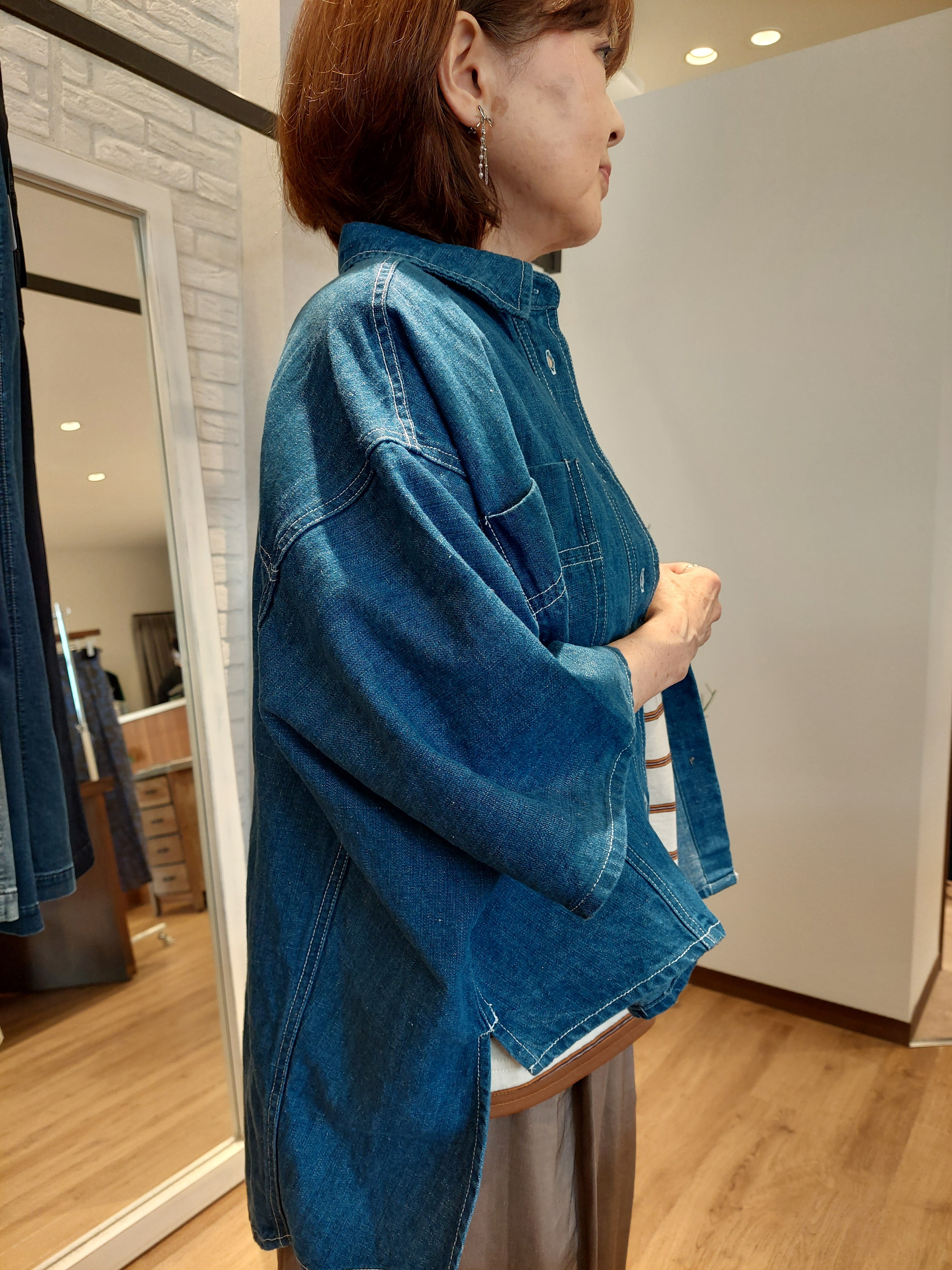 デニム特有のオーセンティックな表情に、さらりとしたリネン混の清涼感をプラスしたデニムブラウス。麻をブレンドすることで、通常のデニムよりも軽やかで、汗ばむ季節でも肌離れの良いドライな着心地を実現しました。ゆったりとしたドルマンスリーブが、肩から腕にかけてのラインを優しくカバーしつつ、こなれたニュアンスのシルエットを演出。程よいハリ感があるため、一枚で着ても身体のラインを拾いすぎず、立体的に決まります。羽織りとしても優秀で、ボタンを閉めてプルオーバー風に着こなすのもおすすめ。使い込むほどに馴染む風合いを楽しみながら、長く愛用したい一着です。