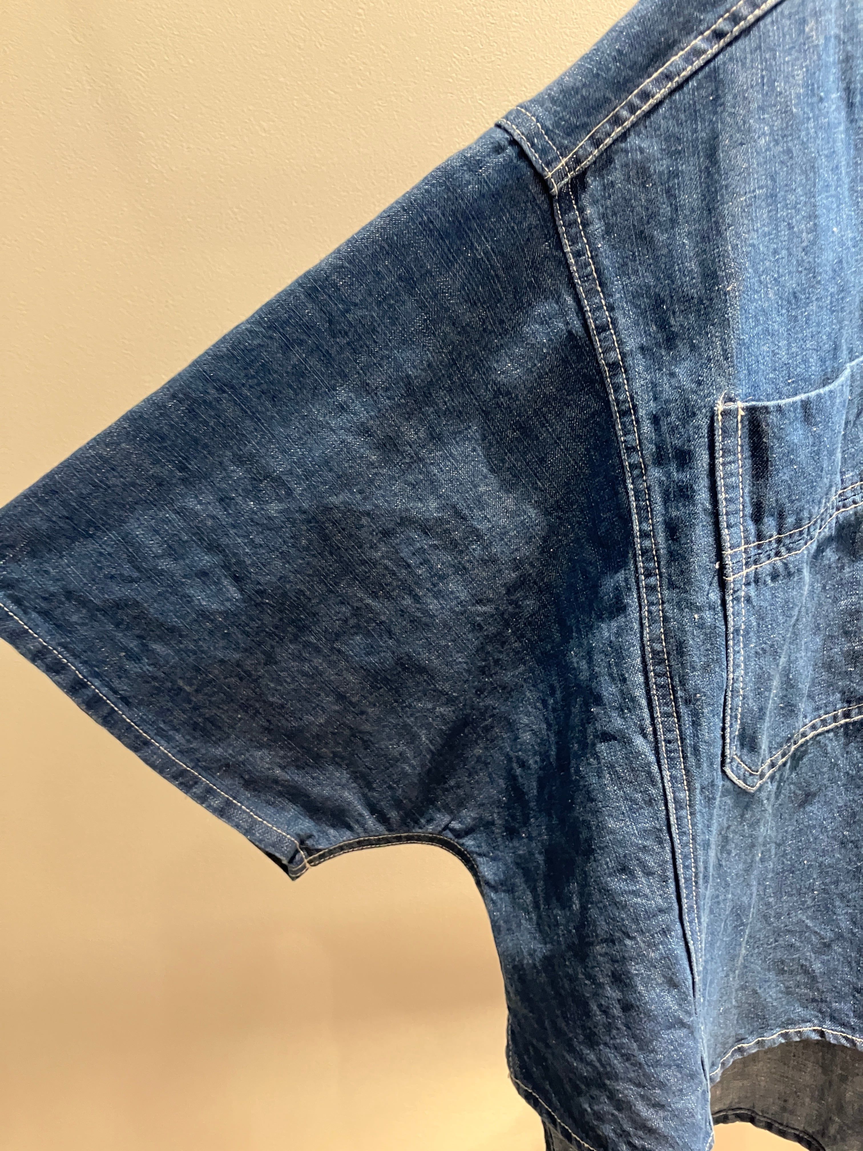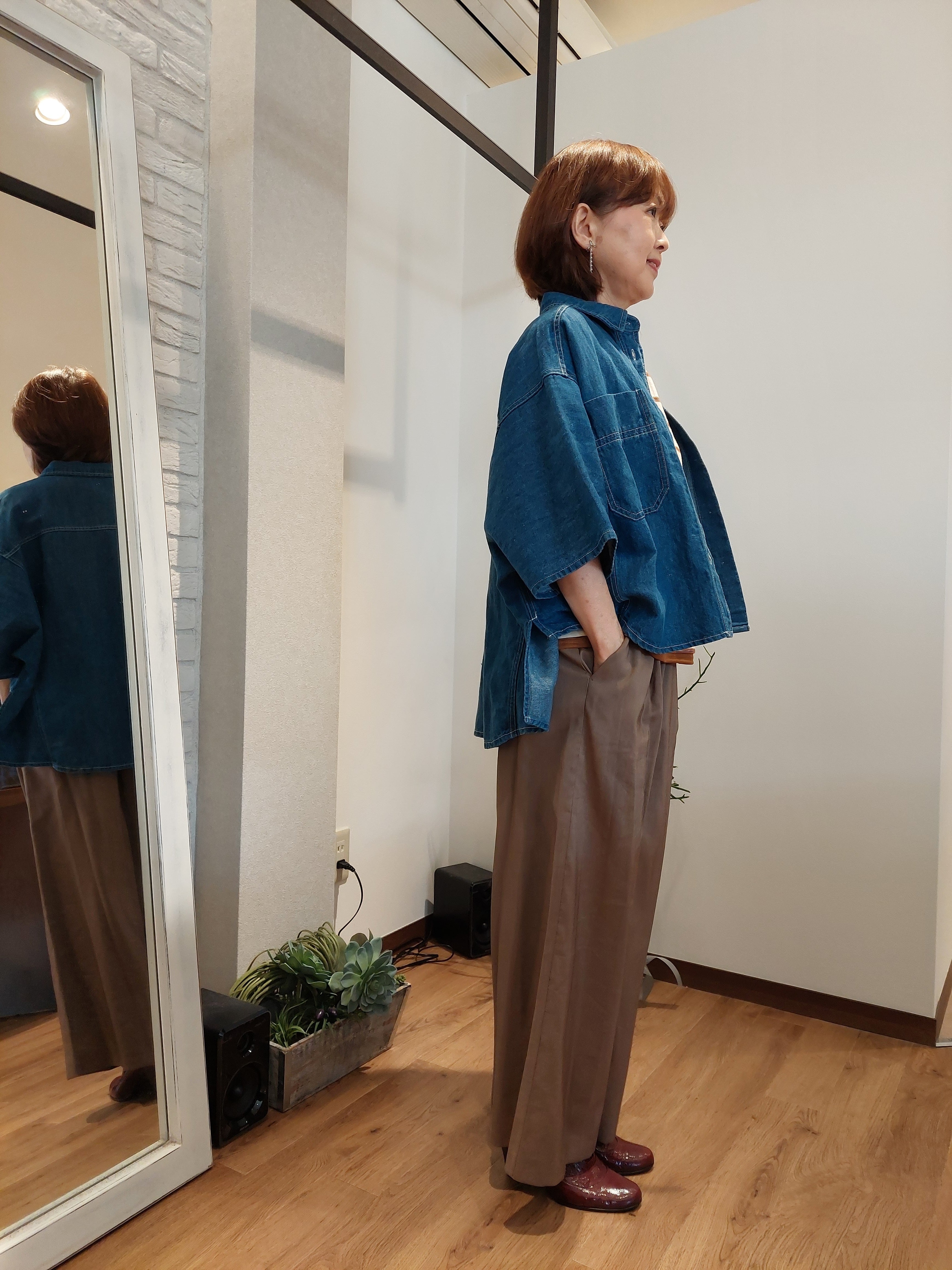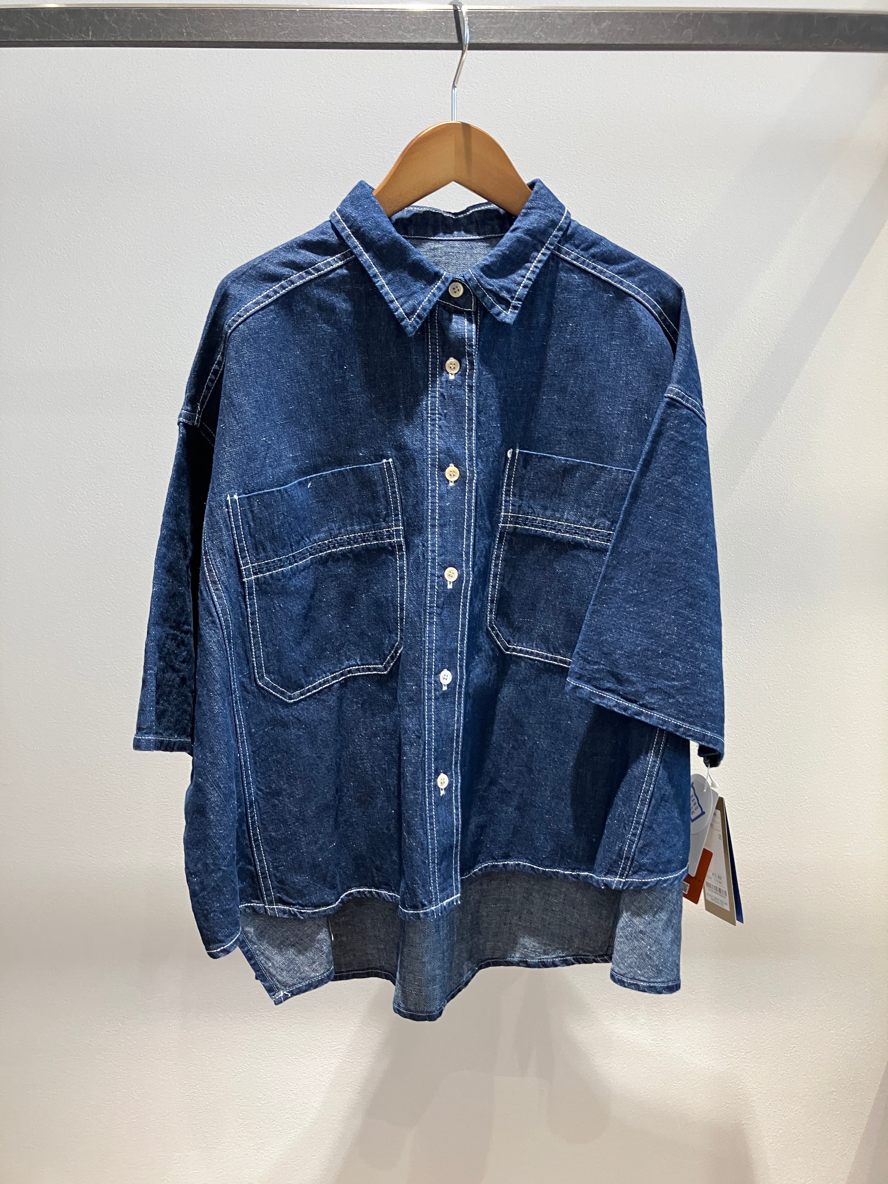 デニム特有のオーセンティックな表情に、さらりとしたリネン混の清涼感をプラスしたデニムブラウス。麻をブレンドすることで、通常のデニムよりも軽やかで、汗ばむ季節でも肌離れの良いドライな着心地を実現しました。ゆったりとしたドルマンスリーブが、肩から腕にかけてのラインを優しくカバーしつつ、こなれたニュアンスのシルエットを演出。程よいハリ感があるため、一枚で着ても身体のラインを拾いすぎず、立体的に決まります。羽織りとしても優秀で、ボタンを閉めてプルオーバー風に着こなすのもおすすめ。使い込むほどに馴染む風合いを楽しみながら、長く愛用したい一着です。