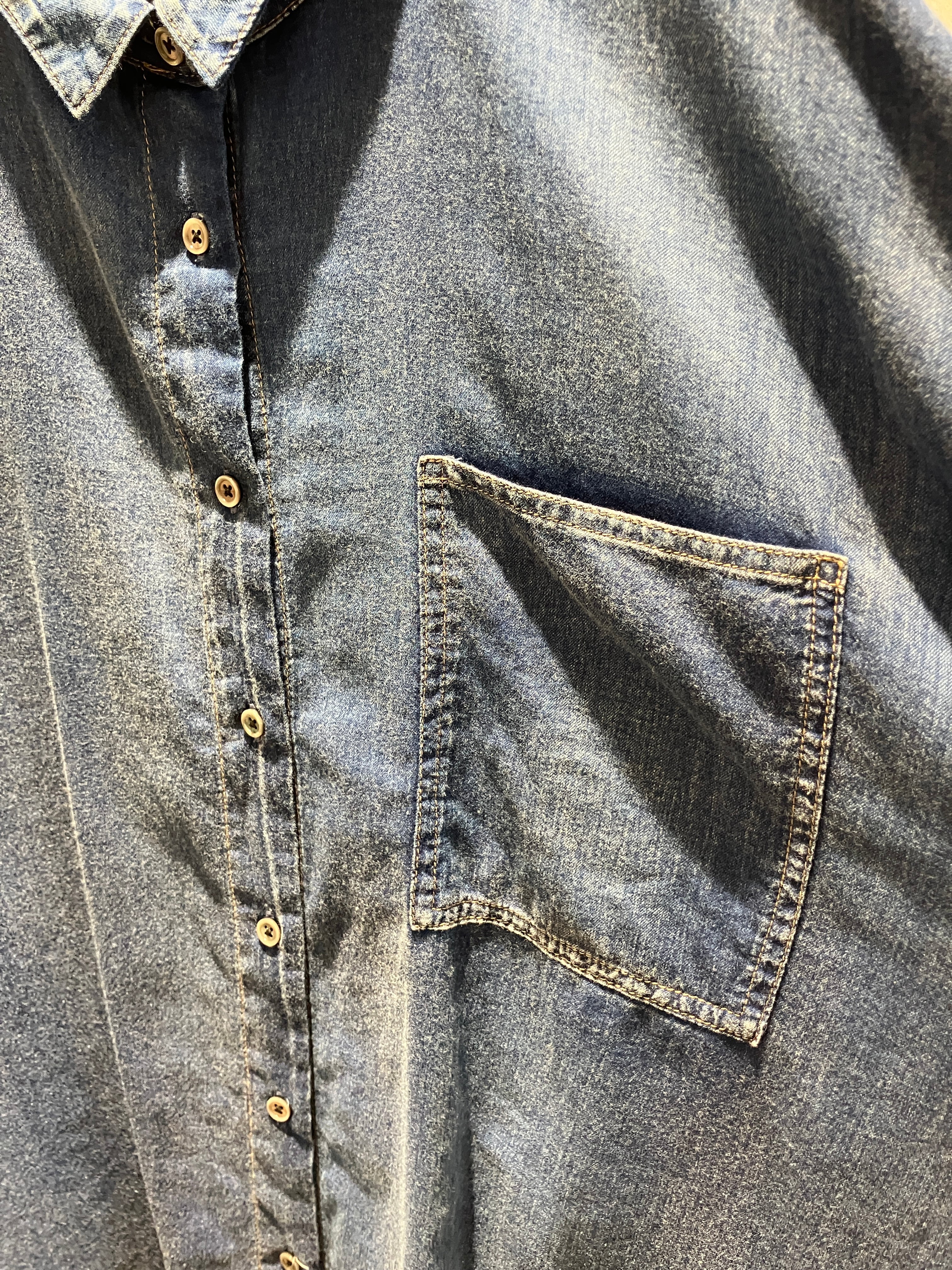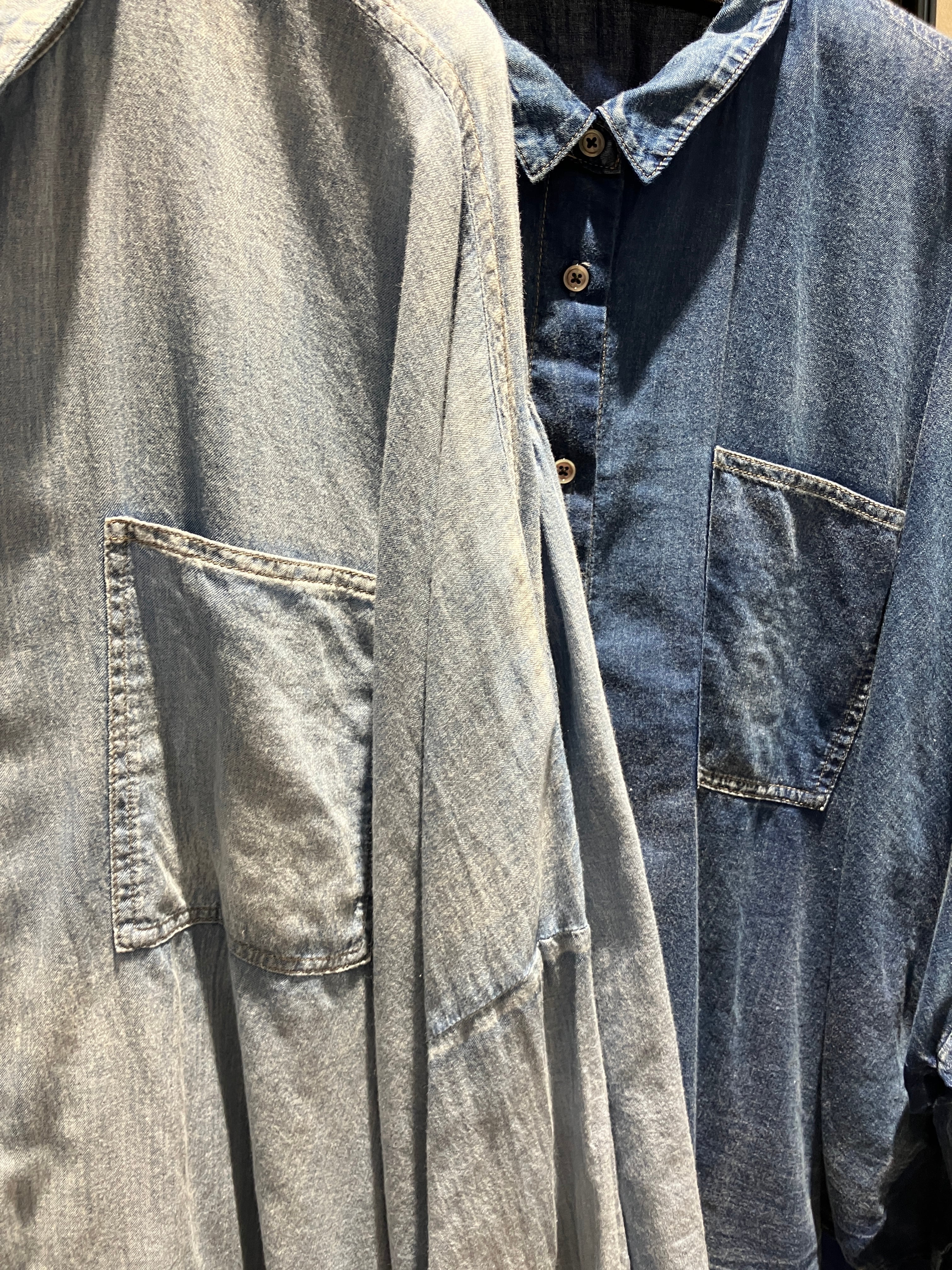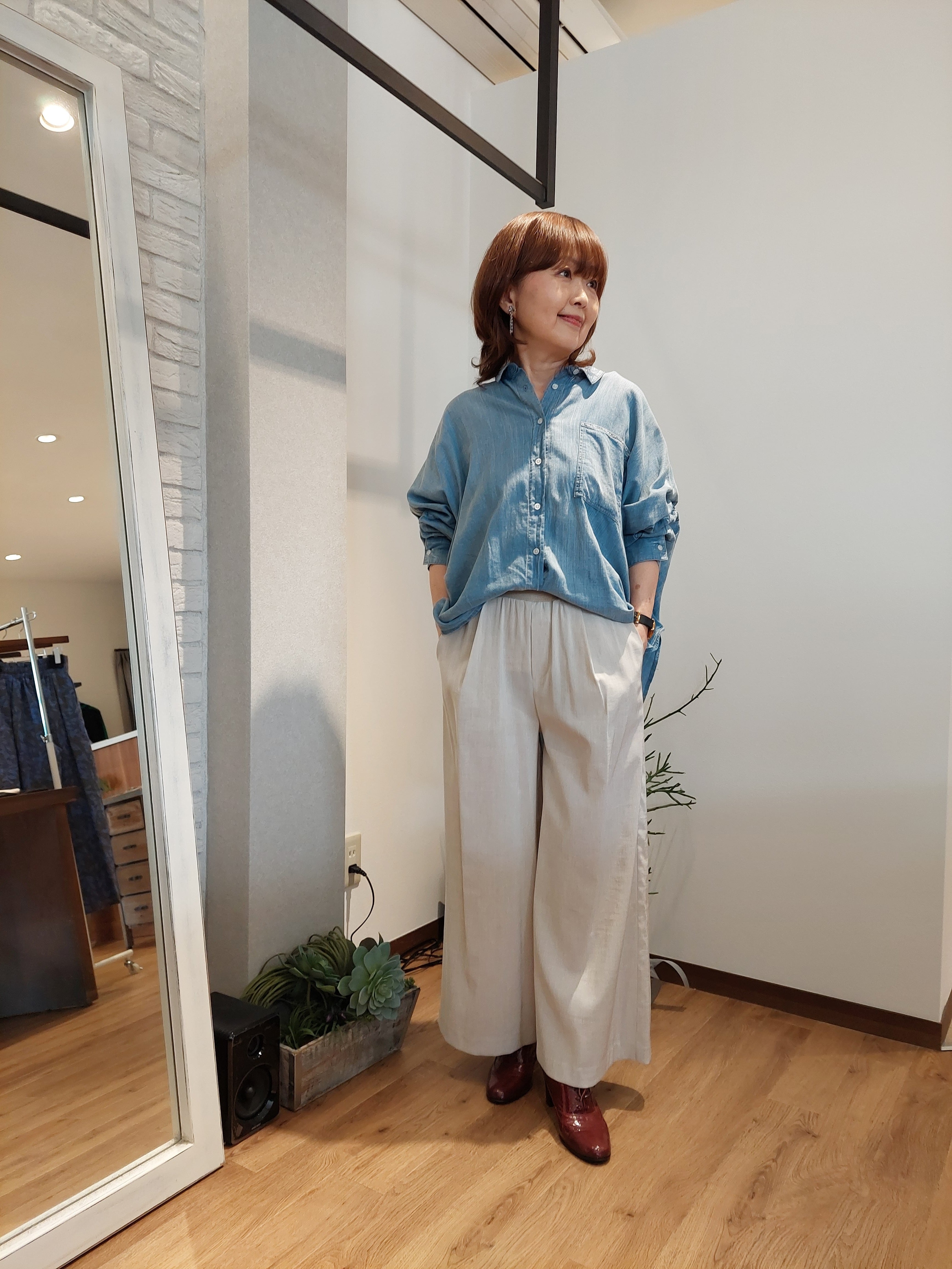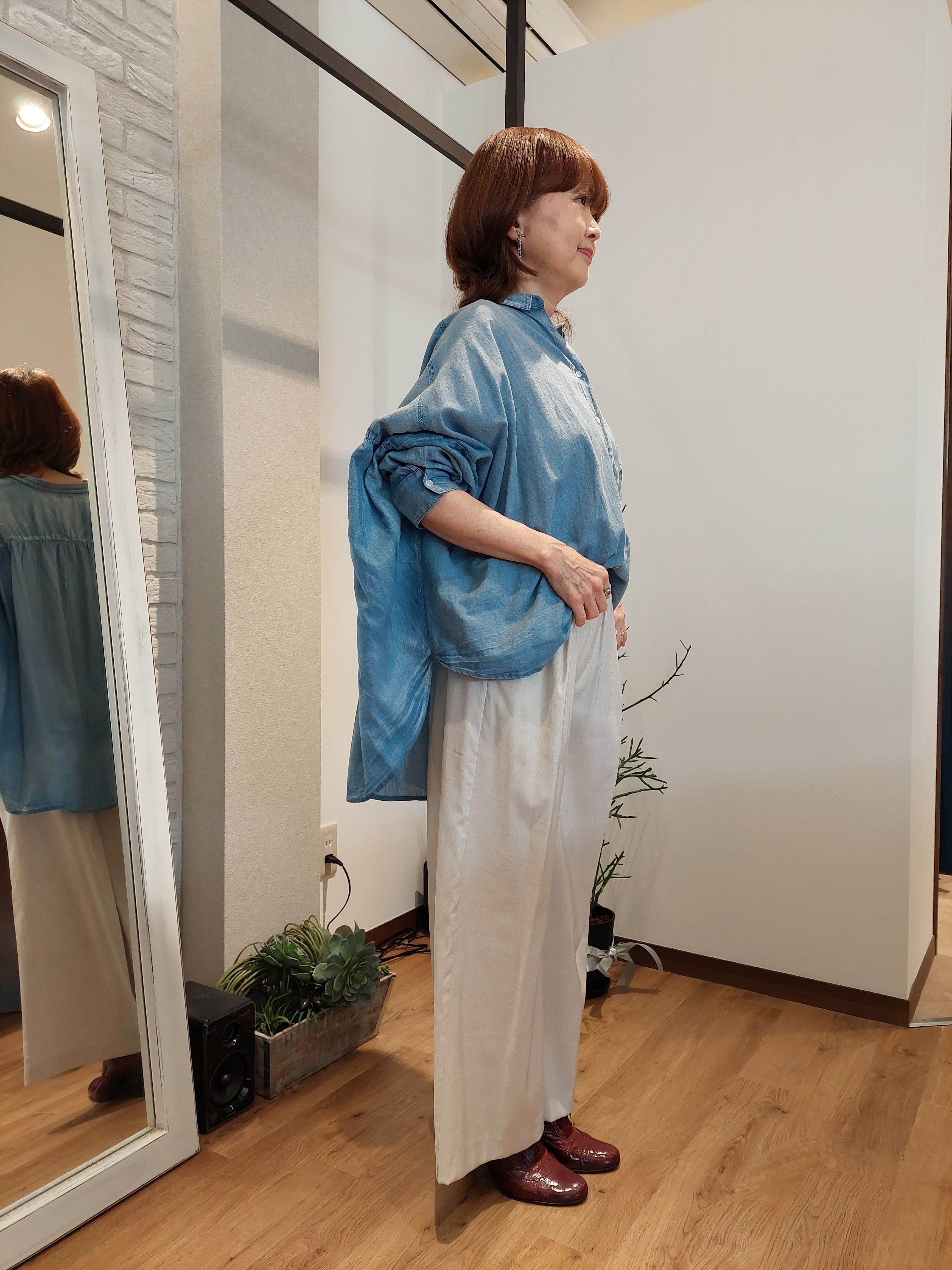 カジュアルの定番であるデニムに、旬のニュアンスをプラスした「シアーデニムバックギャザーシャツ」。最大の魅力は、肌を美しく透かす僅かなシアー感。デニム特有の表情はそのままに、驚くほど軽やかで上品な透け感があるため、ロングスリーブでも重たくならず、涼しげな印象を与えてくれます。ヒップ周りを優しく包み込む長めの着丈と、背中にたっぷり施されたバックギャザーが、動くたびにドラマティックな揺れ感を演出。気になるラインをカバーしつつ、抜き襟でさらりと羽織るだけでこなれた大人の「余裕」が漂う一着です。