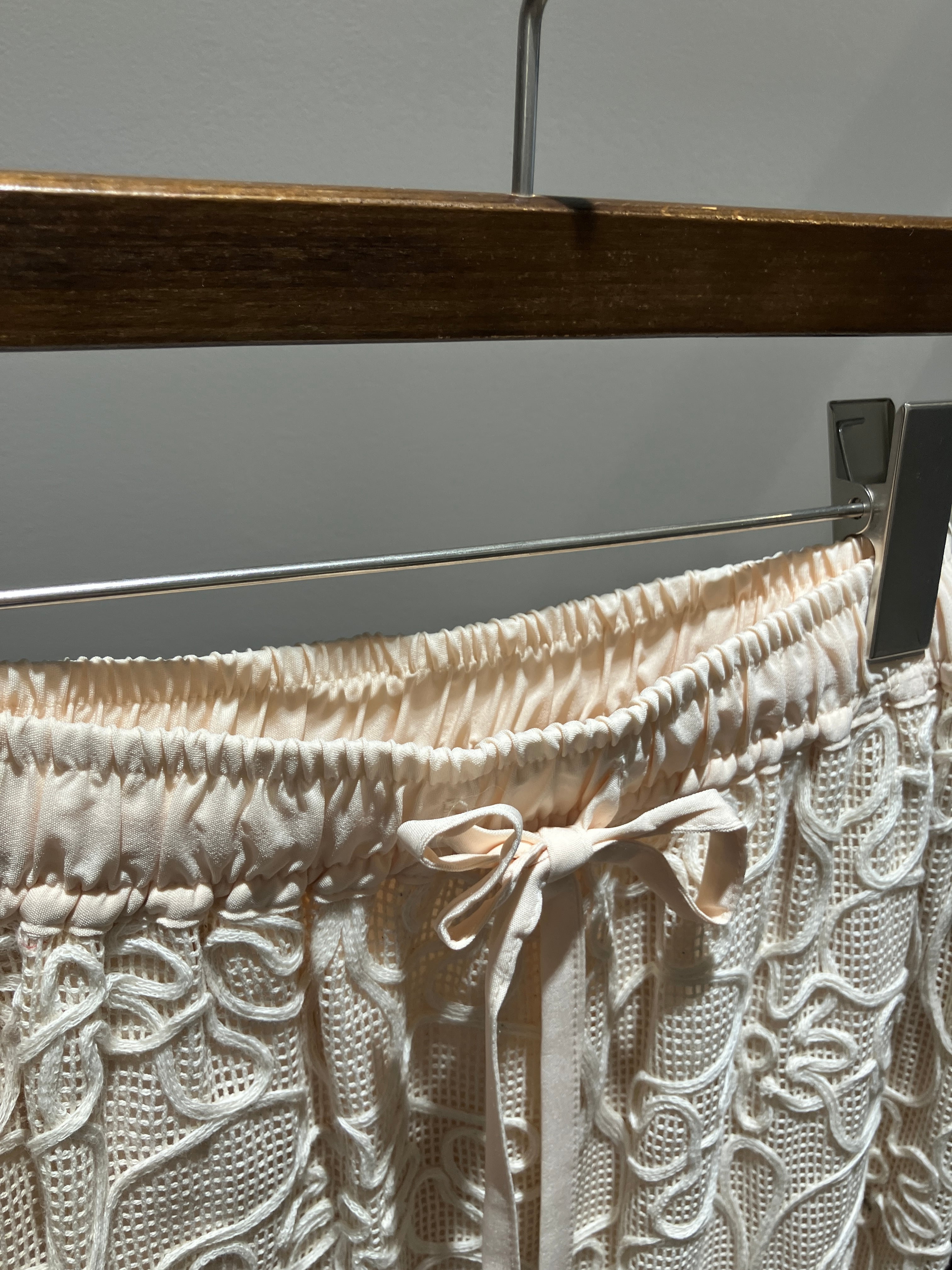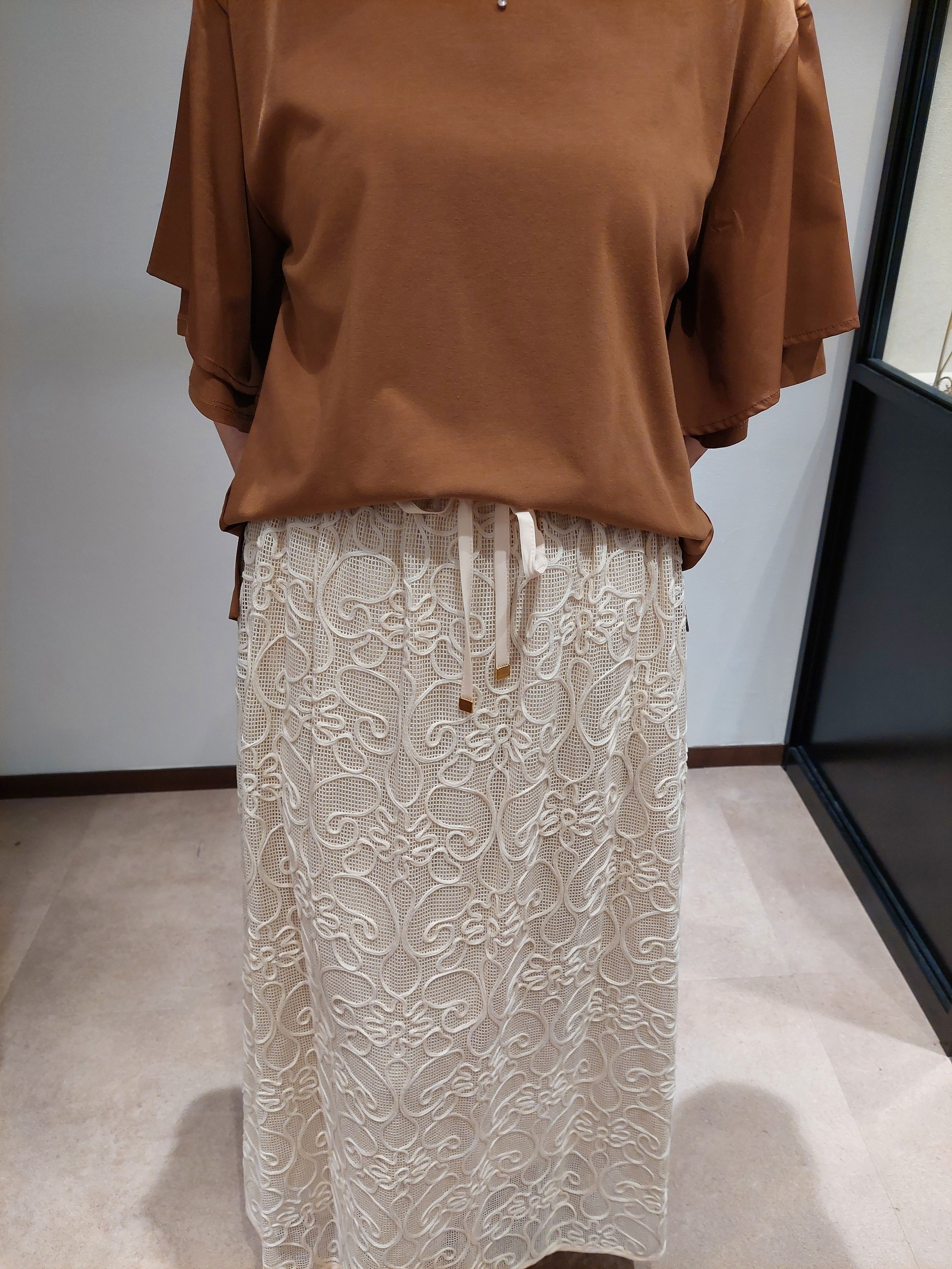 繊細な刺繍に太めの糸を添わせ、浮かび上がるような表情に仕上げた「コードレーススカート」。一般的なレースよりも厚みがあり、立体的なコードレースが織りなす陰影が、コーディネートに高級感と奥行きをもたらします。美しい総レースの佇まいながら、ウエストはゴム仕様&紐付きのデザインを採用。きちんと見えを叶えつつ、自分の体型に合わせてフィット感を調整できる、ストレスフリーな履き心地が魅力です。裏地とのコントラストで生まれる裾の透け感が、足元を軽やかに演出。カジュアルなロゴTシャツで崩しても、きれいめブラウスで上品にまとめてもサマになる、着回し力の高い主役級の一着です。