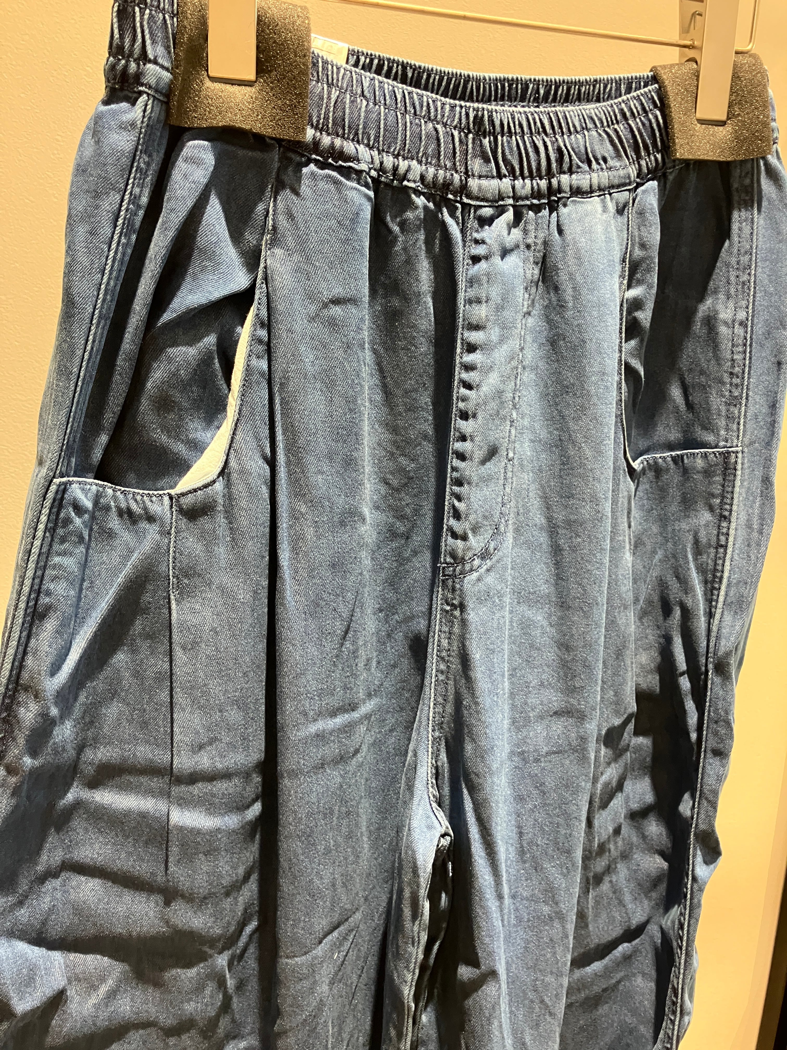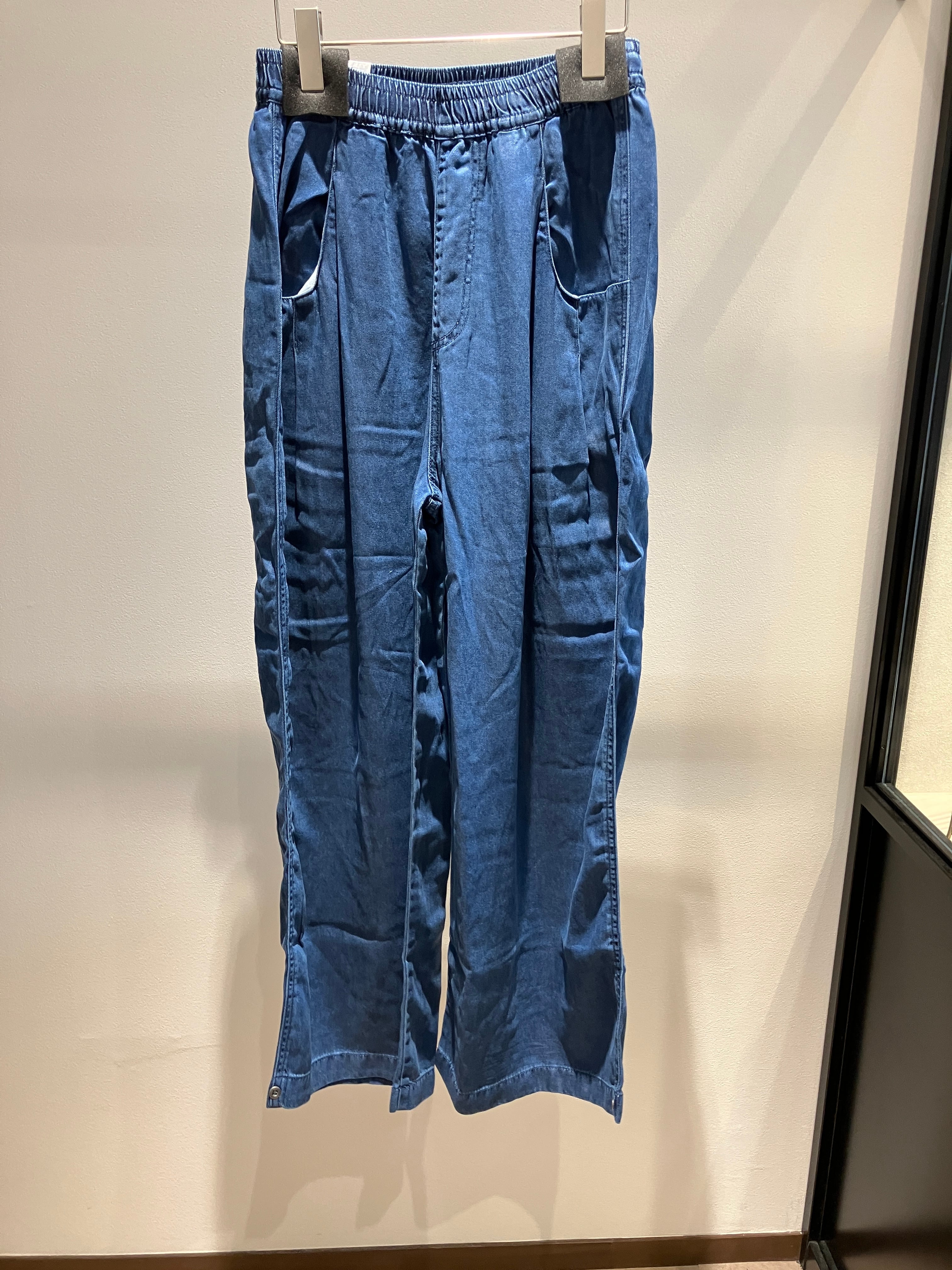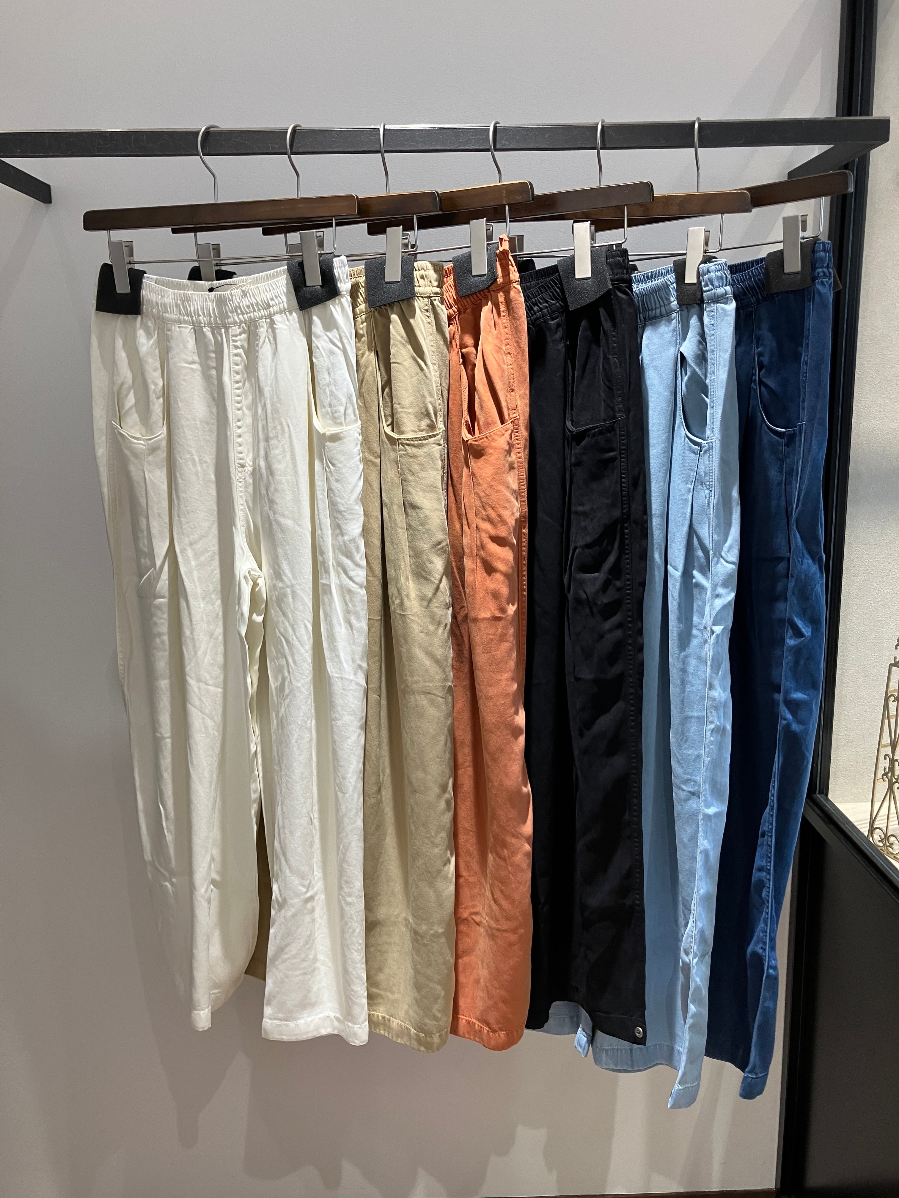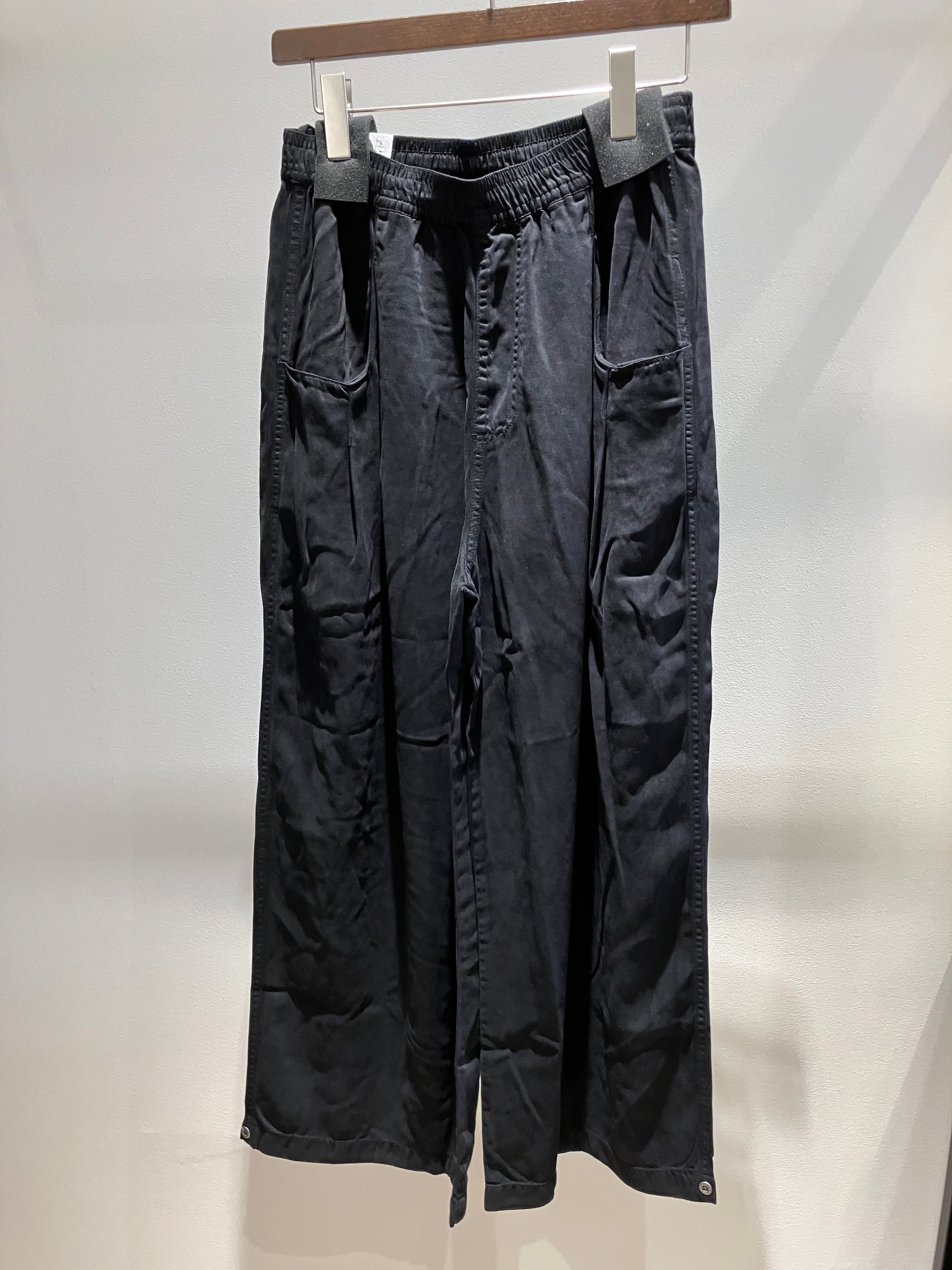 素材には、滑らかな落ち感とほのかな光沢が魅力のテンセルツイルを採用。肌触りが良く、身体の動きに合わせてしなやかに馴染むため、一日中快適に過ごせます。ウエストは総ゴム&紐仕様で、ストレスフリーな穿き心地を実現。そして最大のポイントは、裾幅をボタンで調整可能なディテールです。そのまま穿けばワイドシルエットに、ボタンを留めればテーパードシルエットに、とその日の気分やシューズに合わせて、2通りのシルエットを楽しめます。デイリーから旅行まで、幅広いシーンで活躍する頼れる一本です。