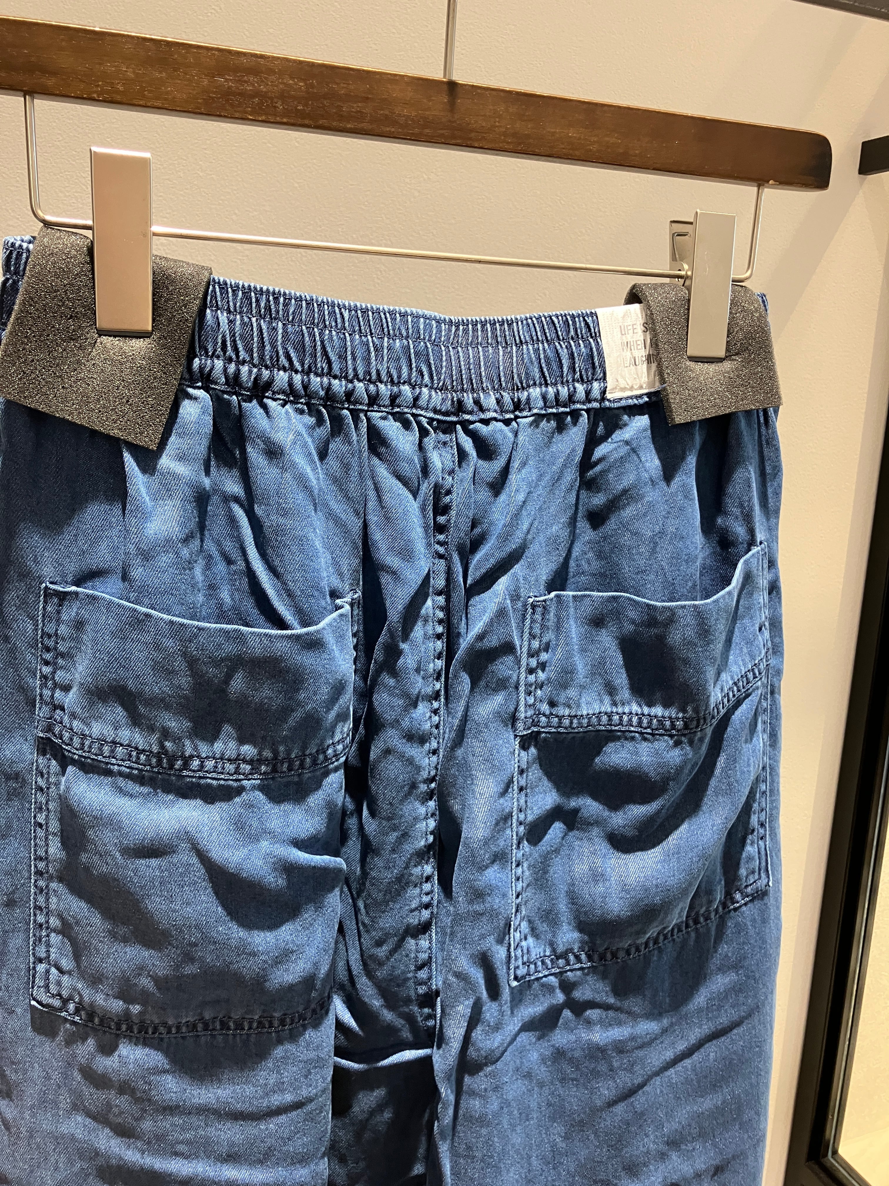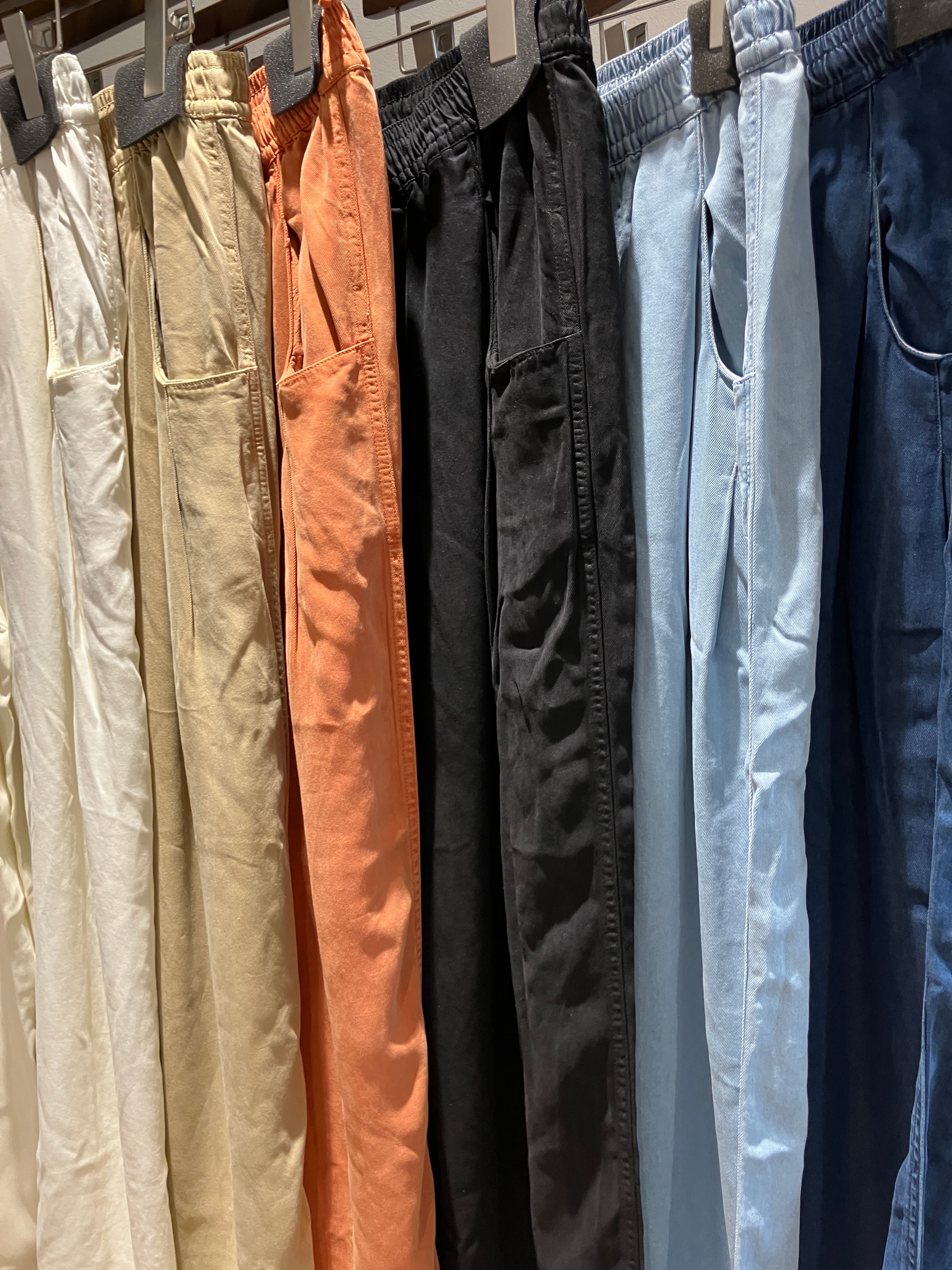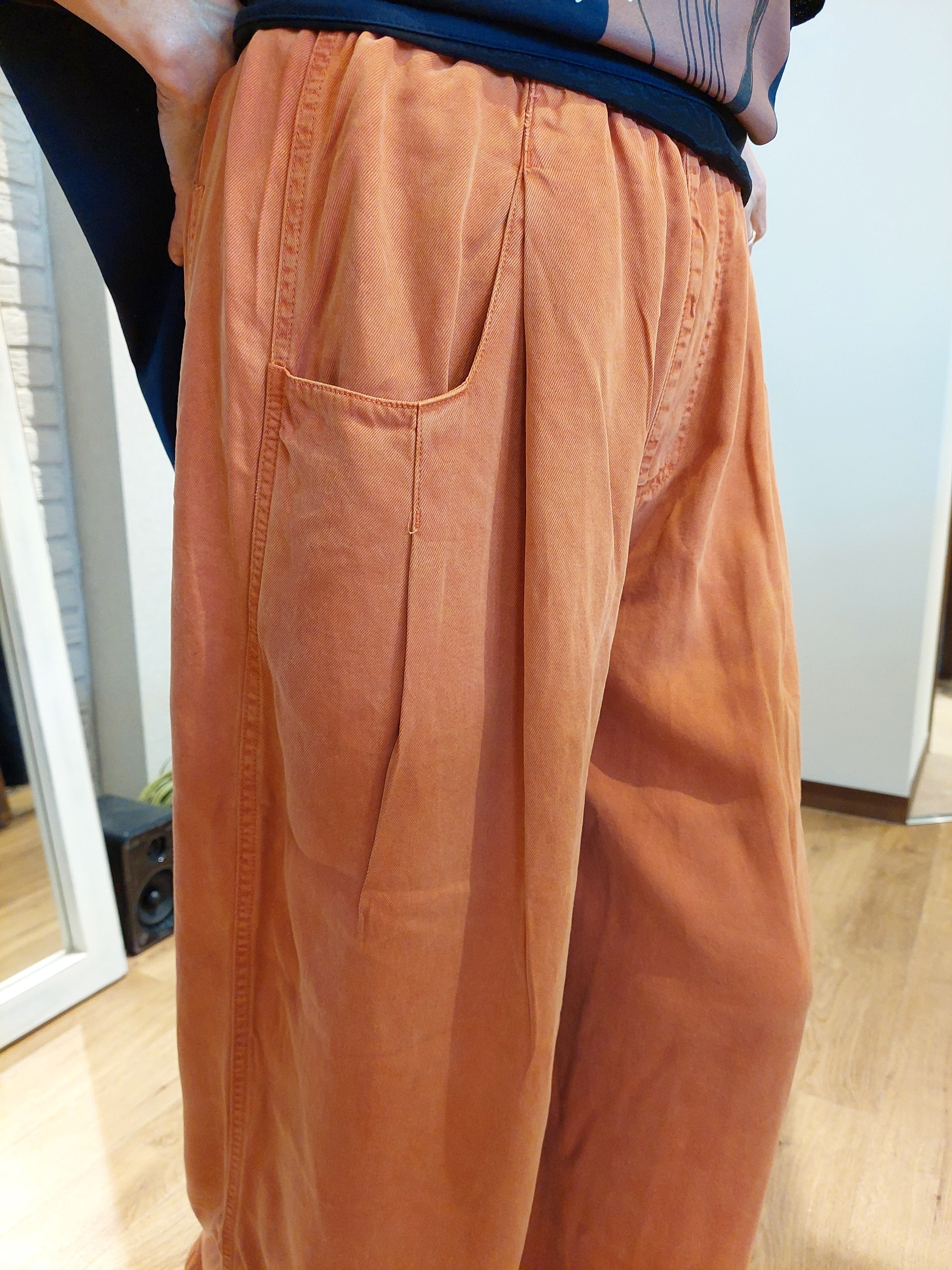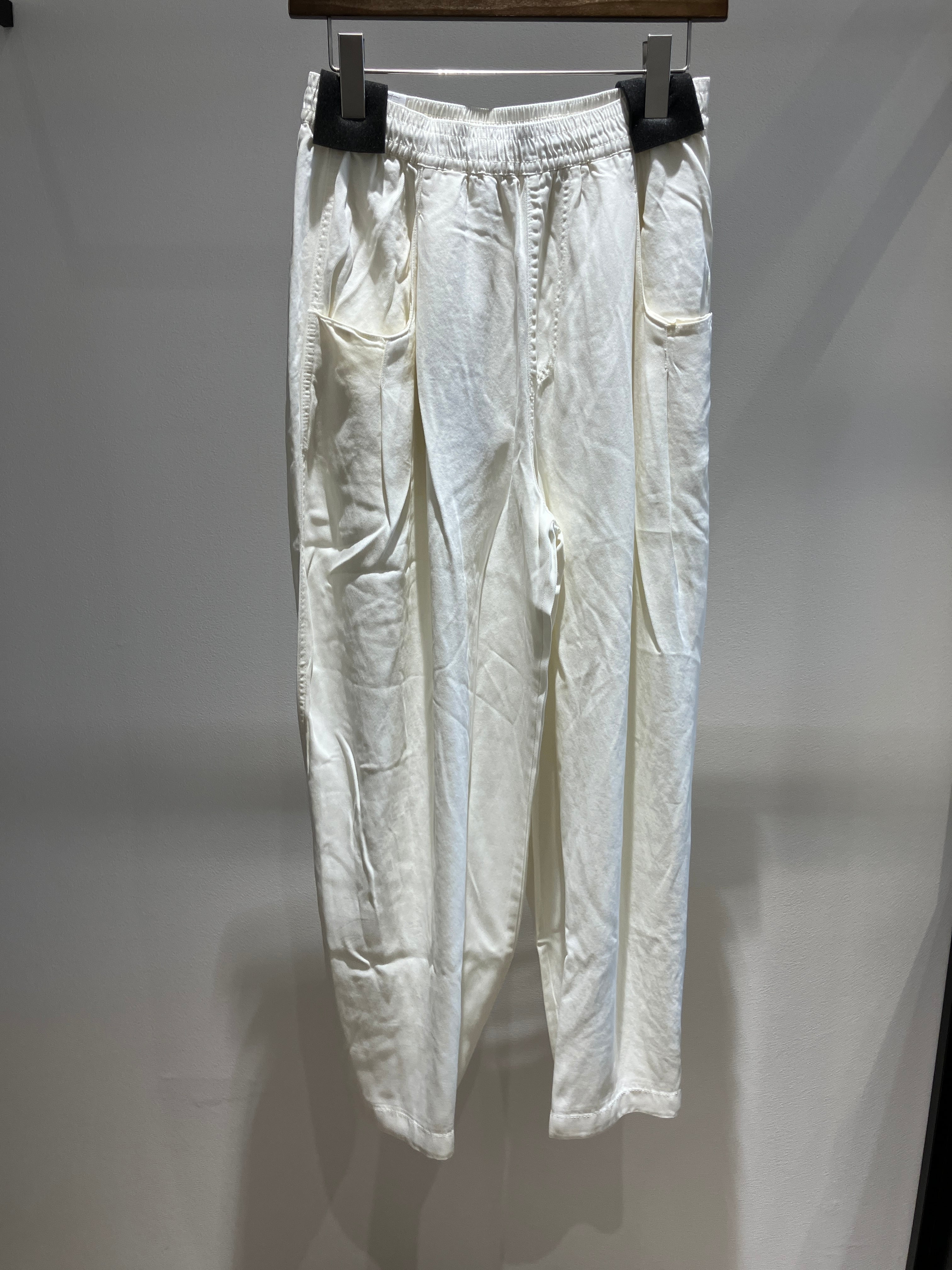 素材には、滑らかな落ち感とほのかな光沢が魅力のテンセルツイルを採用。肌触りが良く、身体の動きに合わせてしなやかに馴染むため、一日中快適に過ごせます。ウエストは総ゴム&紐仕様で、ストレスフリーな穿き心地を実現。そして最大のポイントは、裾幅をボタンで調整可能なディテールです。そのまま穿けばワイドシルエットに、ボタンを留めればテーパードシルエットに、とその日の気分やシューズに合わせて、2通りのシルエットを楽しめます。デイリーから旅行まで、幅広いシーンで活躍する頼れる一本です。